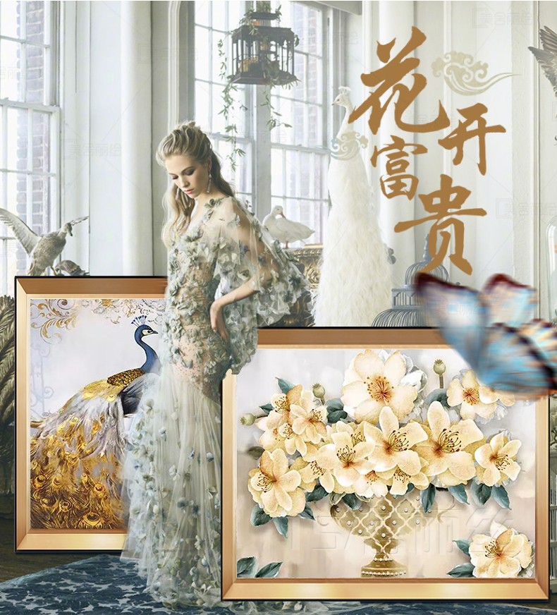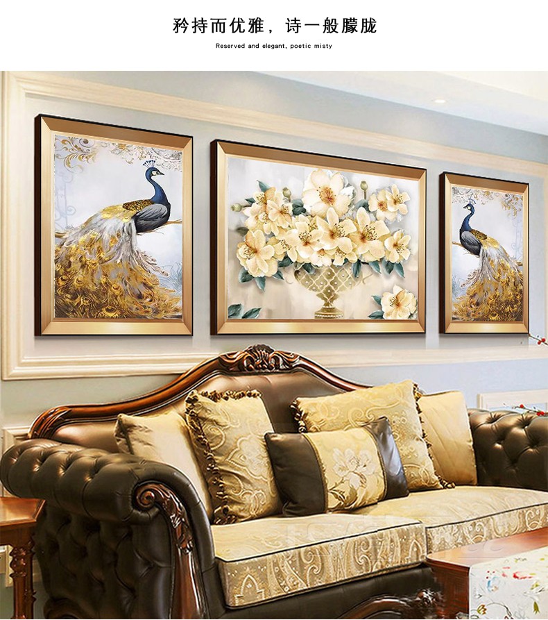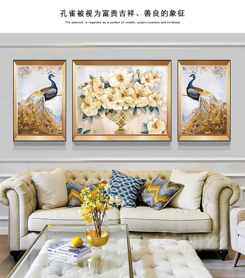 十字繡線繡2019新款歐式孔雀三聯畫全繡棉線精準印花客廳花卉刺繡1入