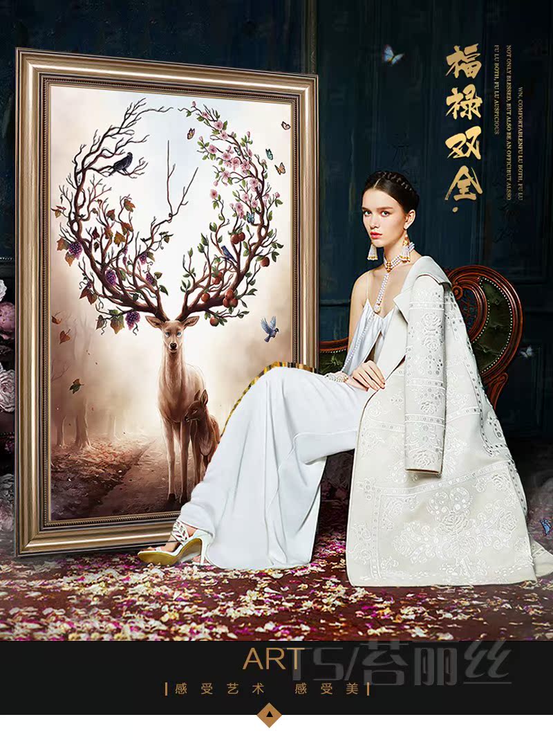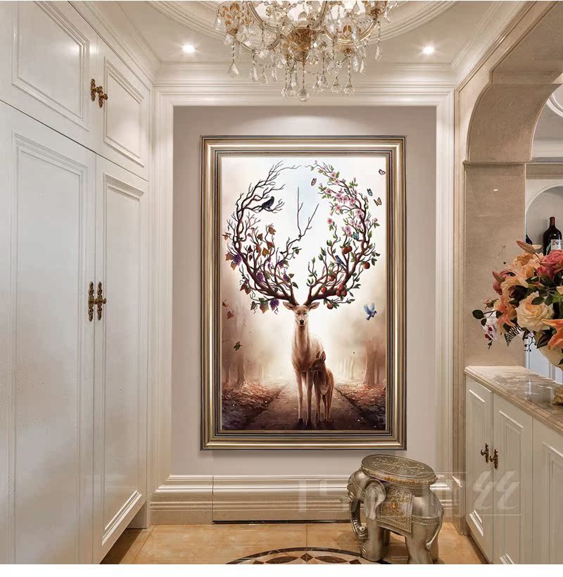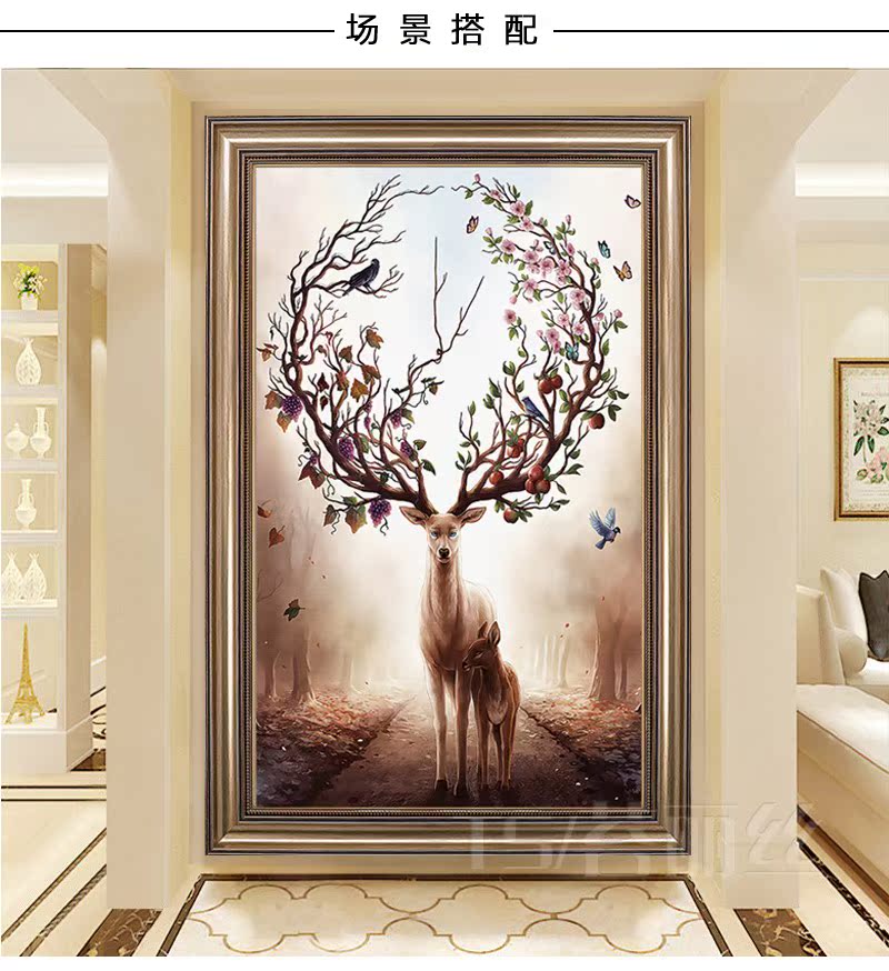 大氣歐式玄關貼鉆十字繡客廳豎版玄關發財鹿鉆石繡滿鉆現代磚石畫1入