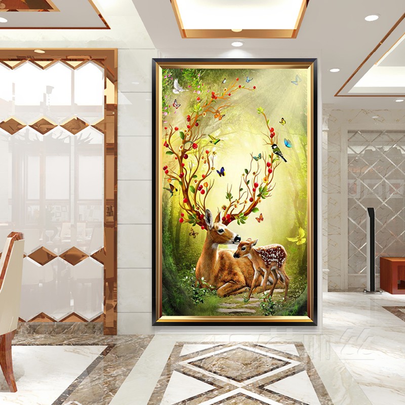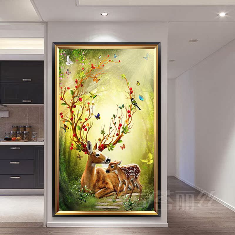 新款2018十字繡發財鹿客廳歐式玄關豎版全繡棉線母子麋鹿印花刺繡1入