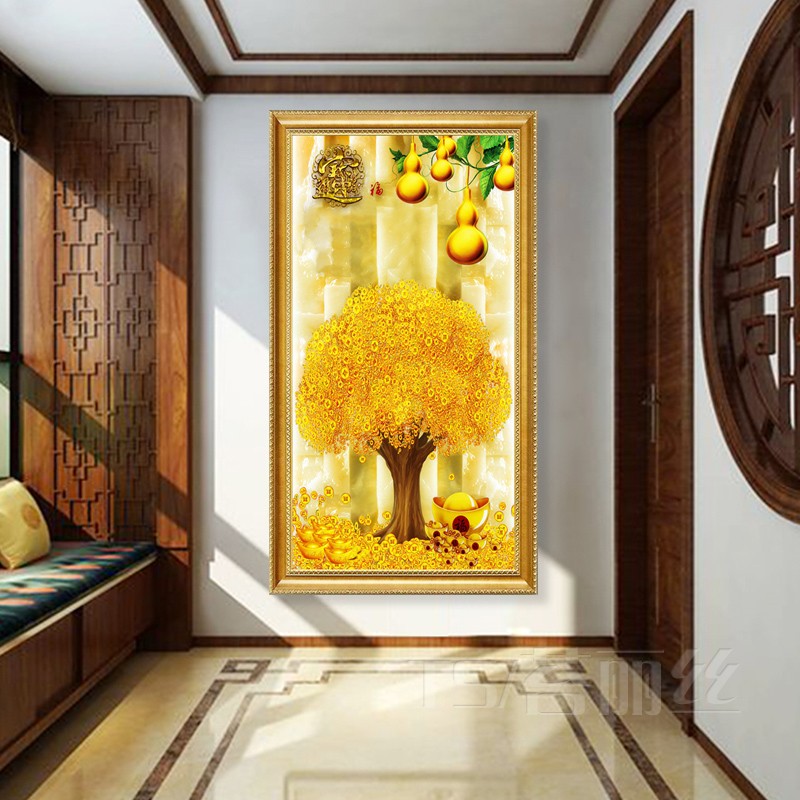 搖錢樹十字繡招財進寶玄關豎版走廊過道新款線繡現代客廳滿繡刺繡1入