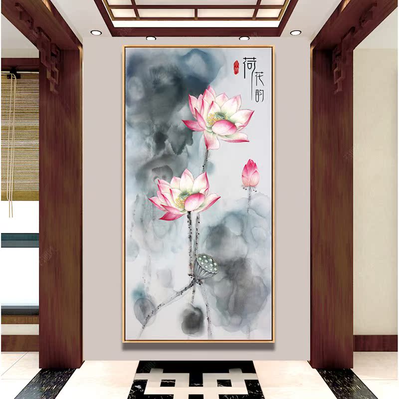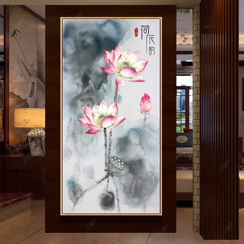 中國風水墨荷花雅韻玄關鉆石畫豎版滿鉆新款禪意客廳鉆石繡點鉆畫1入