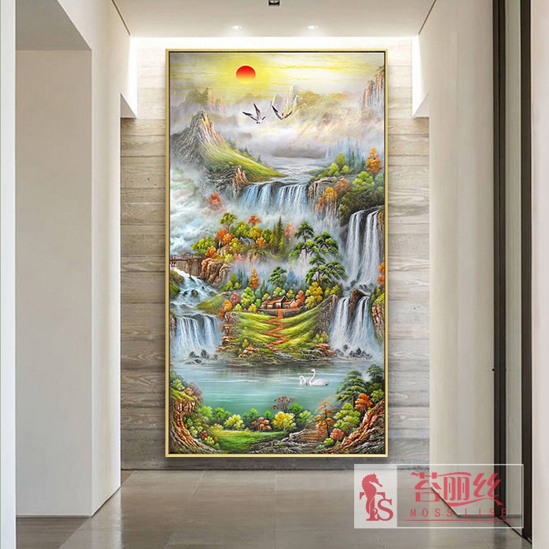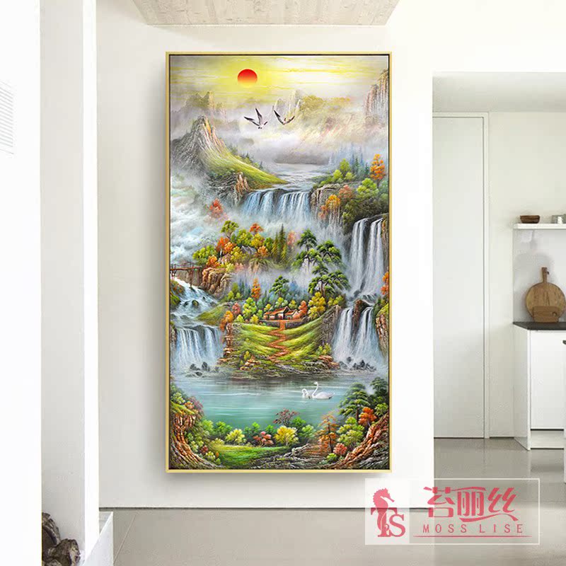 新款鉆石十字繡滿鉆客廳豎版旭日東升聚寶盆鉆石畫玄關走廊山水畫1入