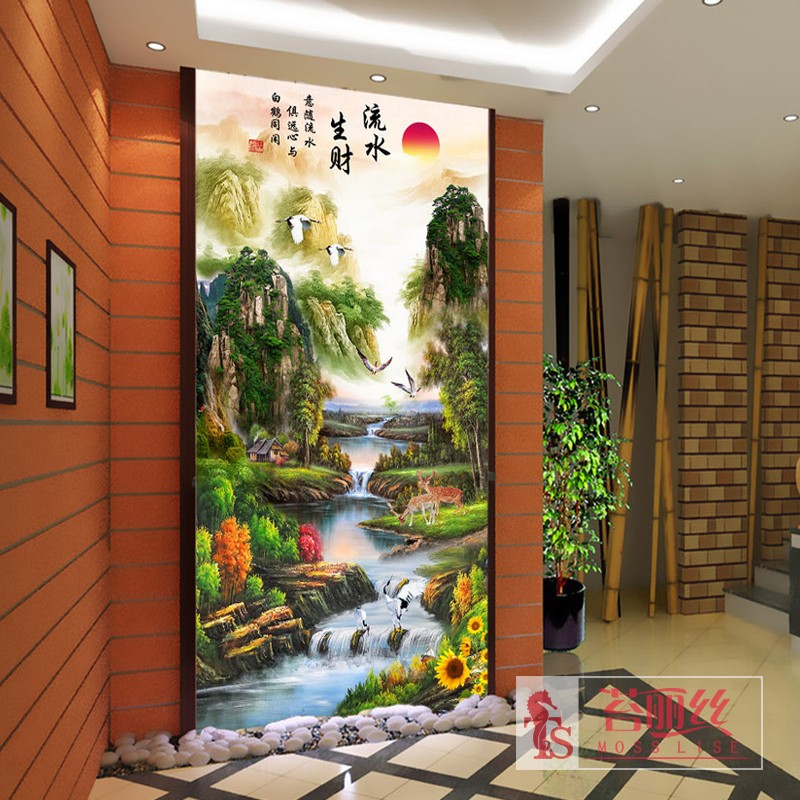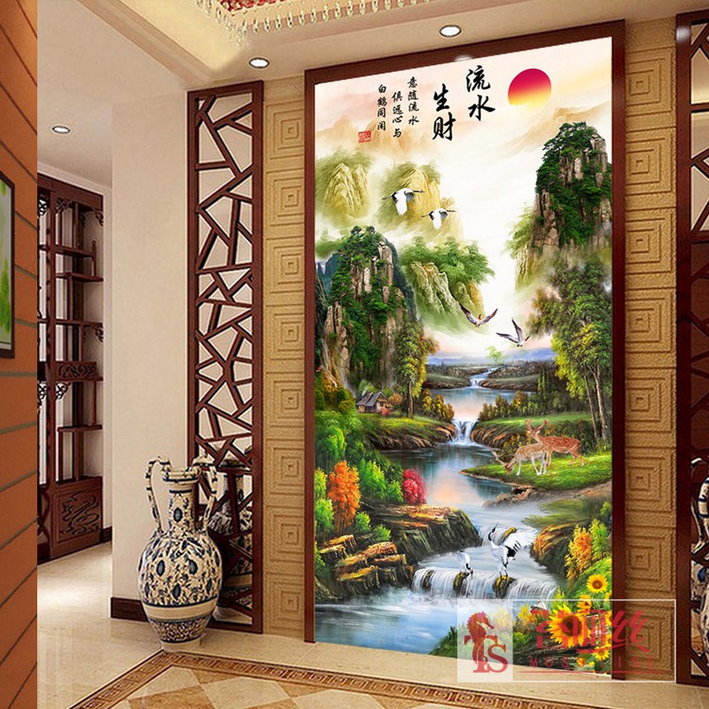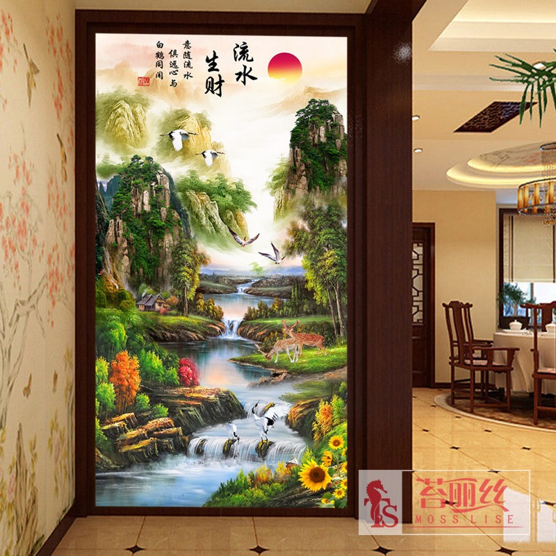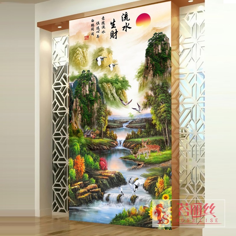 2018新款鉆石繡流水生財滿鉆客廳豎版山水風景現代簡約玄關點鉆畫1入