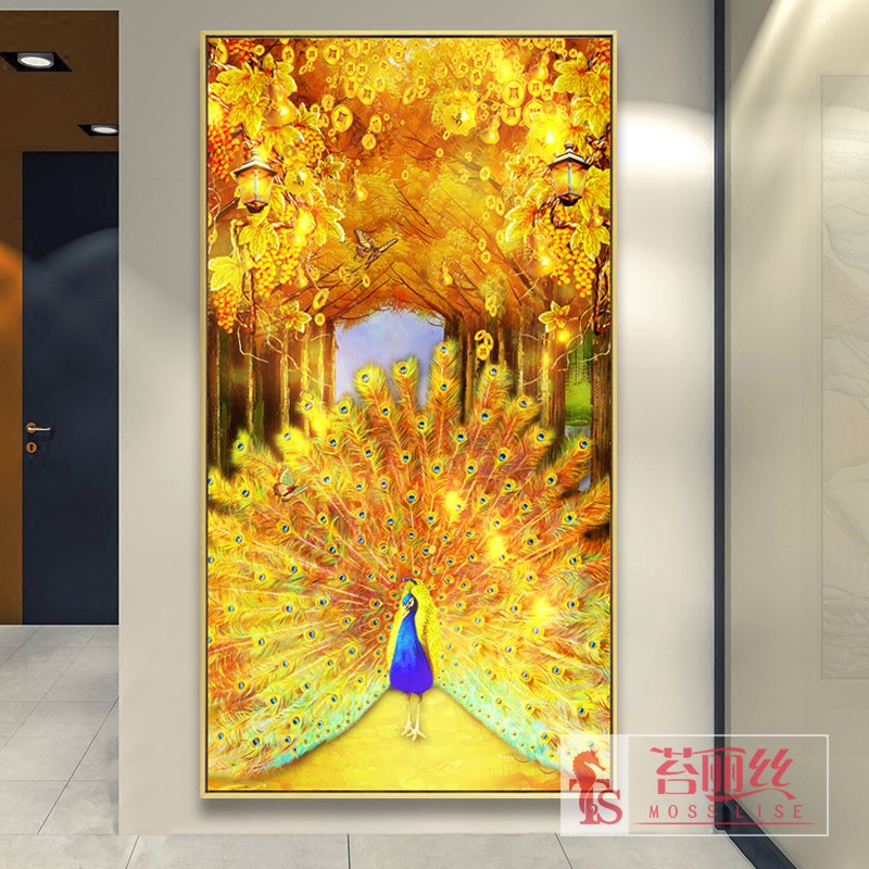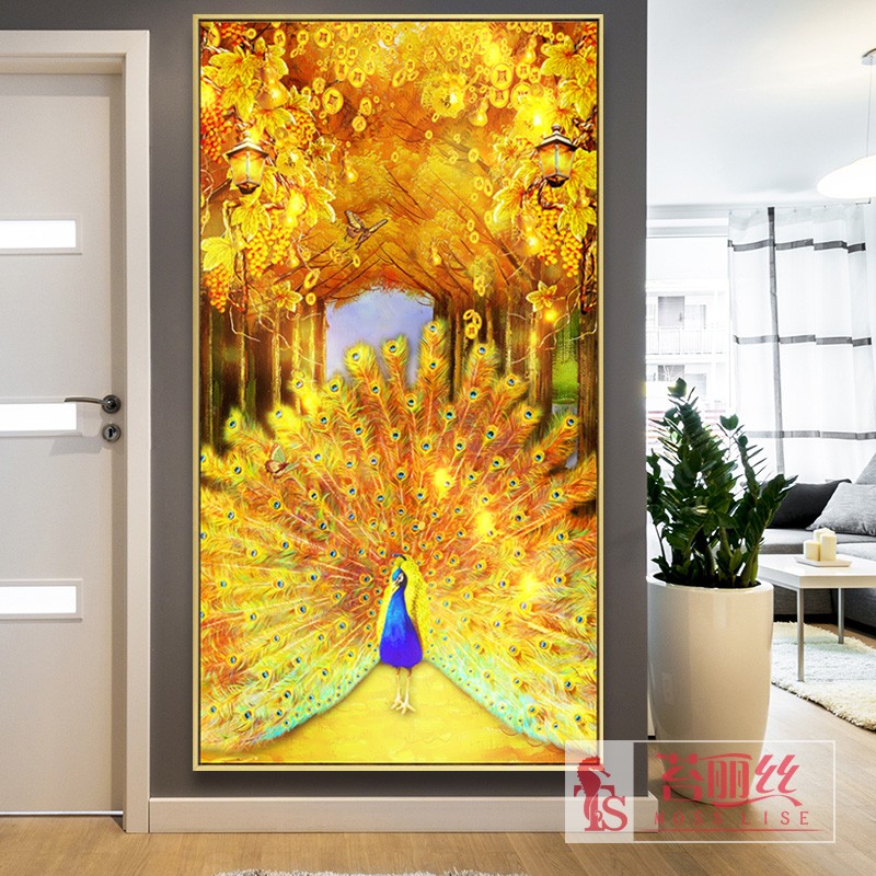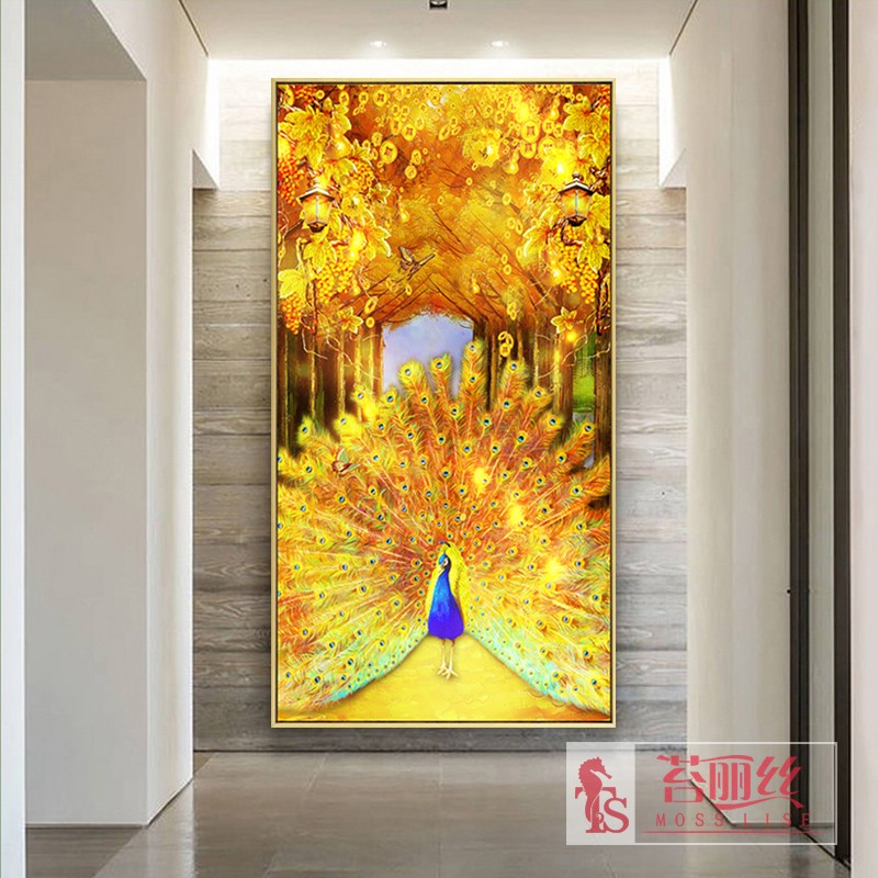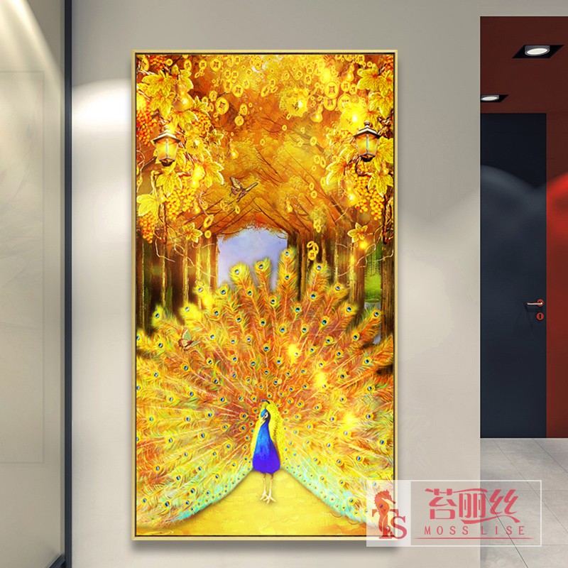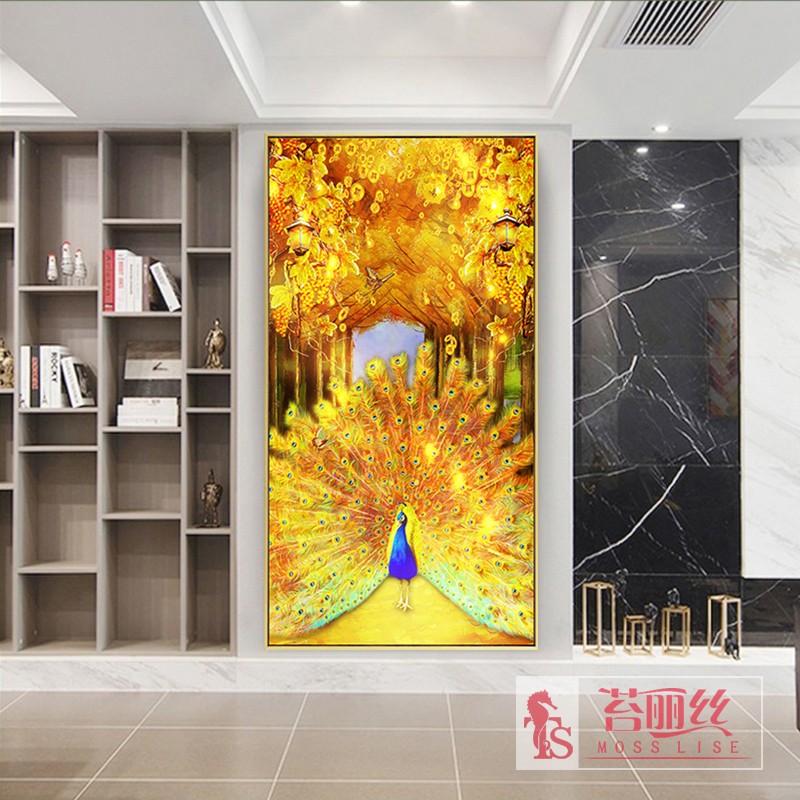 5d新款鉆石畫客廳滿鉆孔雀開屏鉆石秀豎版玄關黃金滿地粘鉆十字繡1入
