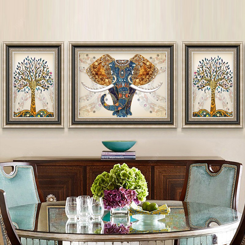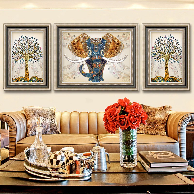 客廳鉆石畫滿鉆新款5d歐式三聯吉祥大象發財樹鑲鉆十字繡點圓鉆畫1入