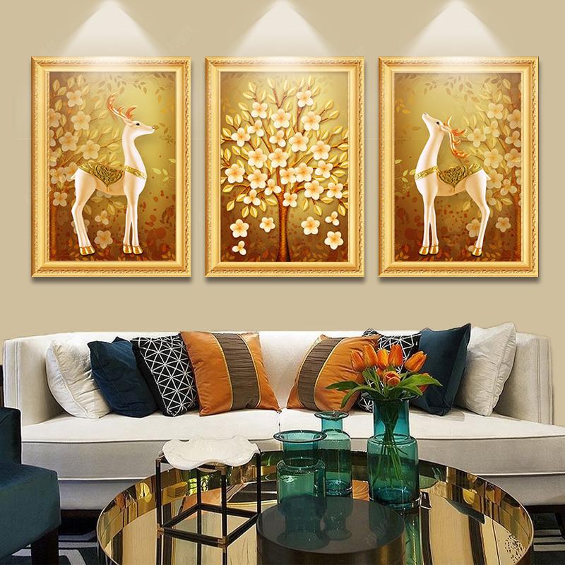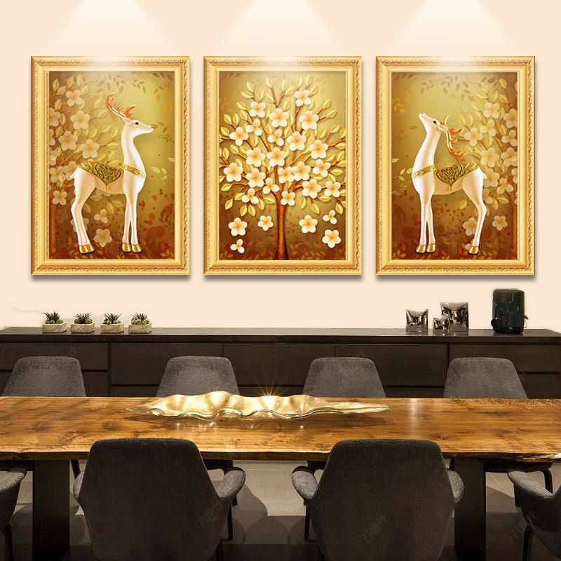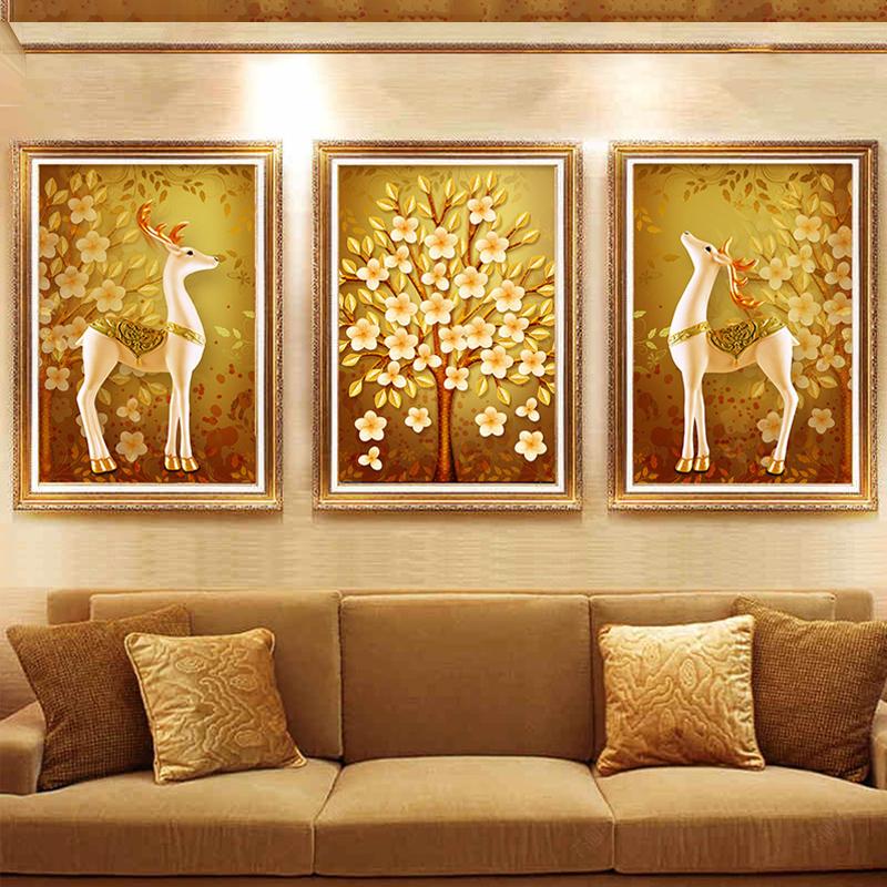 新款鉆石繡十字繡金色發財樹福鹿三聯鉆石畫客廳滿鉆5D圓鉆磚石繡1入