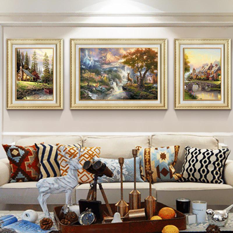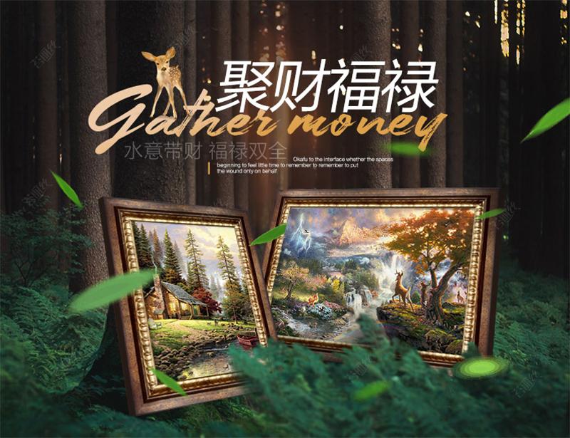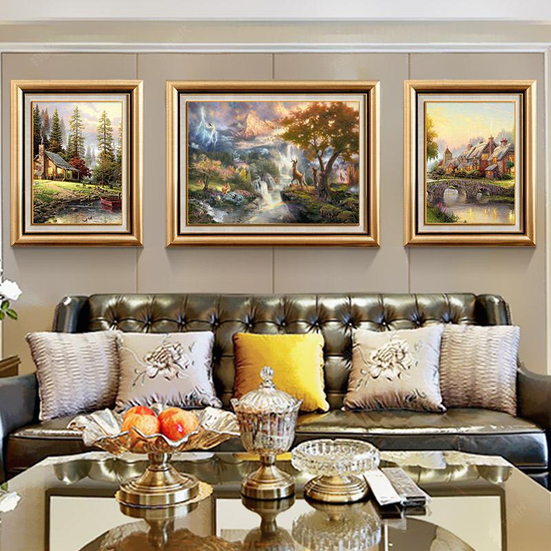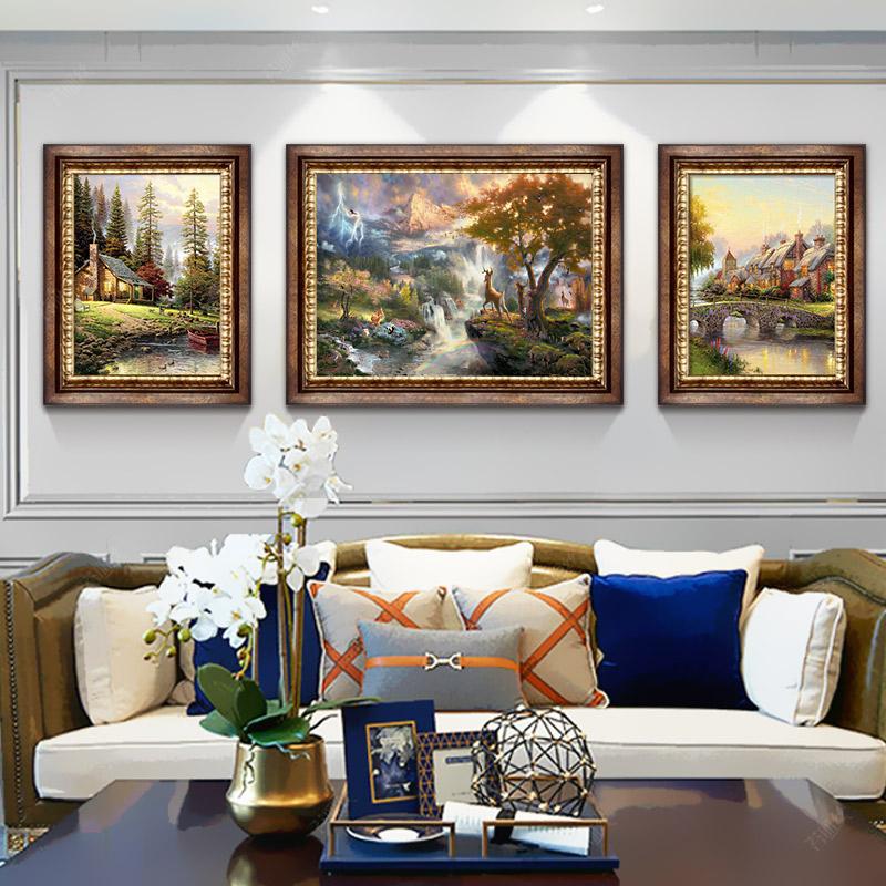 5D磚石秀十字繡鉆石畫客廳歐式招財麋鹿山水風景鉆石繡三聯畫滿鉆1入