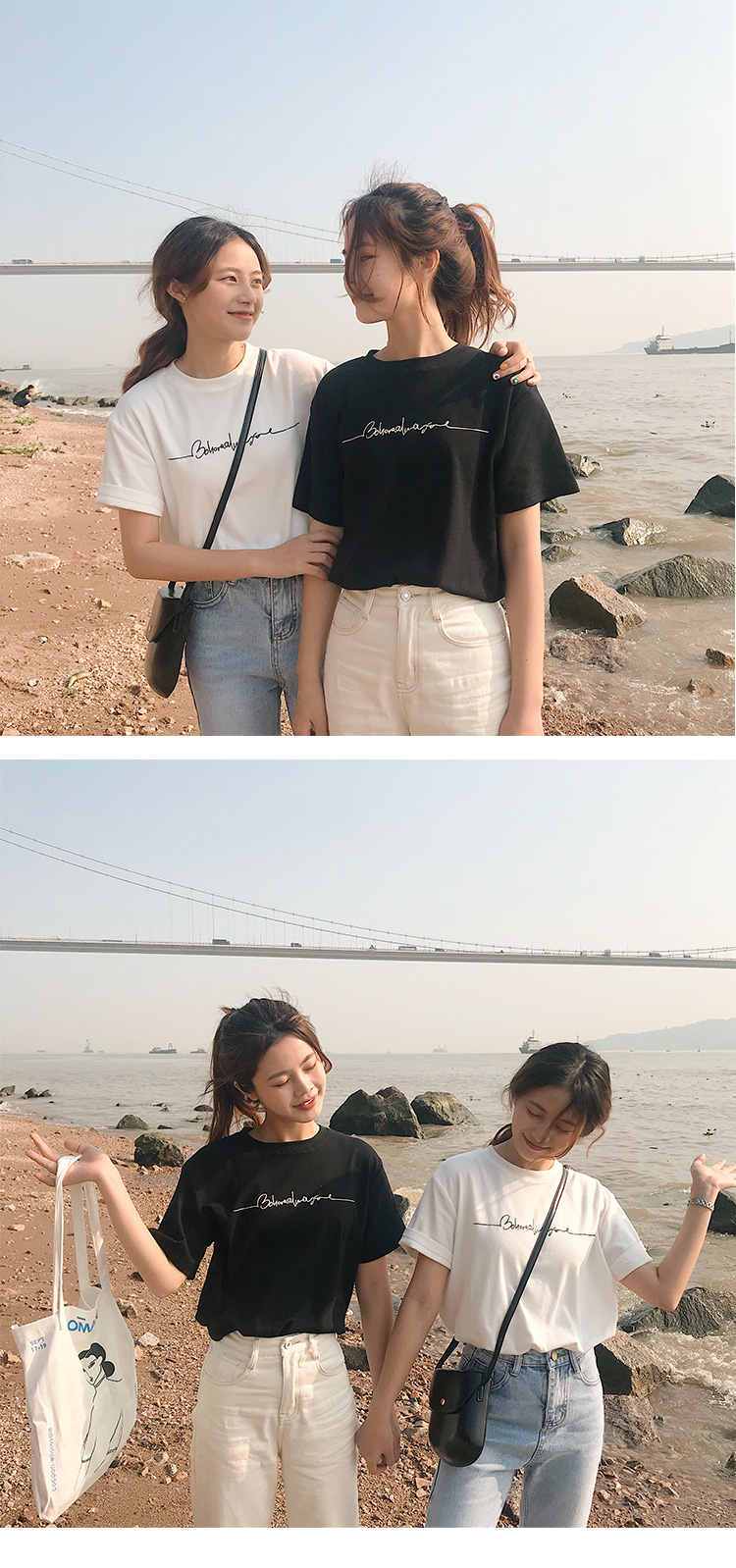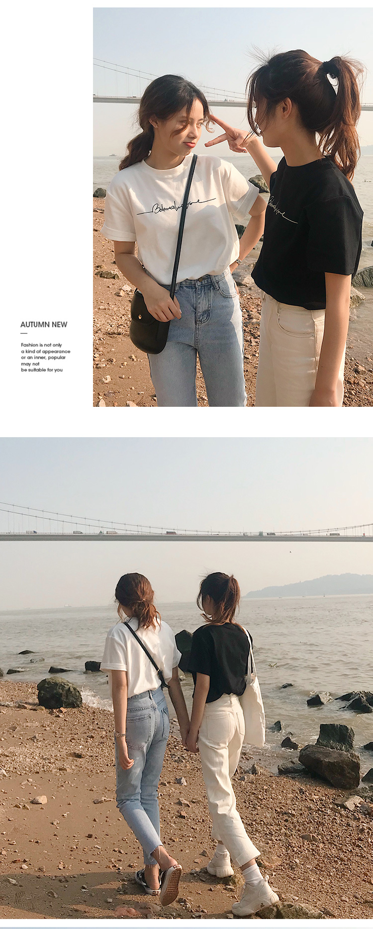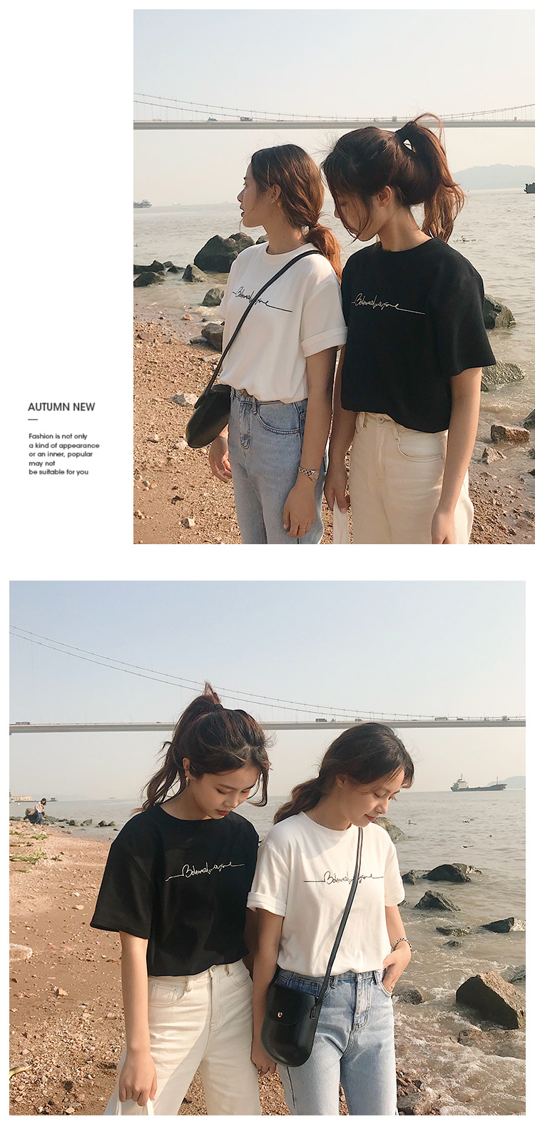 虎牙犬牙 2019夏裝新款韓版寬松顯瘦百搭字母印花黑白色短袖t恤女1入
