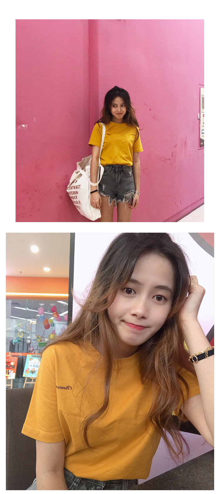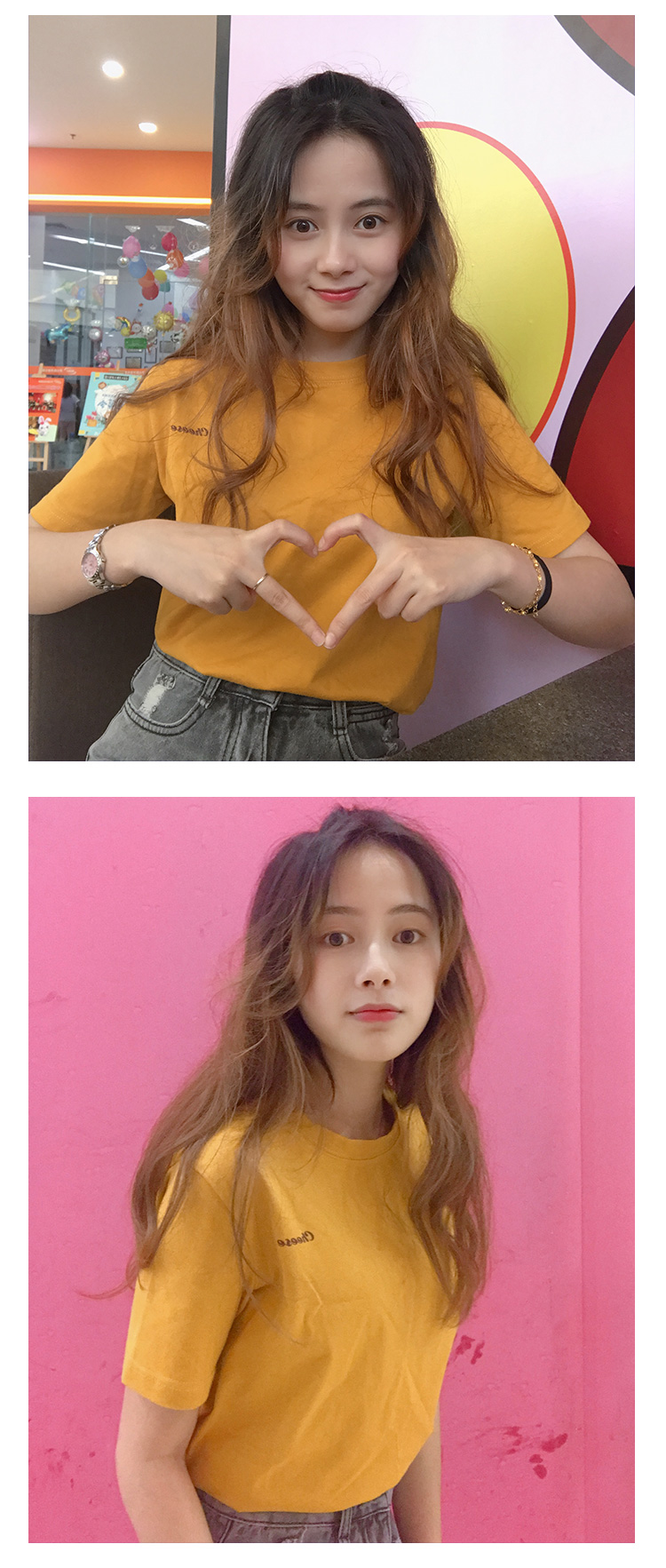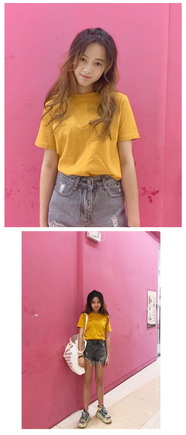 這款T恤顏色有點偏姜黃色的,顯白襯膚色。白皮、黃皮、稍微有點黑的。都可以穿哦!