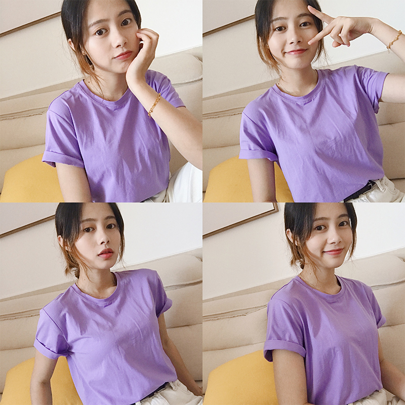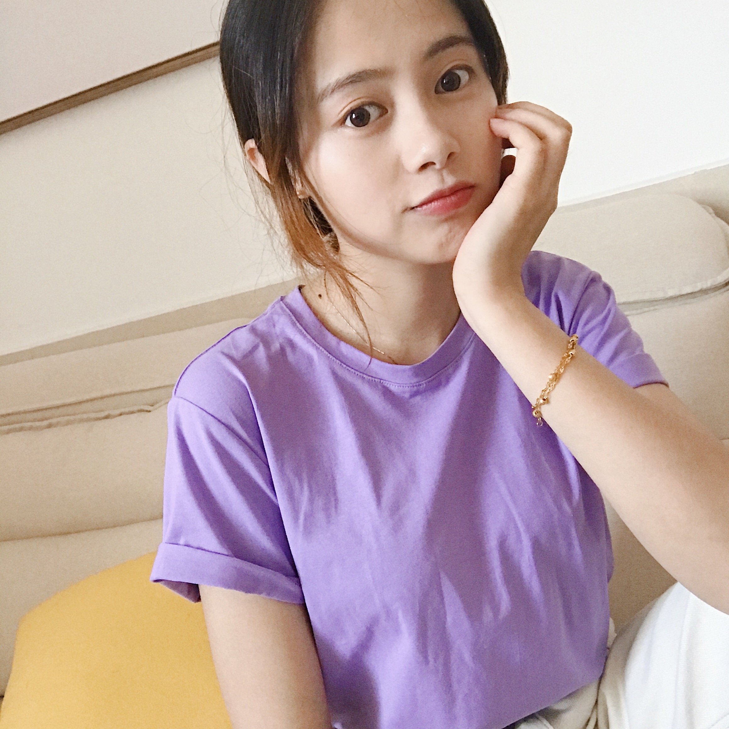 虎牙犬牙 短袖女2019新款韓版寬松溫柔香芋紫基礎款t恤純色百搭T1入