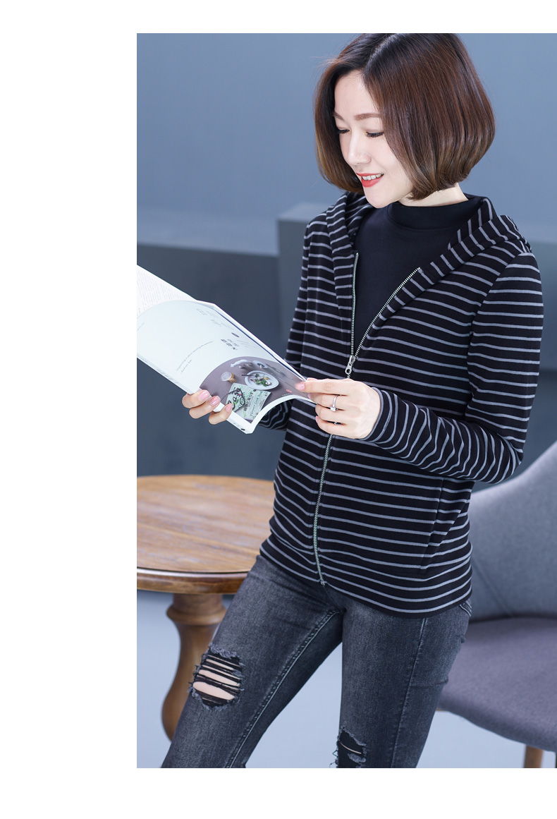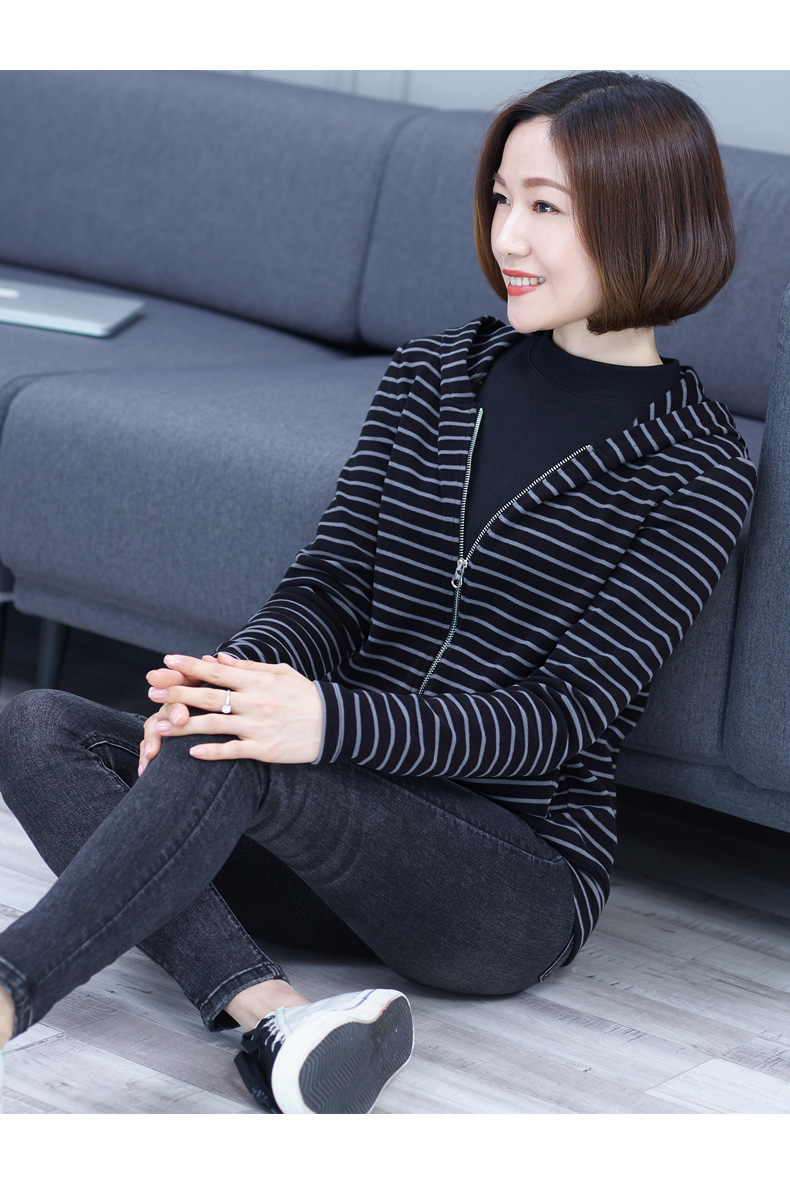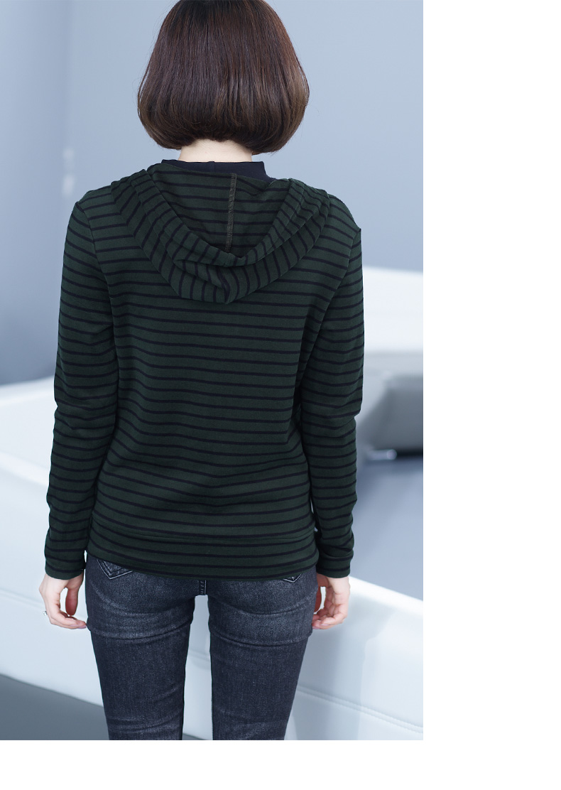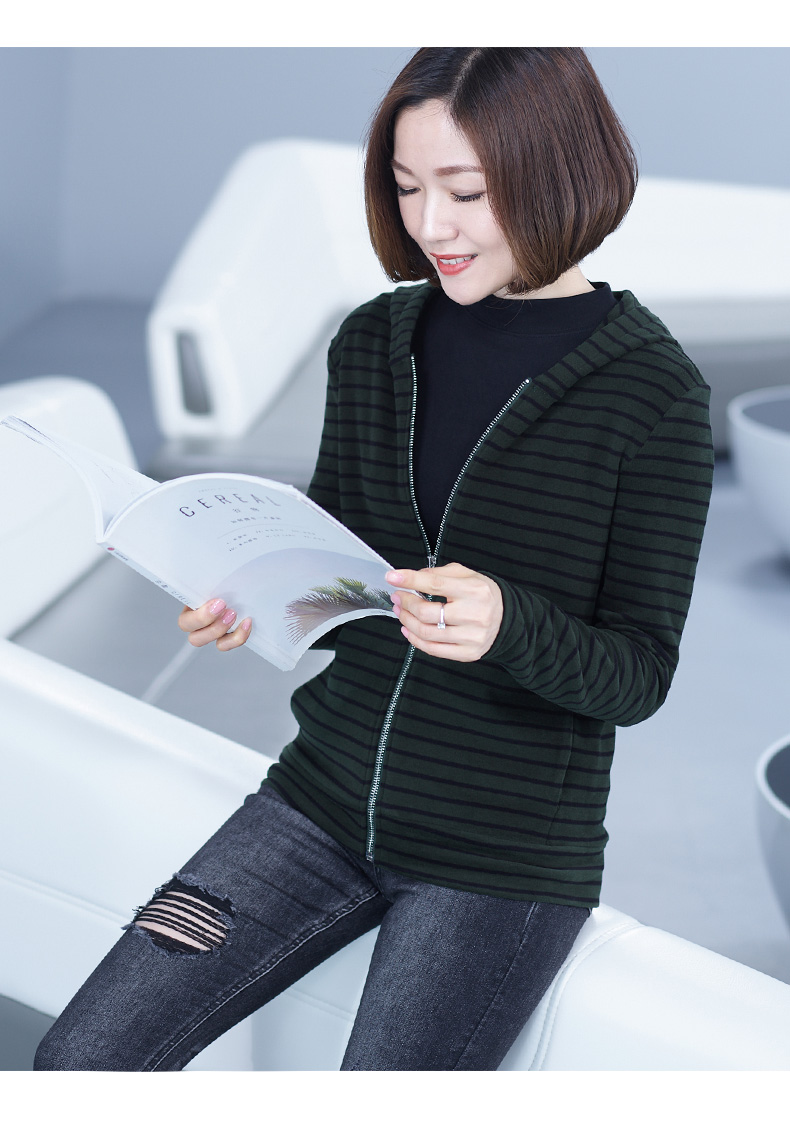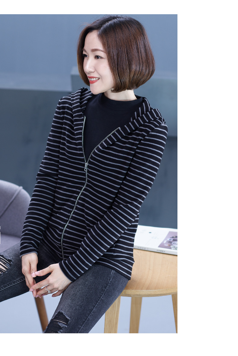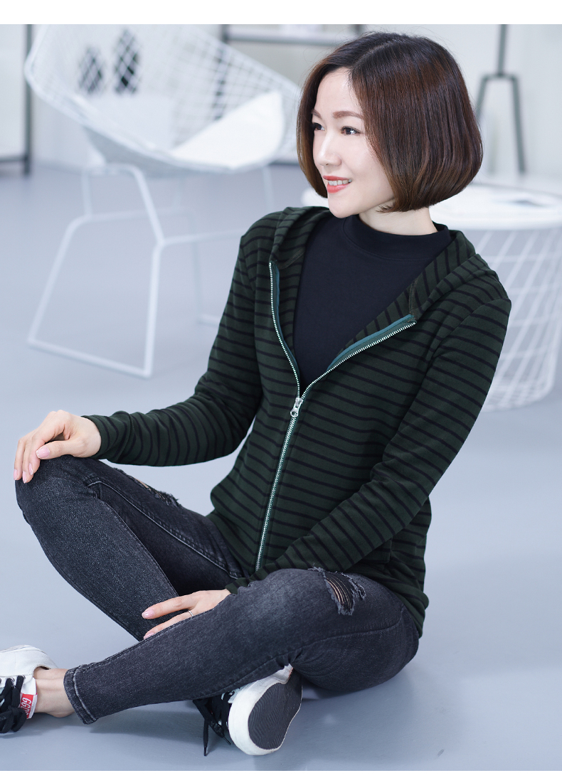 2019秋冬新款條紋長袖大碼帽衫薄絨拉鏈外套連帽加厚上衣帶帽女裝1入