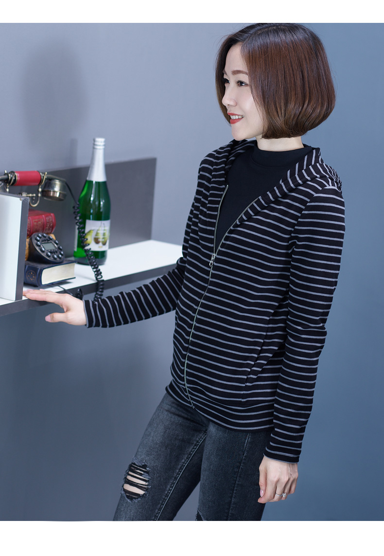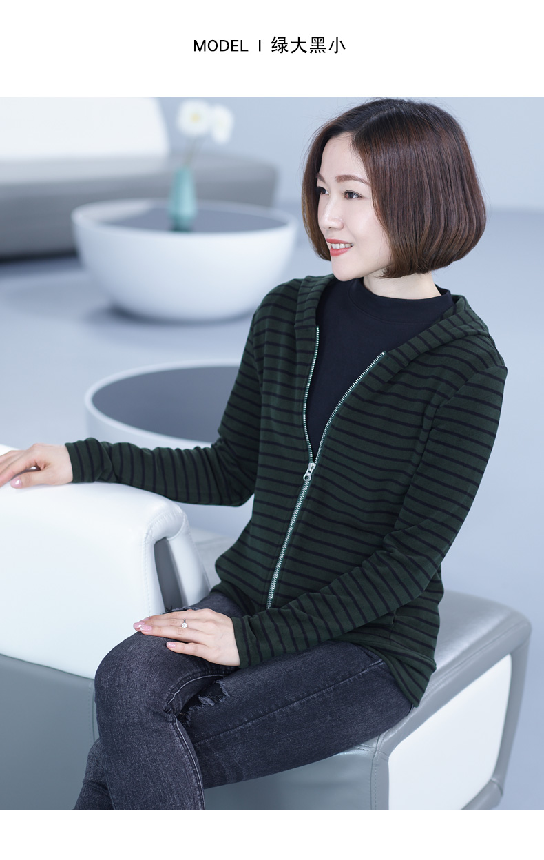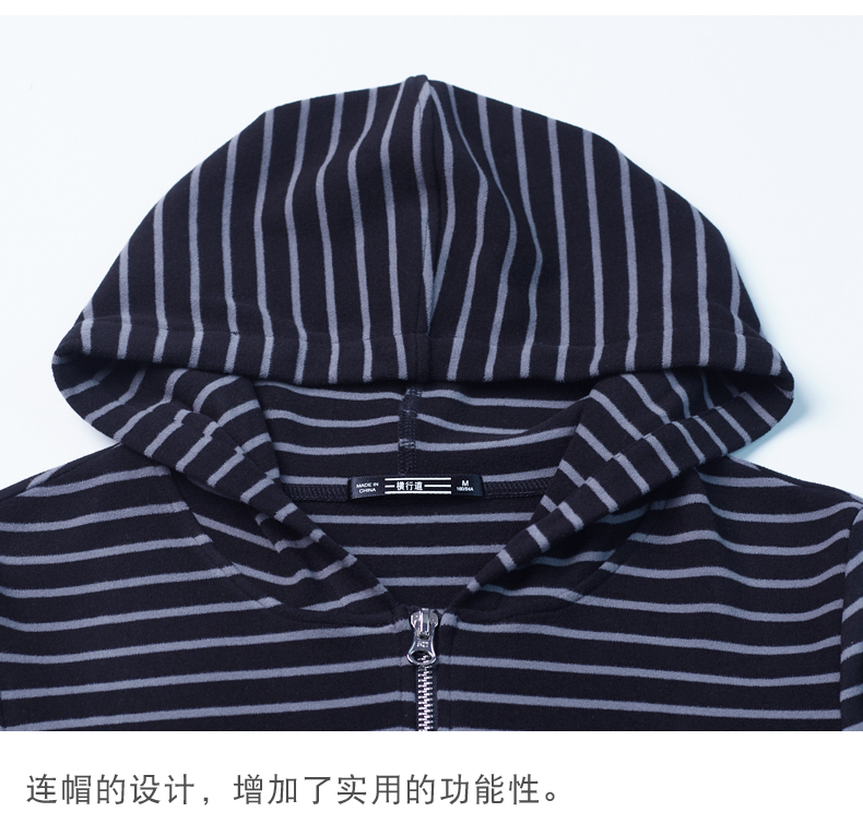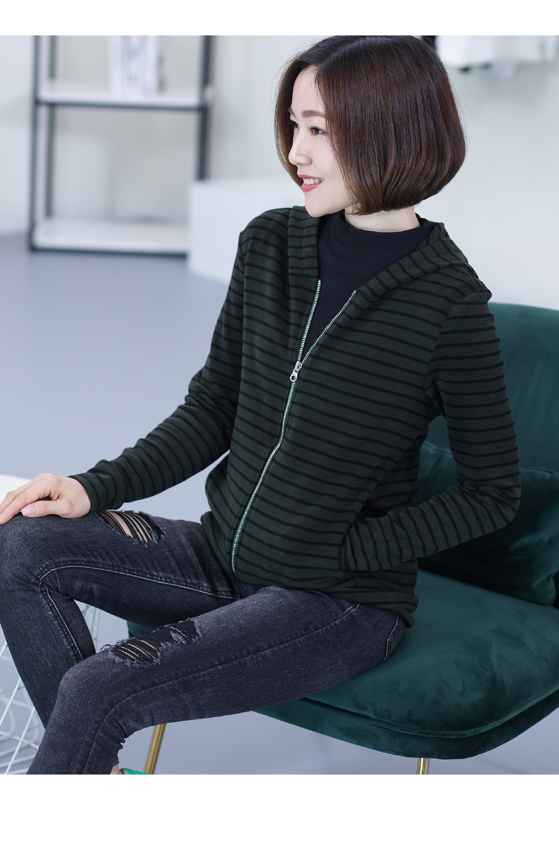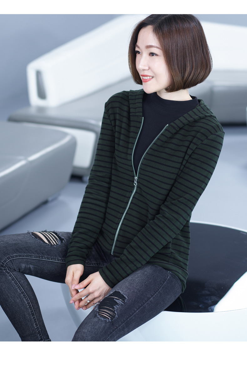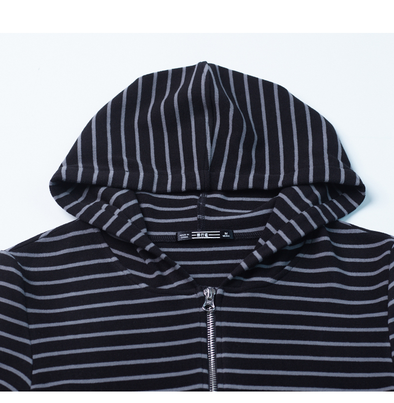 2019秋冬新款條紋長袖大碼帽衫薄絨拉鏈外套連帽加厚上衣帶帽女裝1入