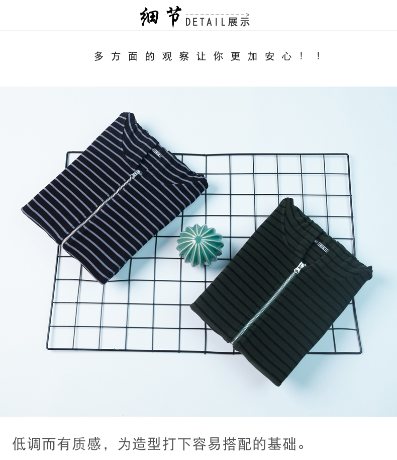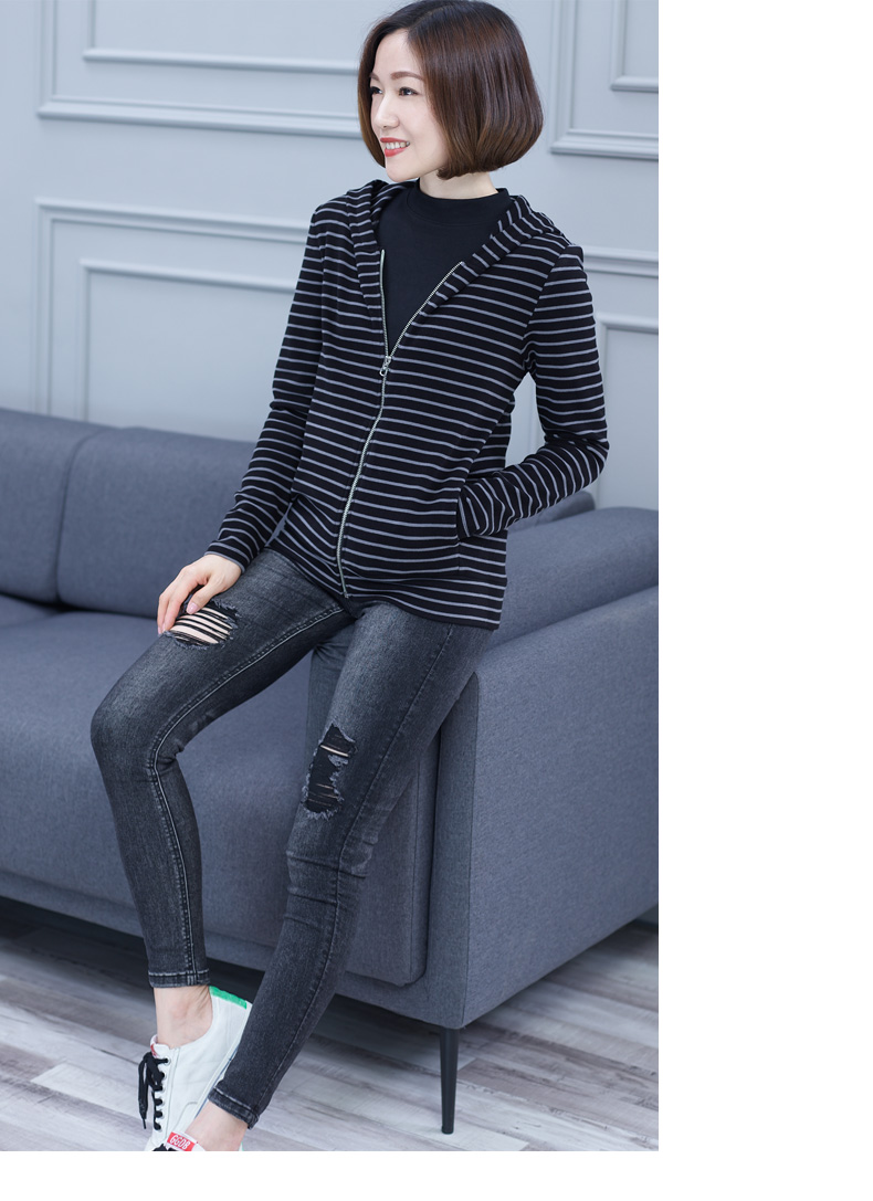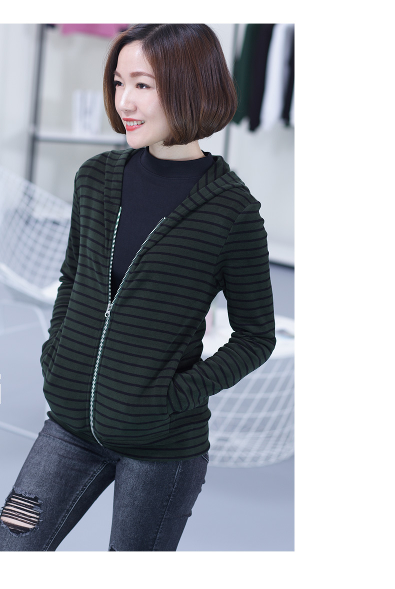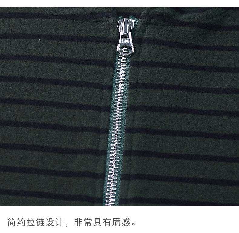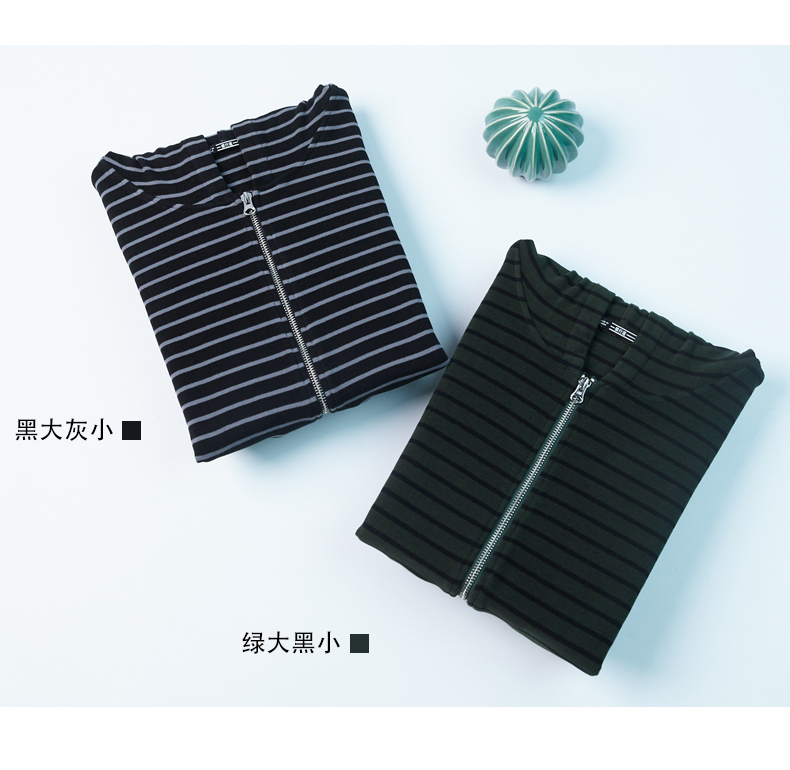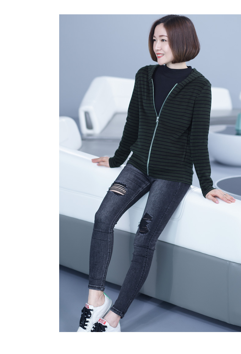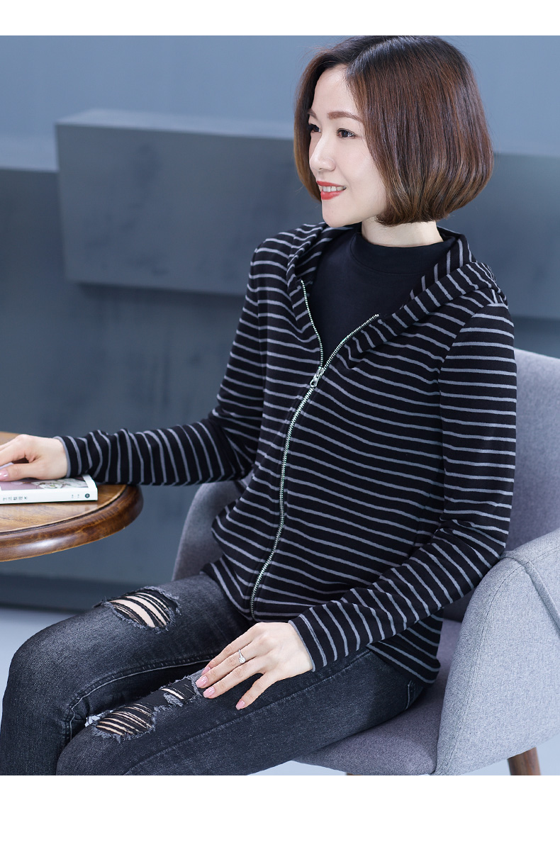2019秋冬新款條紋長袖大碼帽衫薄絨拉鏈外套連帽加厚上衣帶帽女裝1入