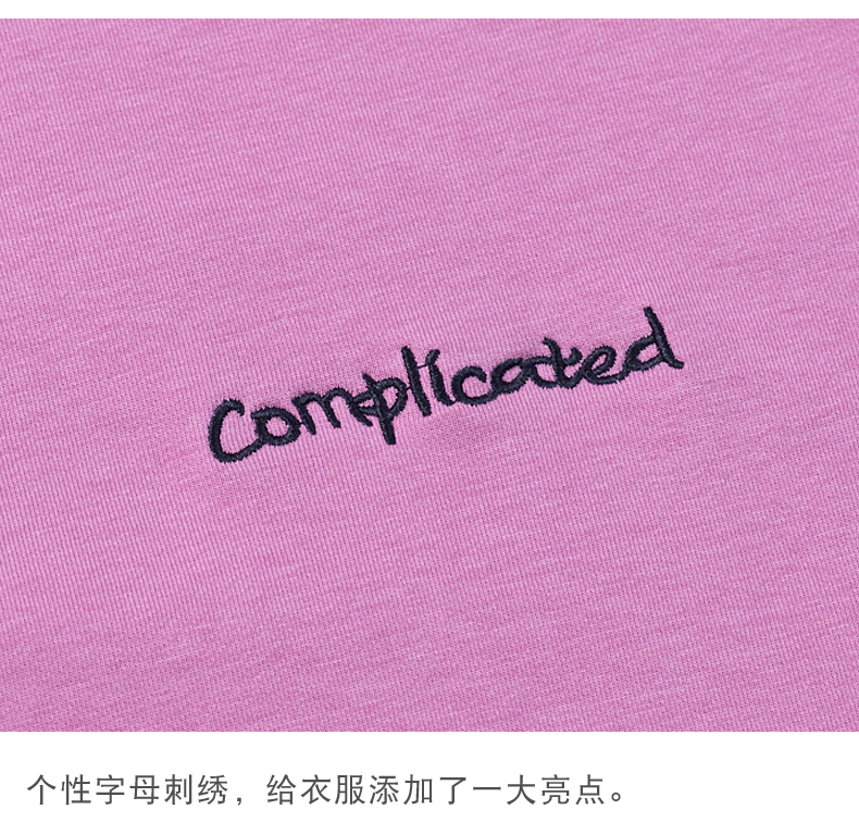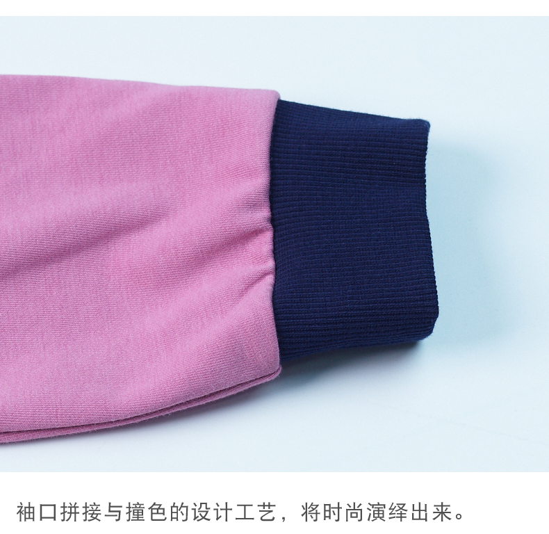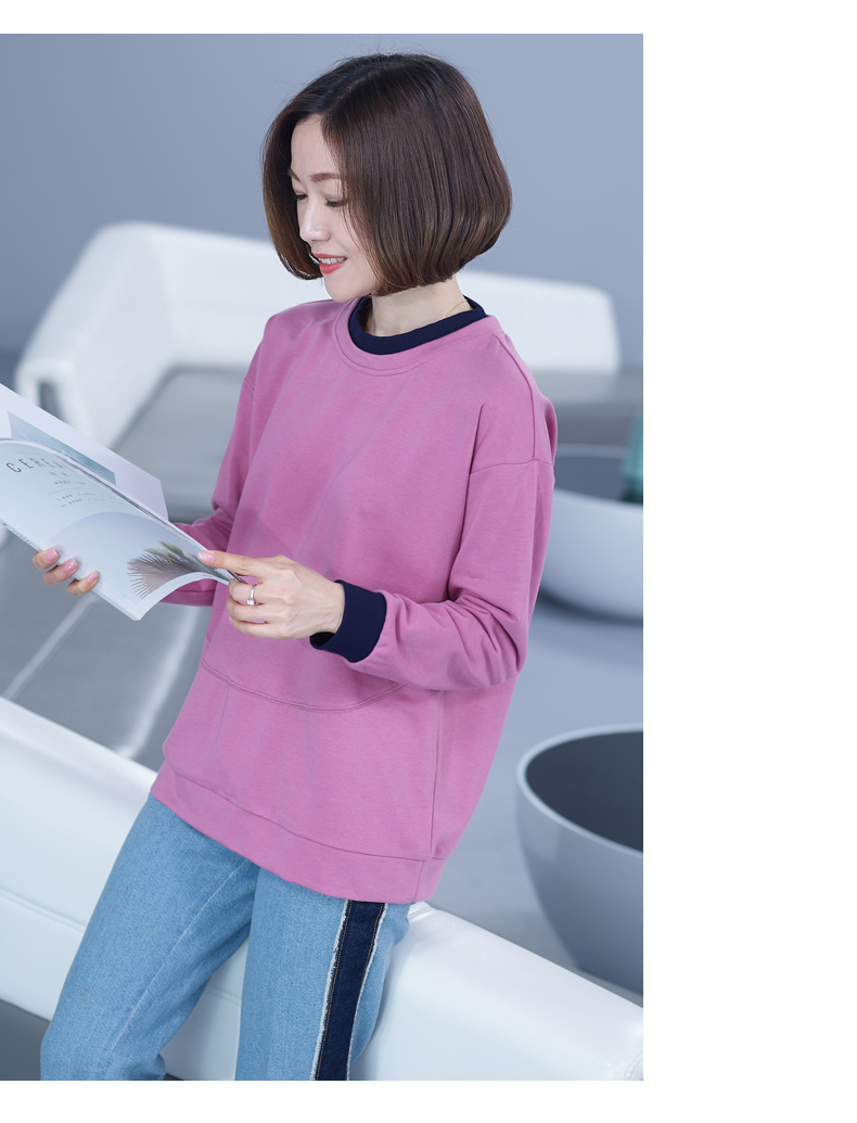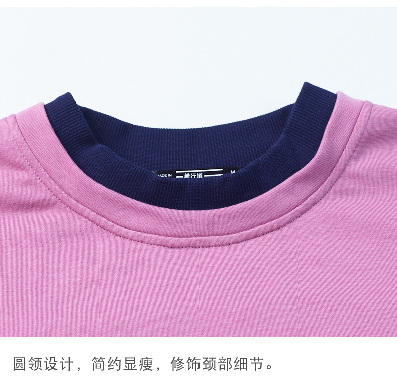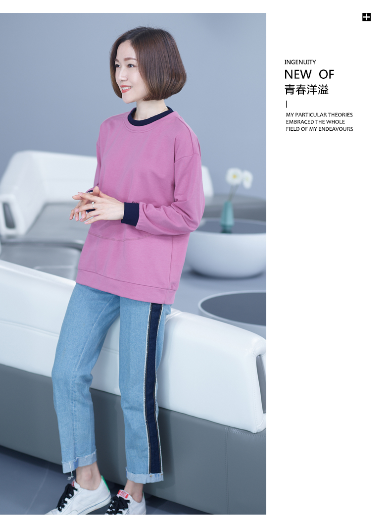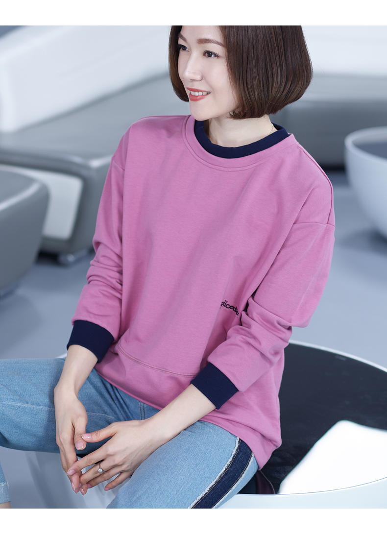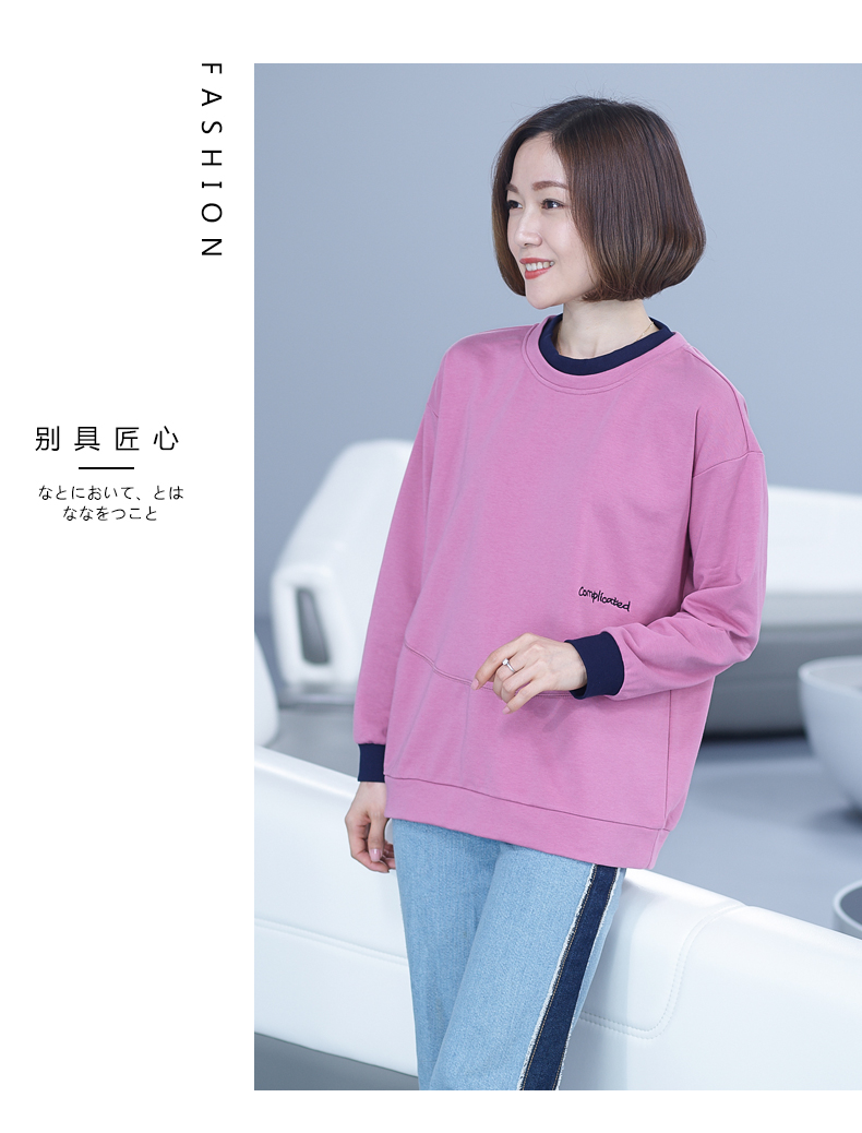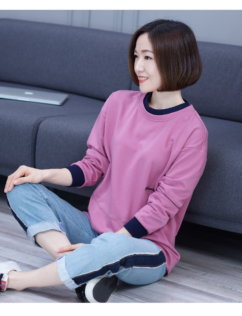 2019秋裝大碼女裝撞色圓領假兩件衛衣休閑寬松純色長袖刺繡上衣服1入