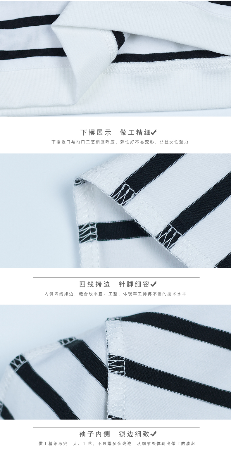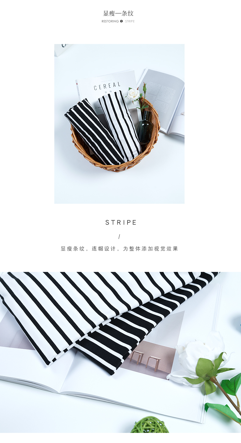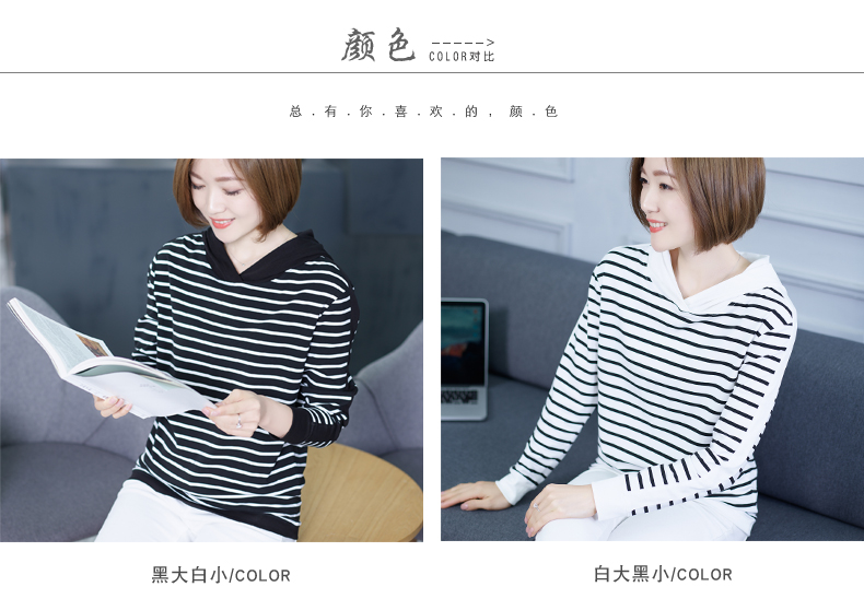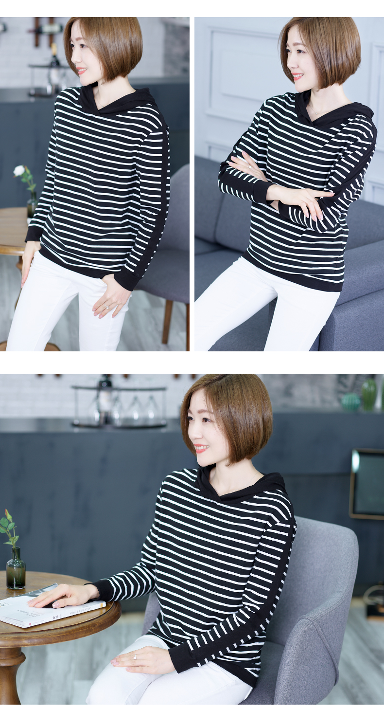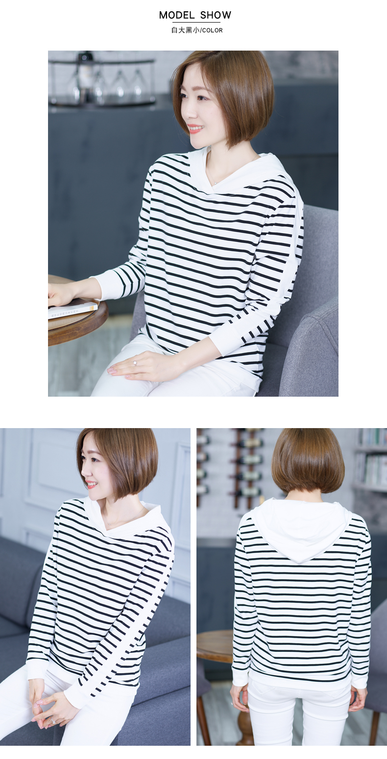 2019秋裝新款上衣服長袖t恤連帽套頭條紋小衫休閑寬松女裝打底衫1入