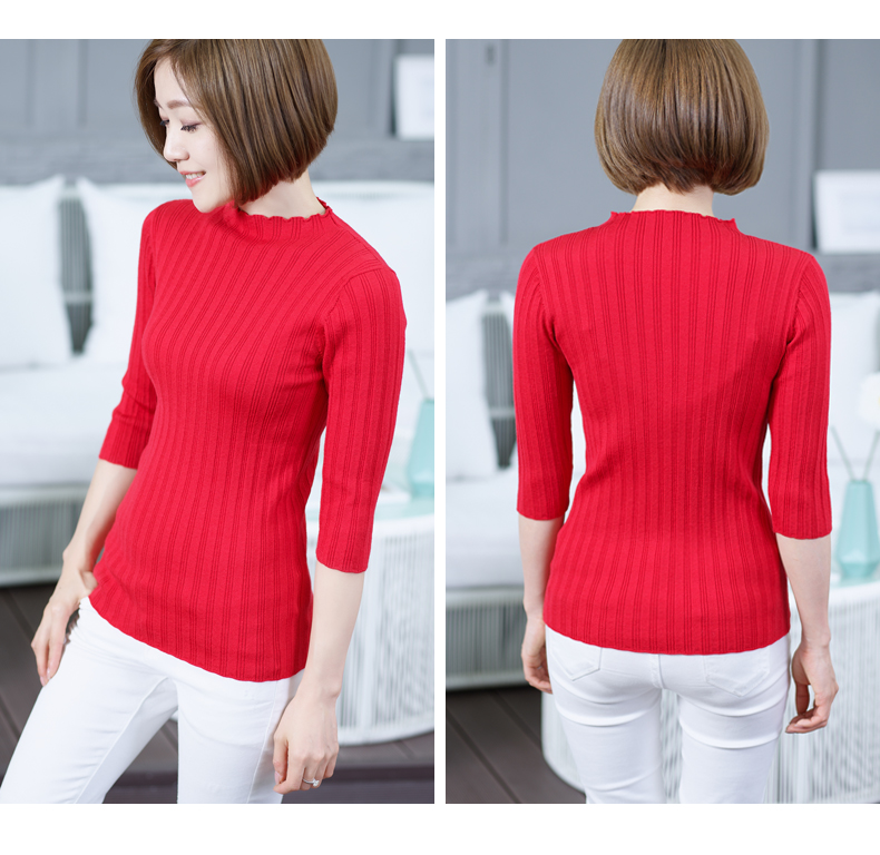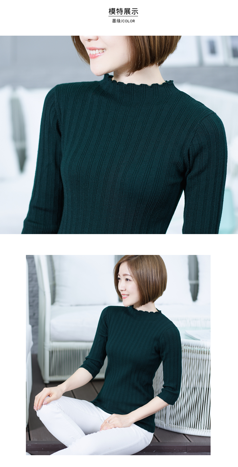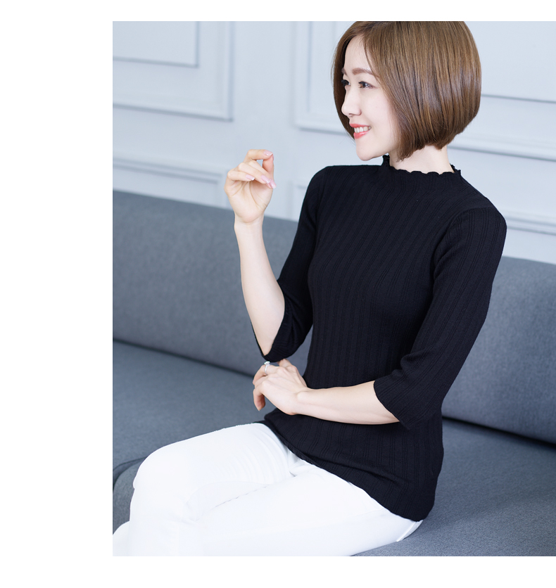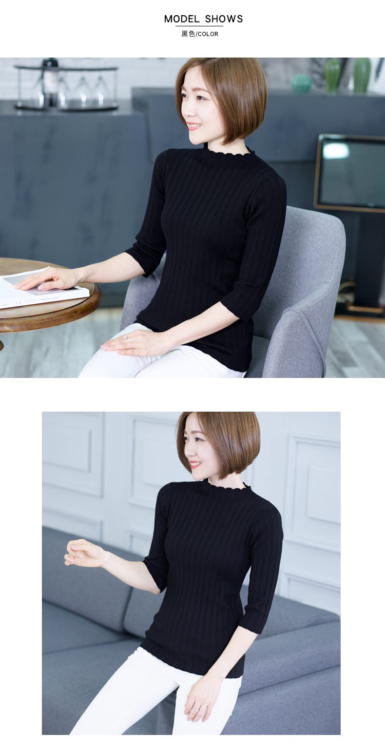2019秋季半高領中袖針織衫女黑色上衣羊毛衫七分袖打底衫套頭毛衣1入