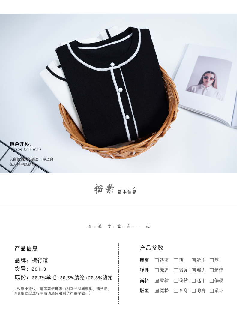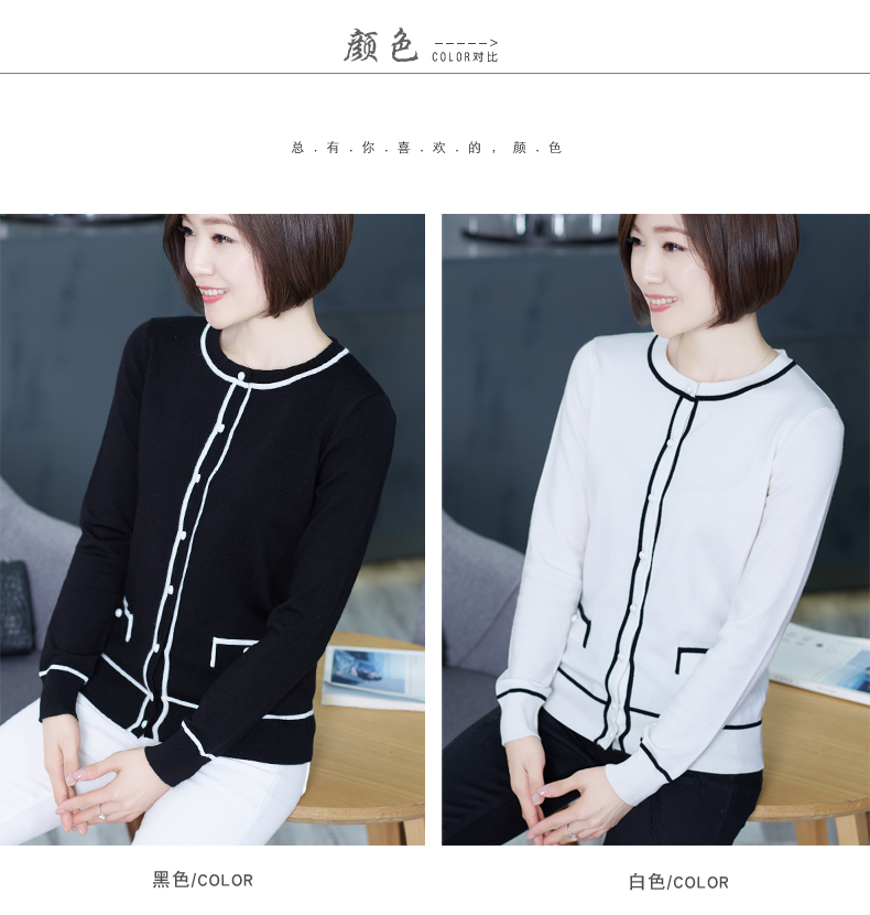 韓范女裝小香風羊毛針織衫寬松開衫拼接上衣服圓領秋裝小衫短外套1入