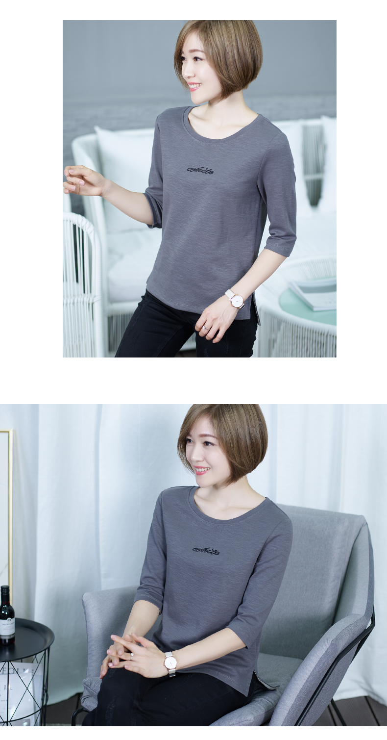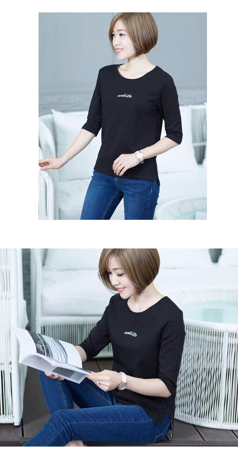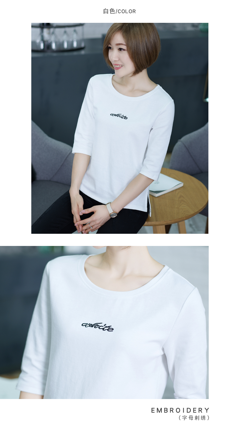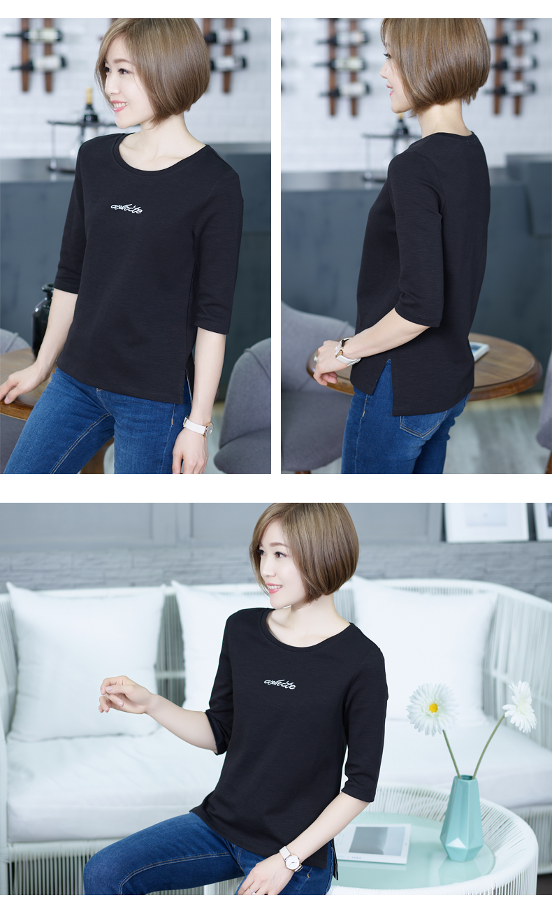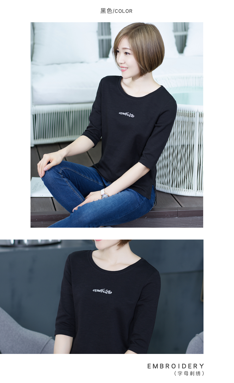 2019秋裝新款大碼女裝圓領半截袖開叉上衣字母刺繡T恤寬松打底衫1入