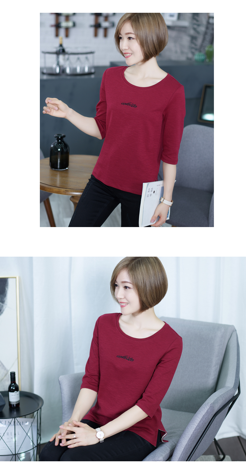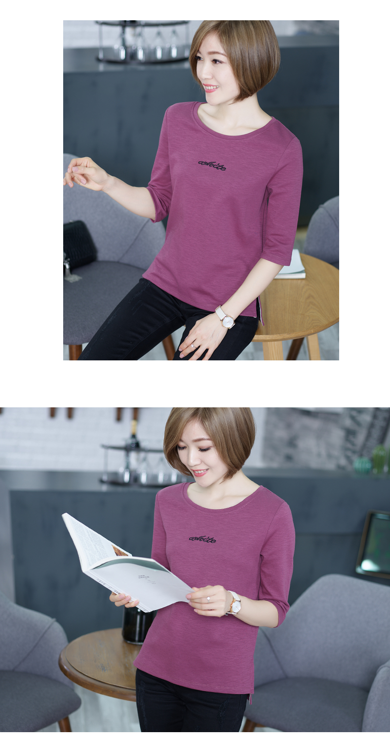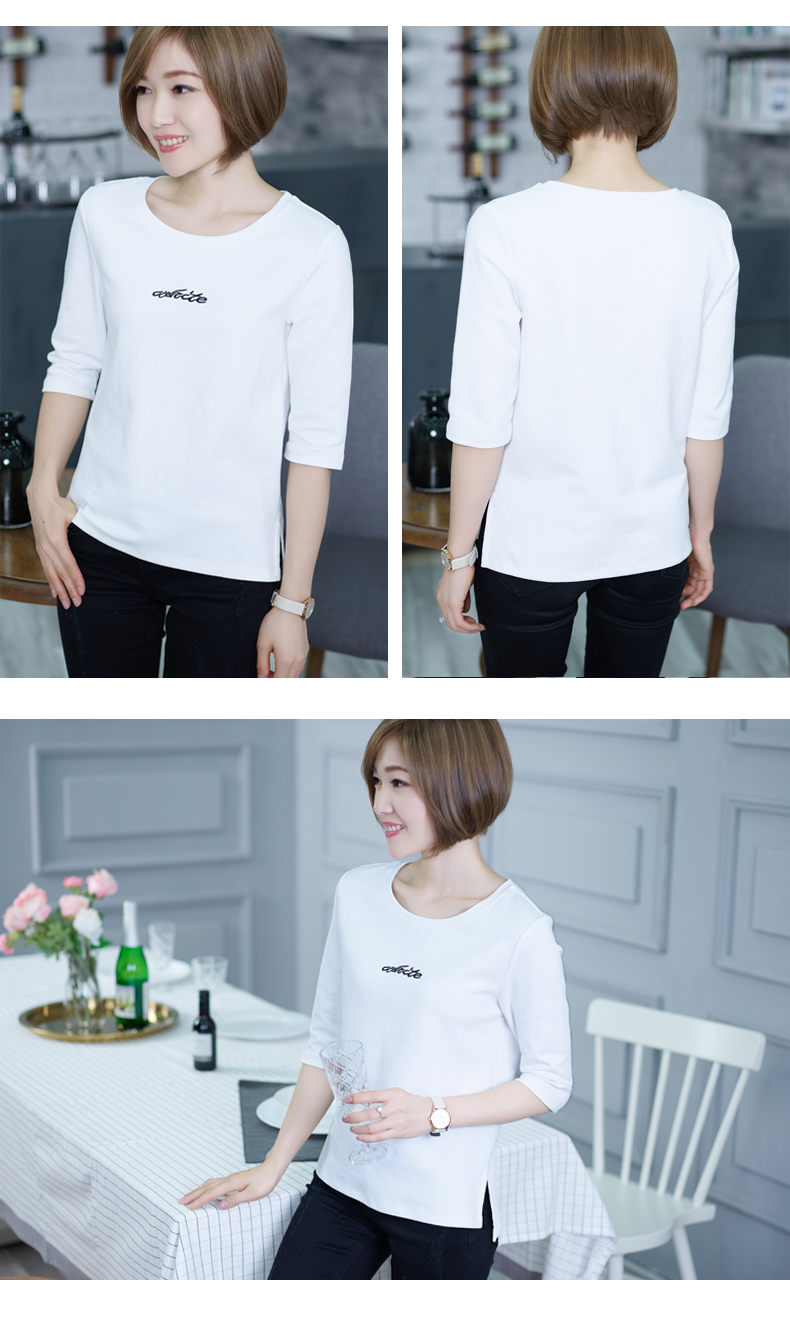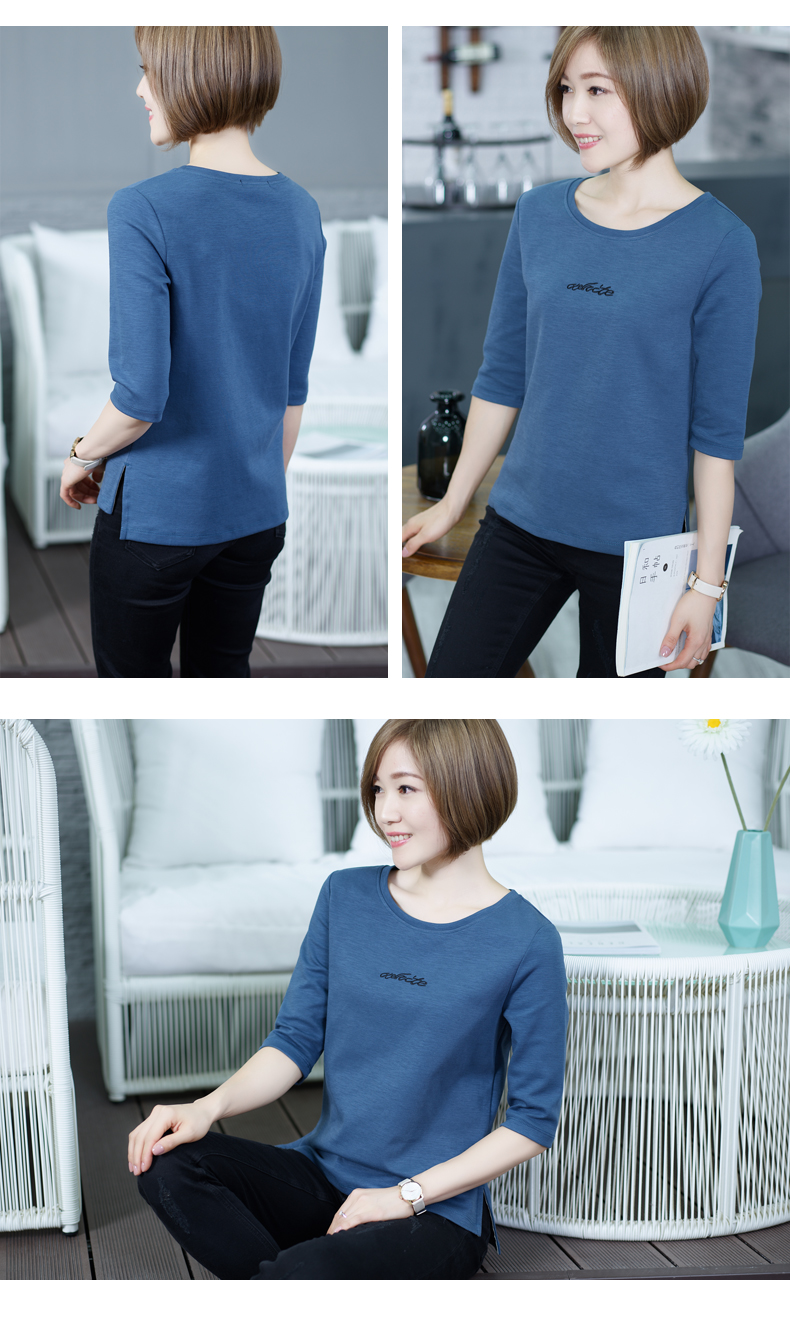 2019秋裝新款大碼女裝圓領半截袖開叉上衣字母刺繡T恤寬松打底衫1入
