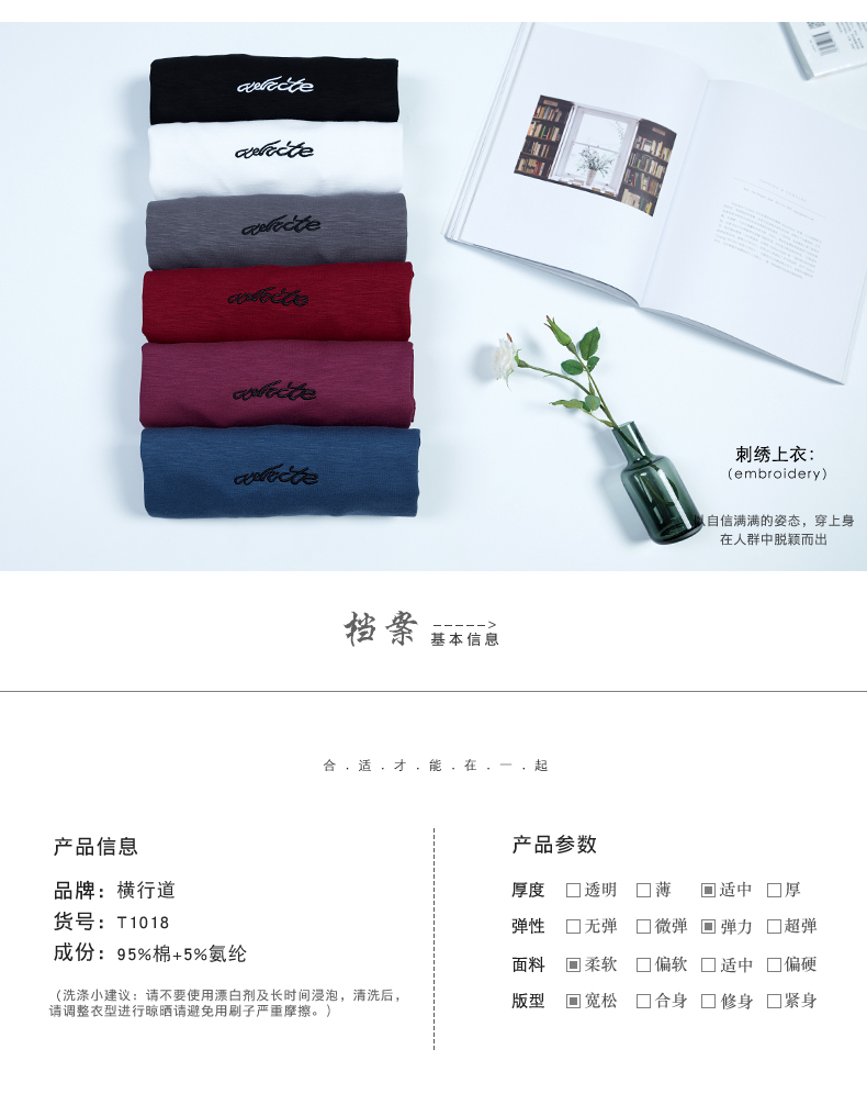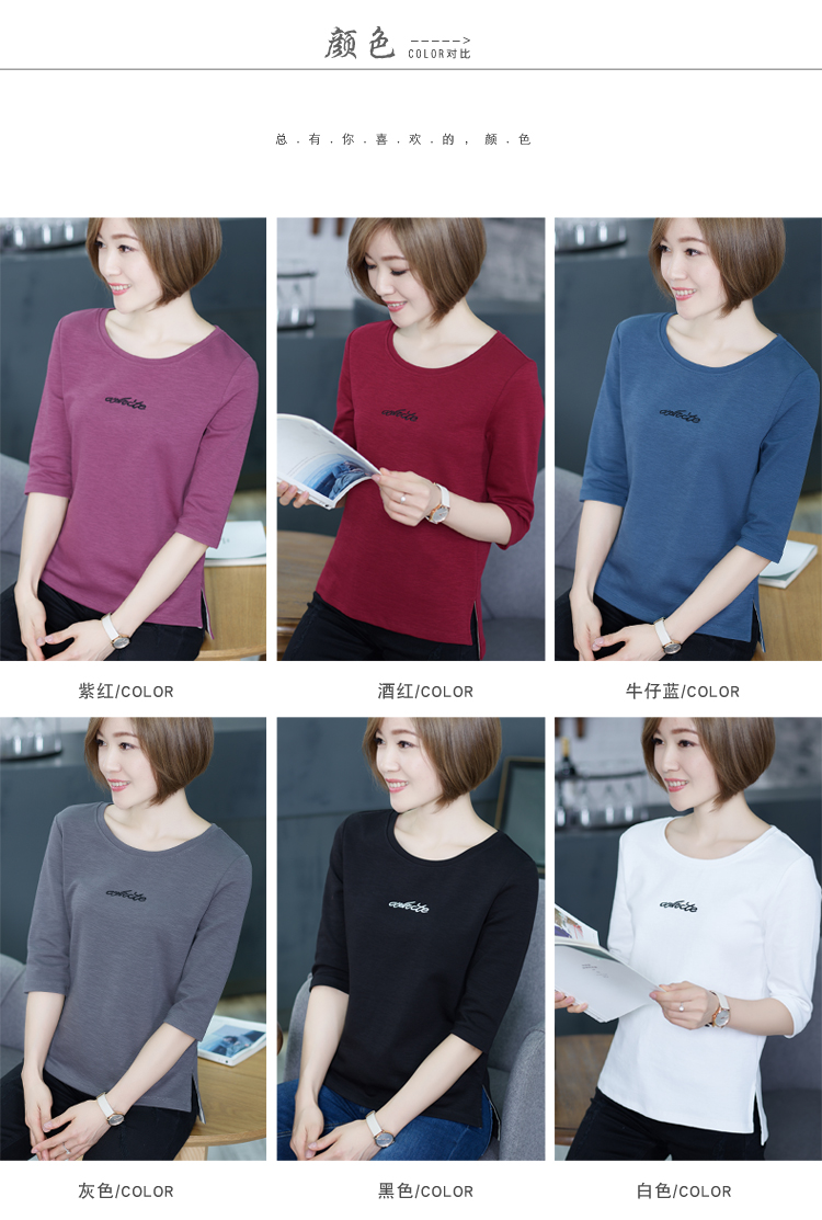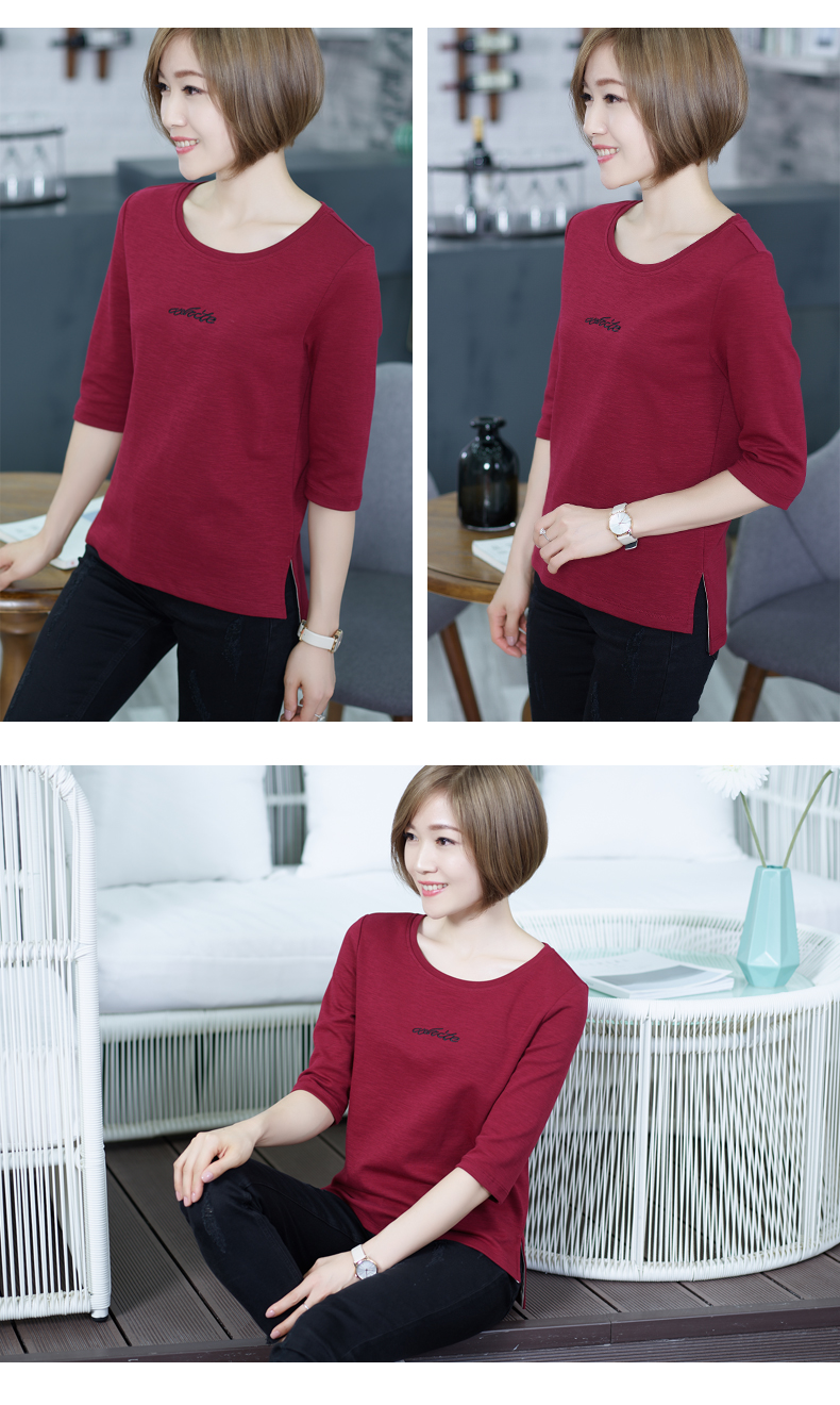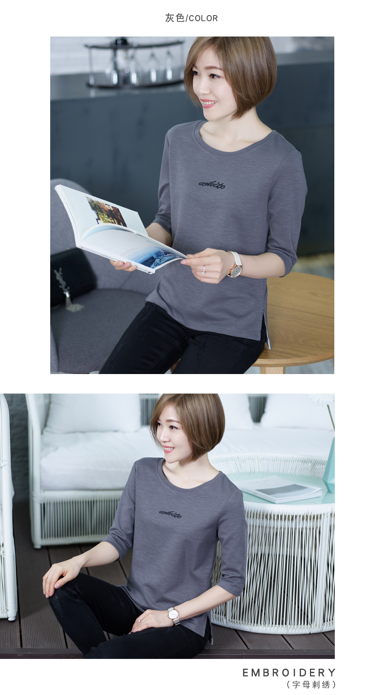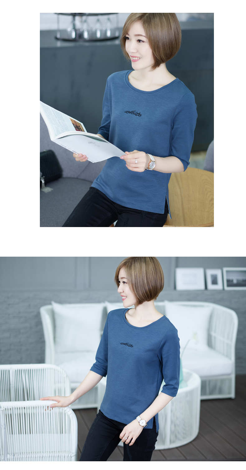 2019秋裝新款大碼女裝圓領半截袖開叉上衣字母刺繡T恤寬松打底衫1入