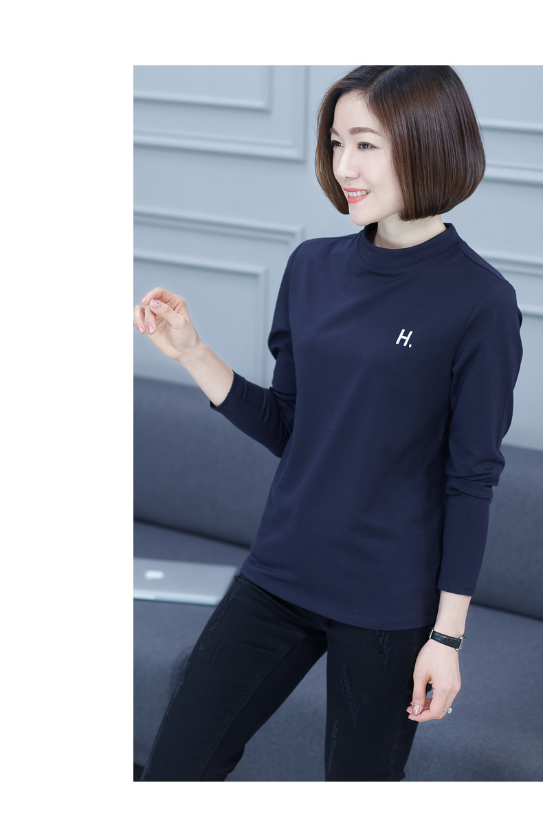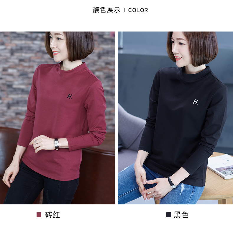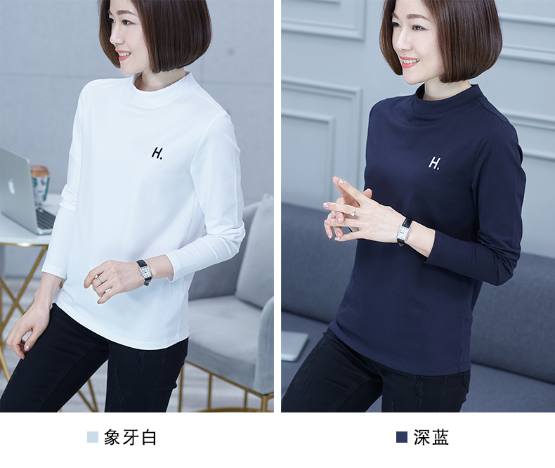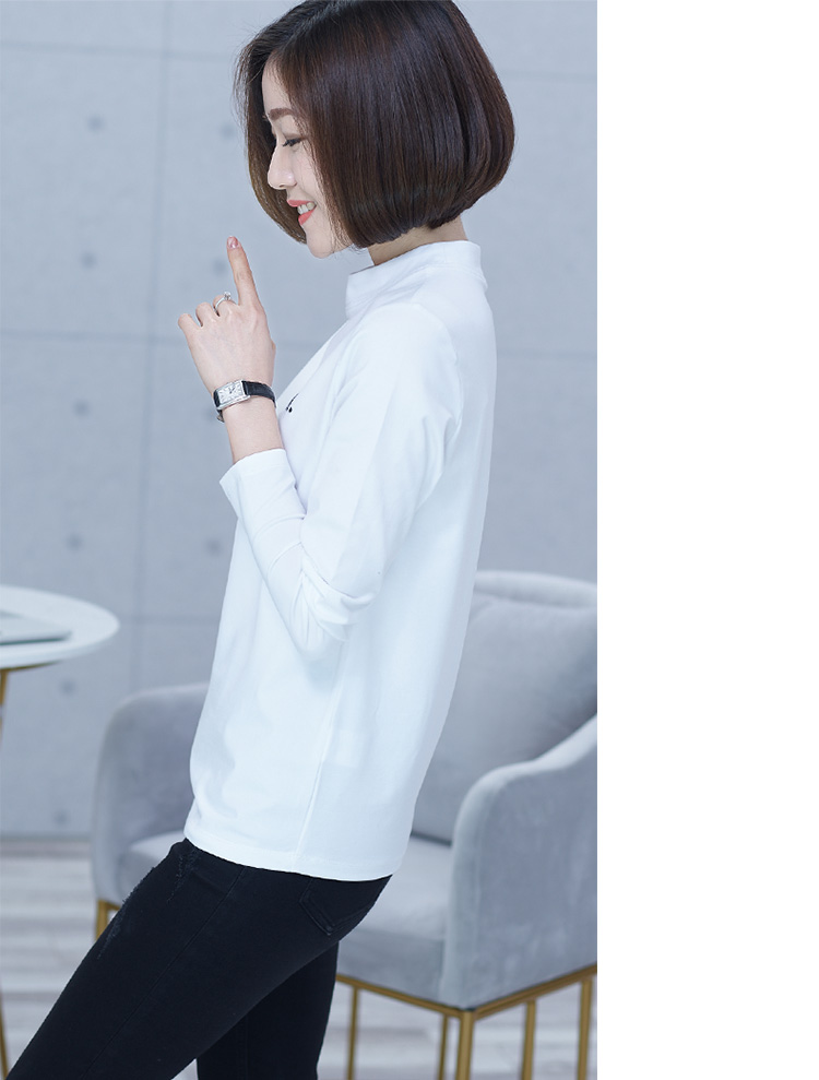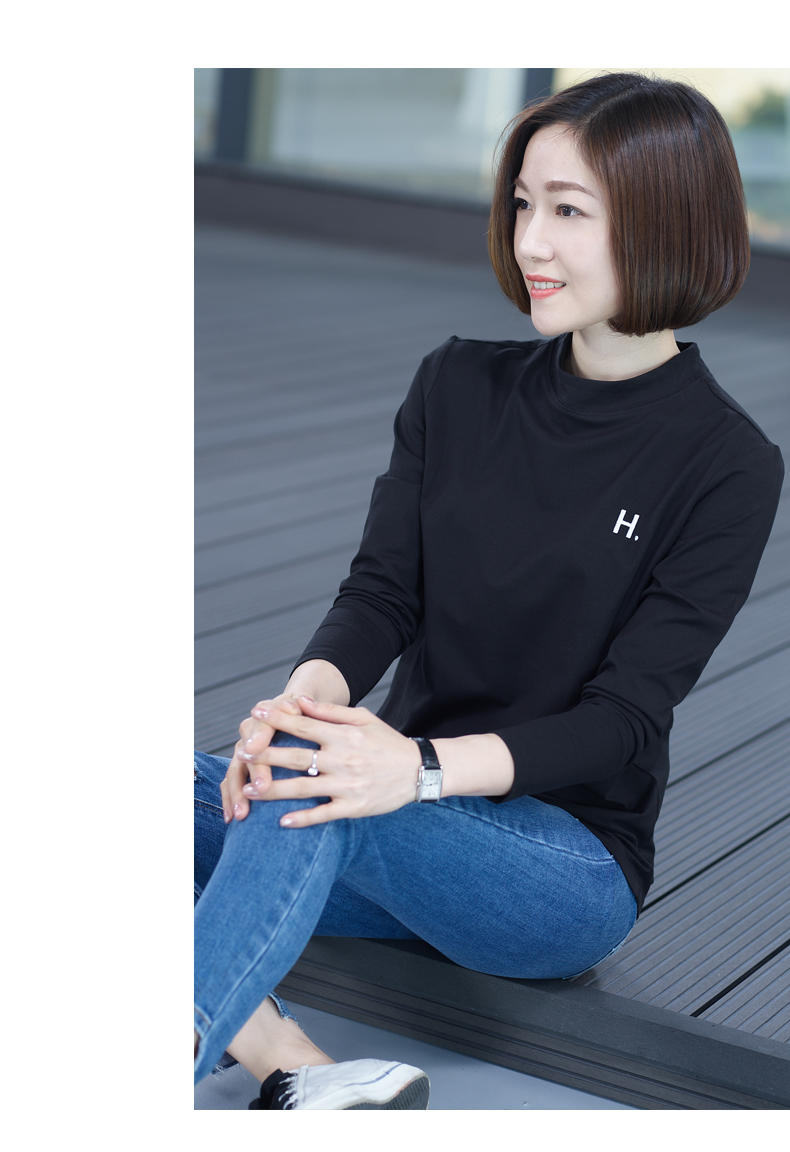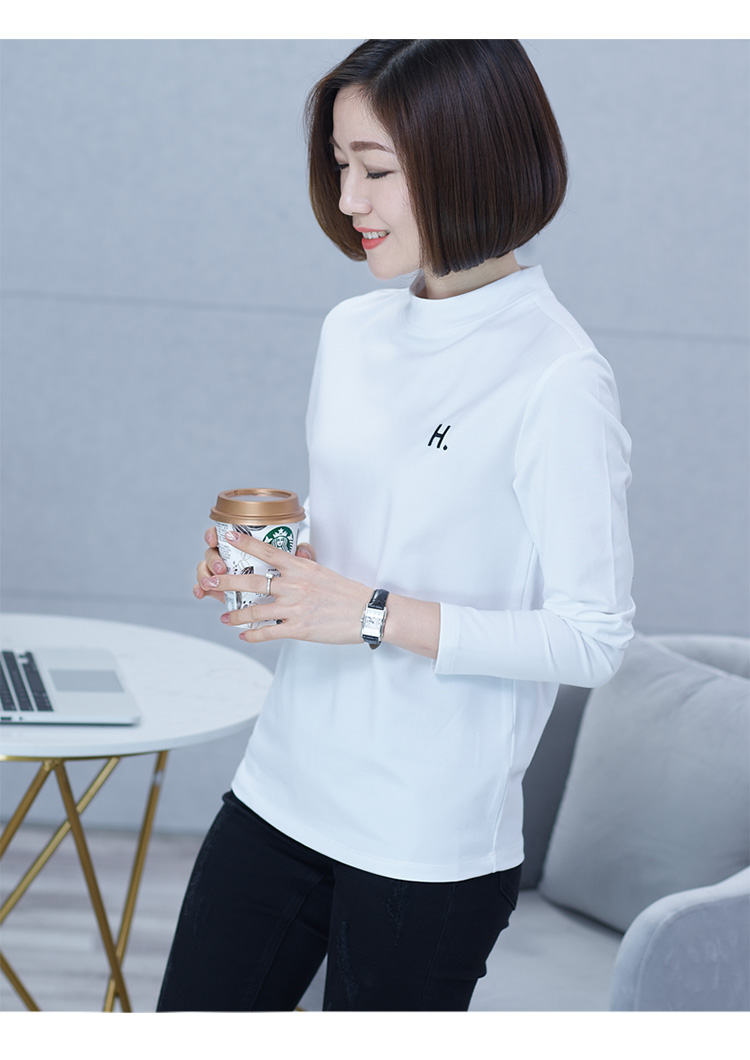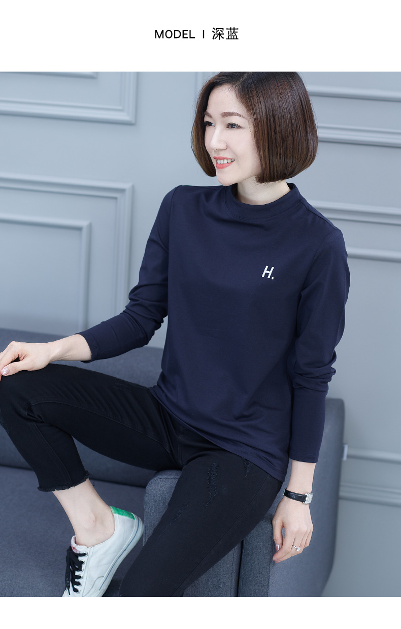 2019秋季大碼女裝半高領純色長袖黑色字母刺繡打底衫上衣t恤小衫1入