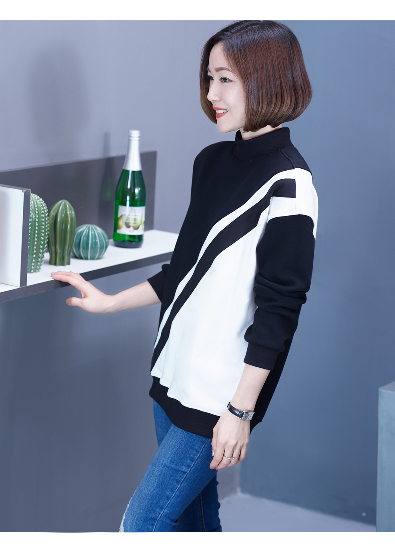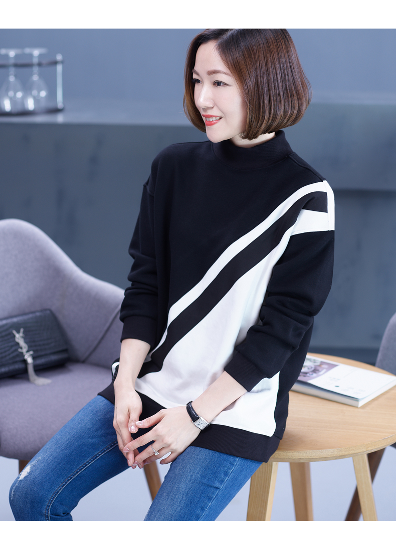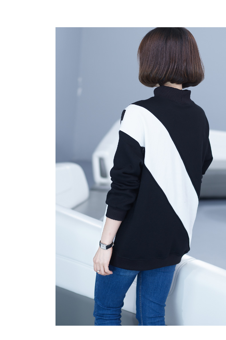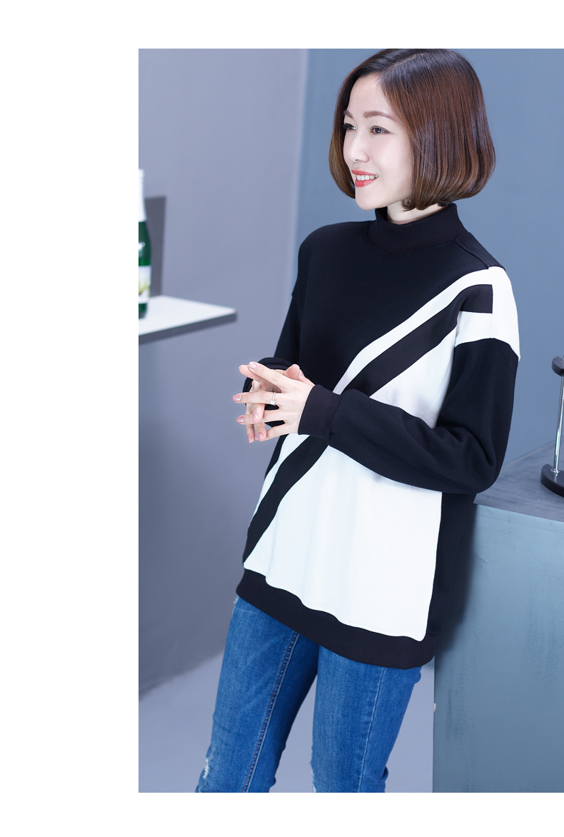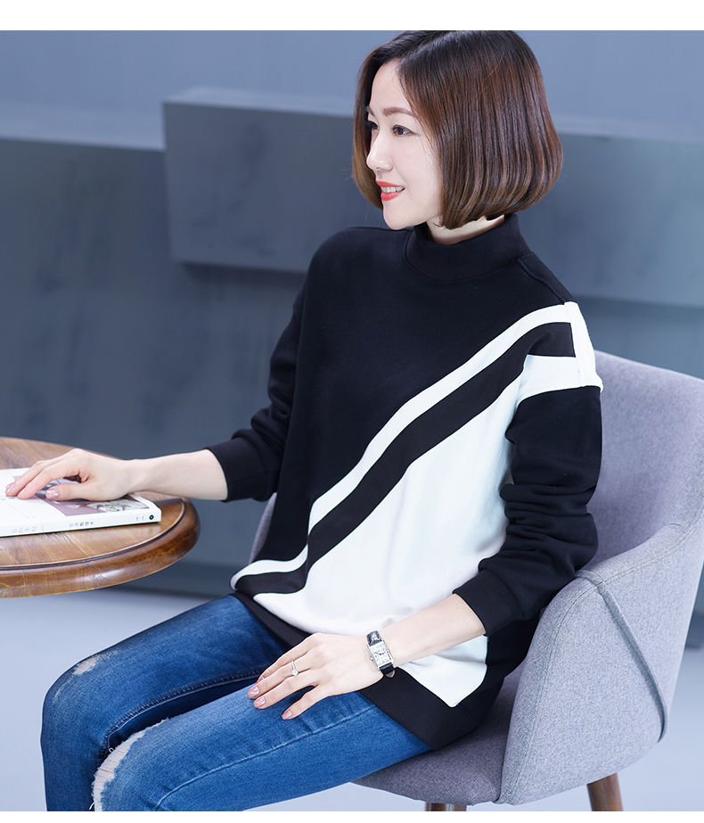 2019秋冬裝半高領加絨加厚撞色寬松大碼女裝長袖套頭黑色衛衣外穿1入