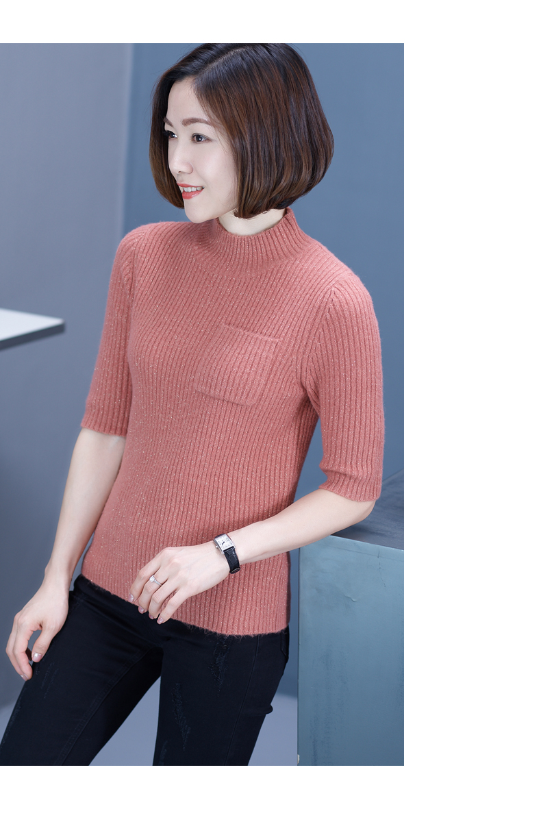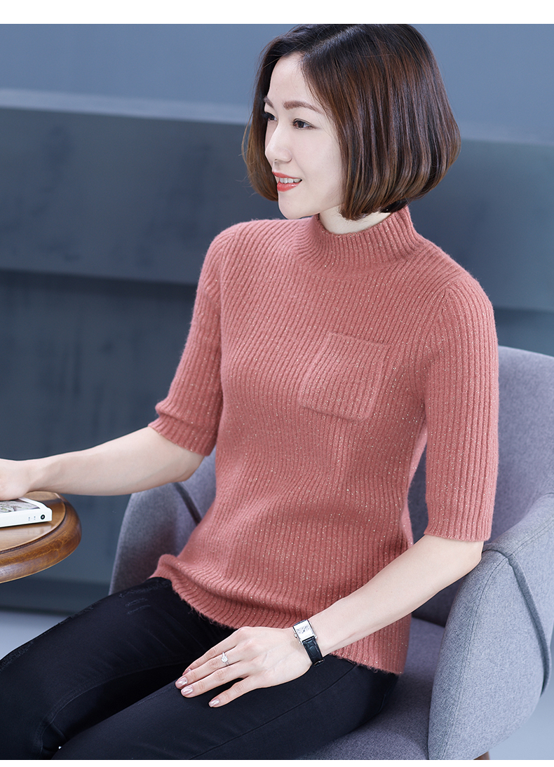 2019秋裝新款半高領中袖羊毛衫針織衫五分袖毛衣打底衫純色女上衣1入