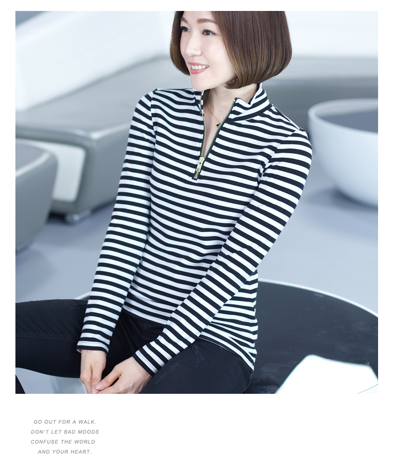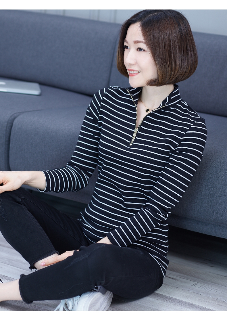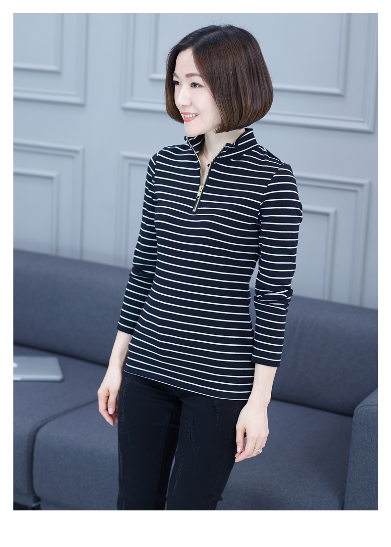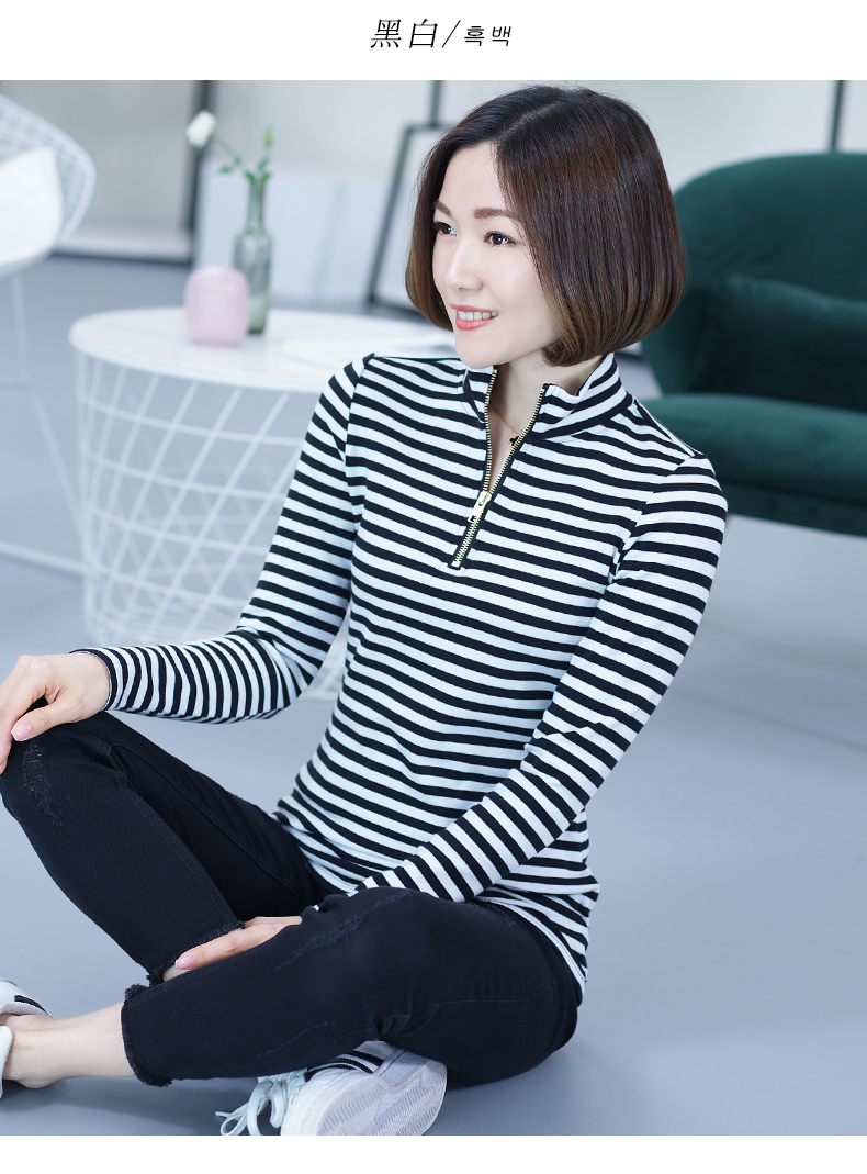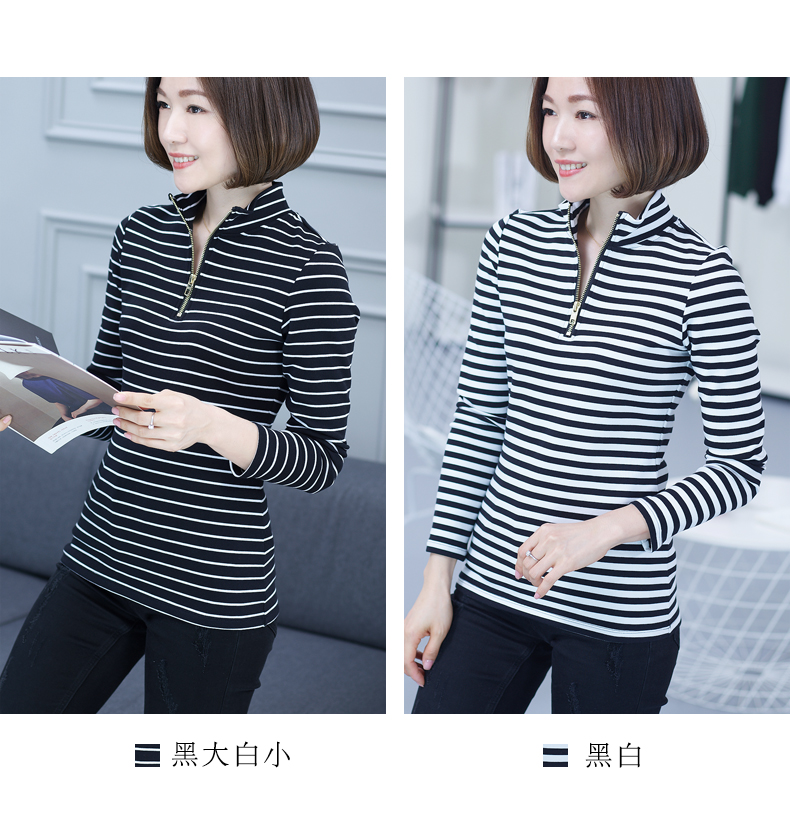 2019秋裝半高領條紋長袖女士加厚打底衫體恤拉鏈上衣t恤小衫外穿1入