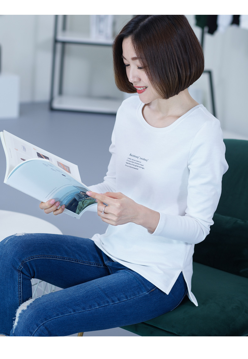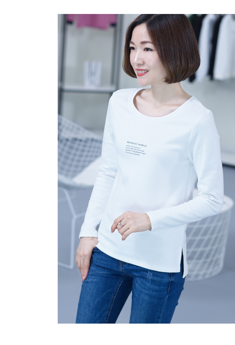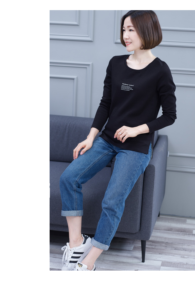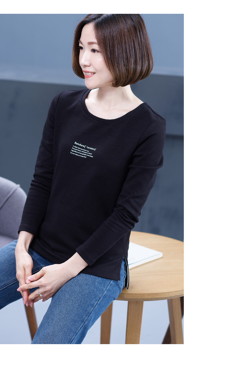 2019秋裝新款圓領大碼女裝竹節棉長袖印花t恤上衣寬松打底衫黑色1入