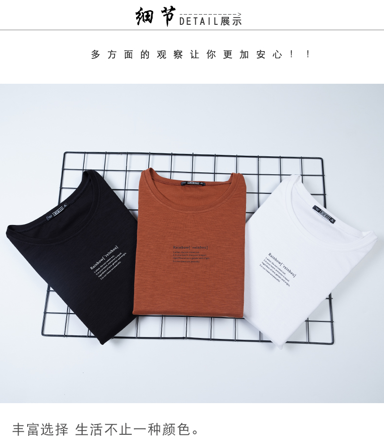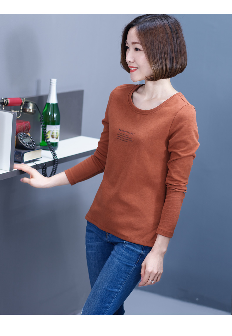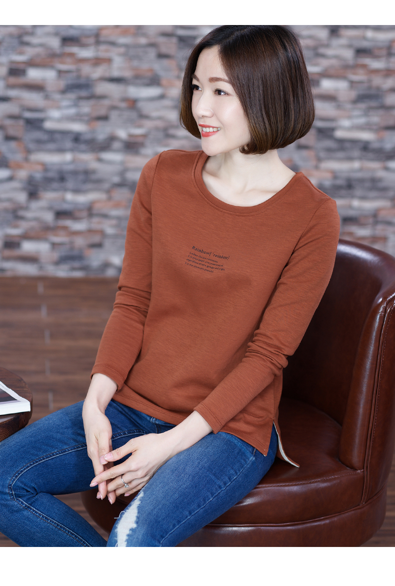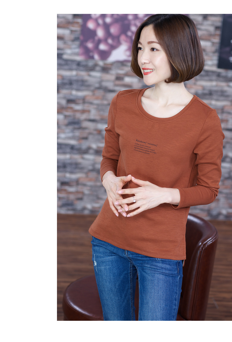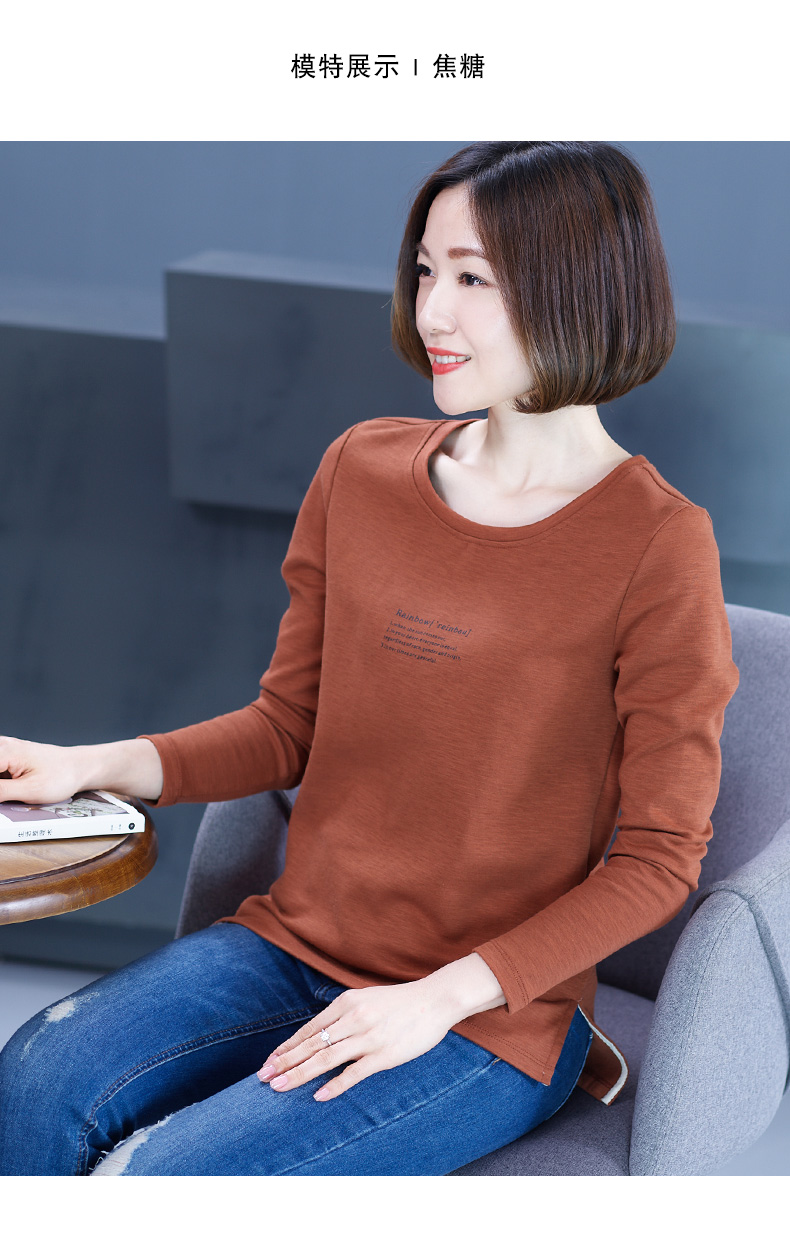 2019秋裝新款圓領大碼女裝竹節棉長袖印花t恤上衣寬松打底衫黑色1入