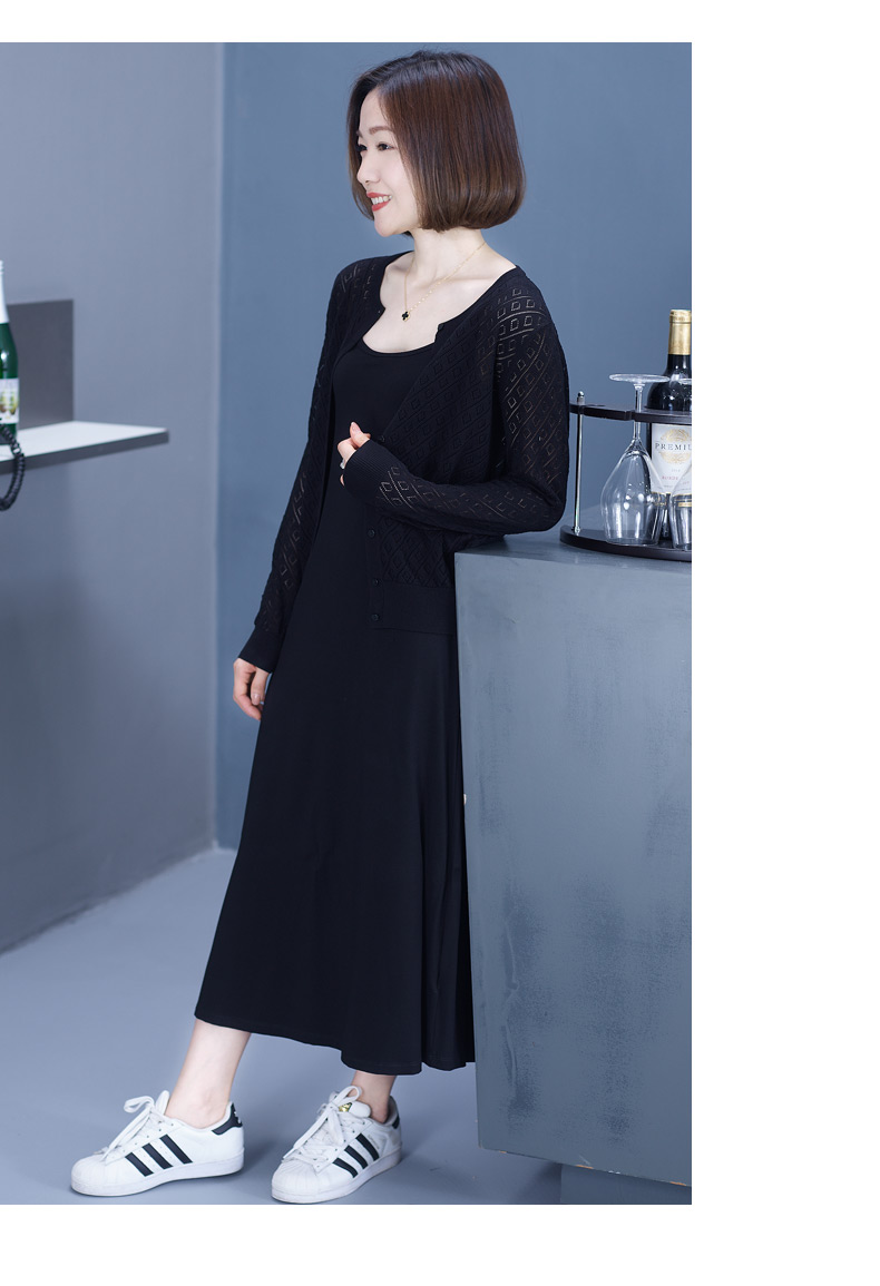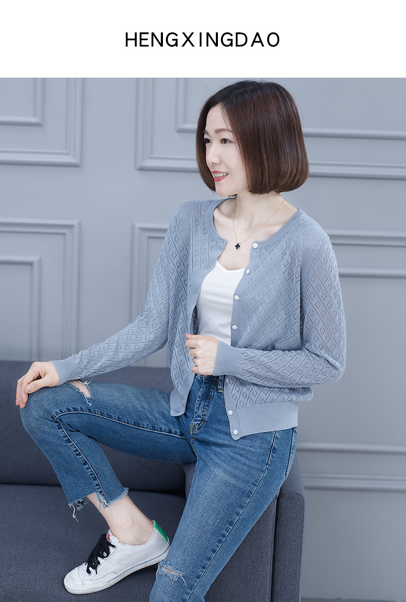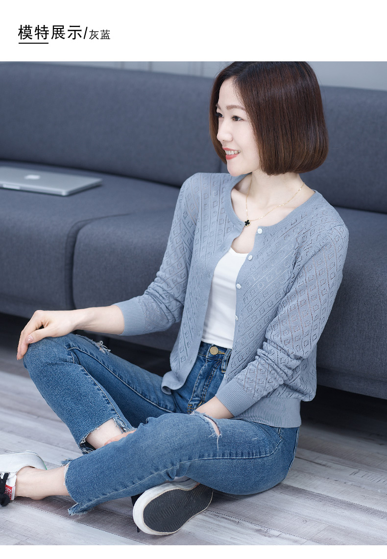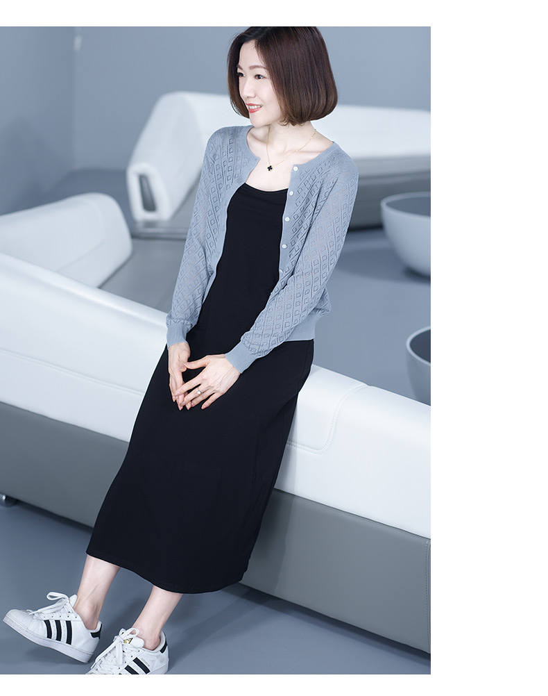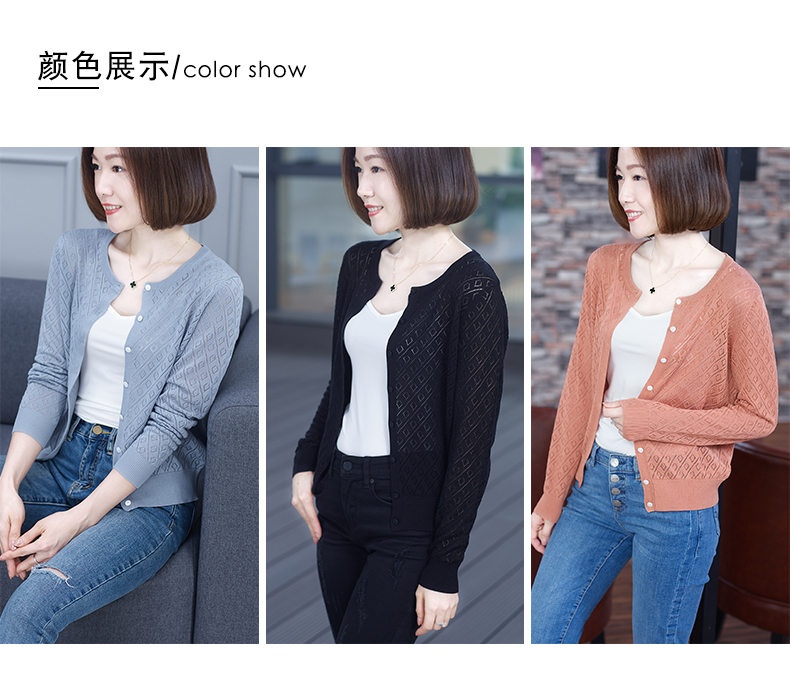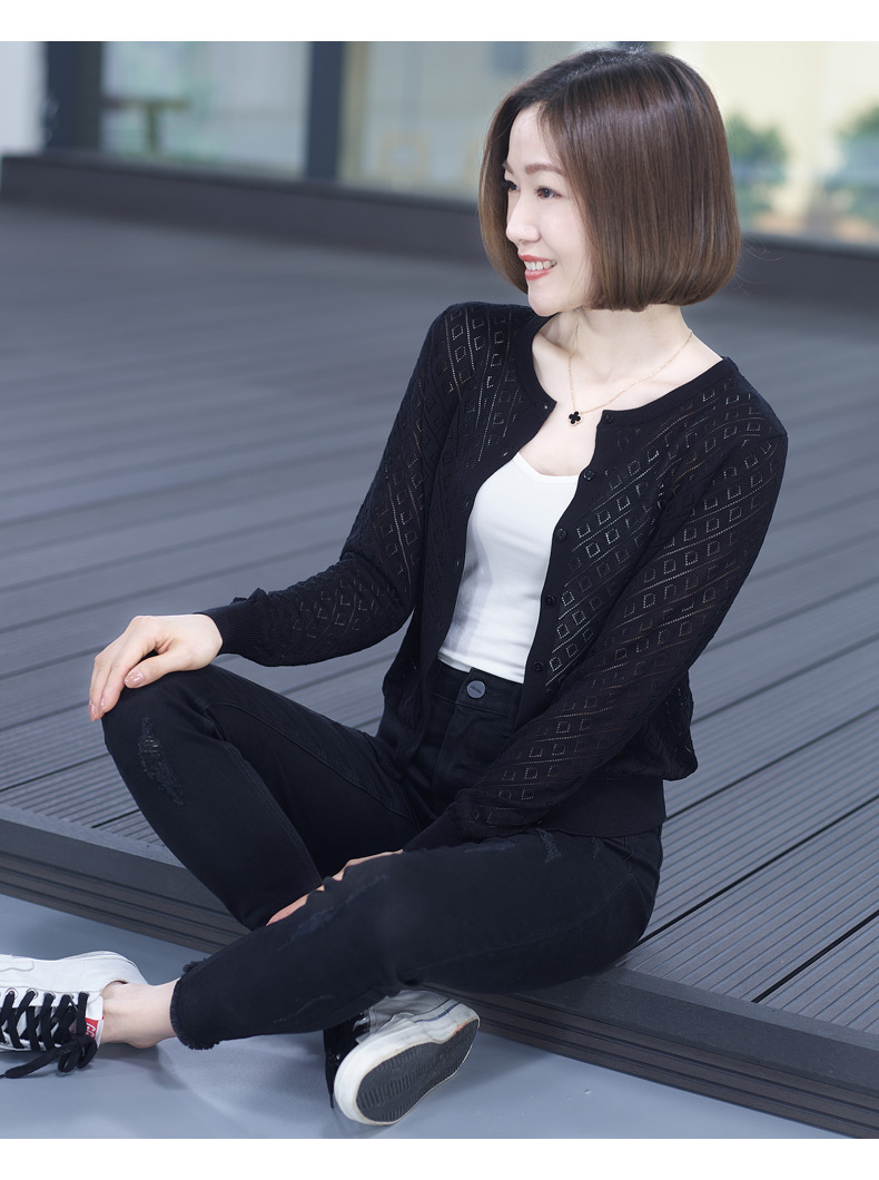 2019早秋新款鏤空圓領針織開衫天絲外套黑色長袖純色空調衫女秋裝1入