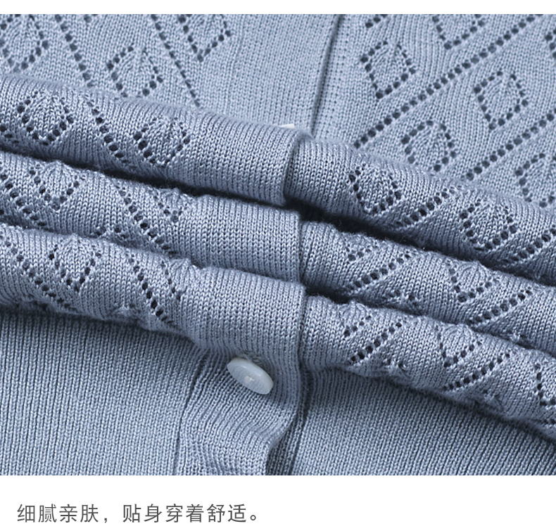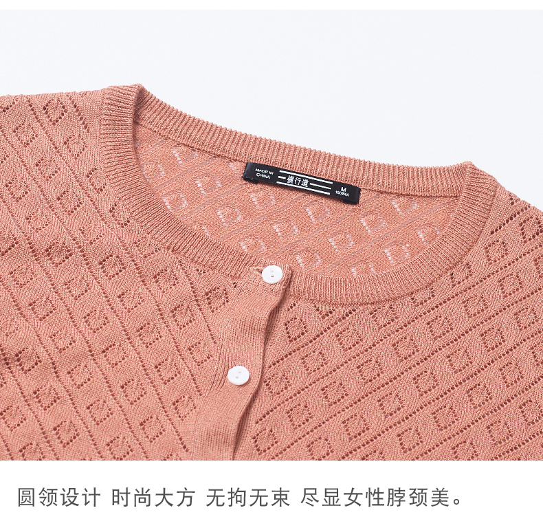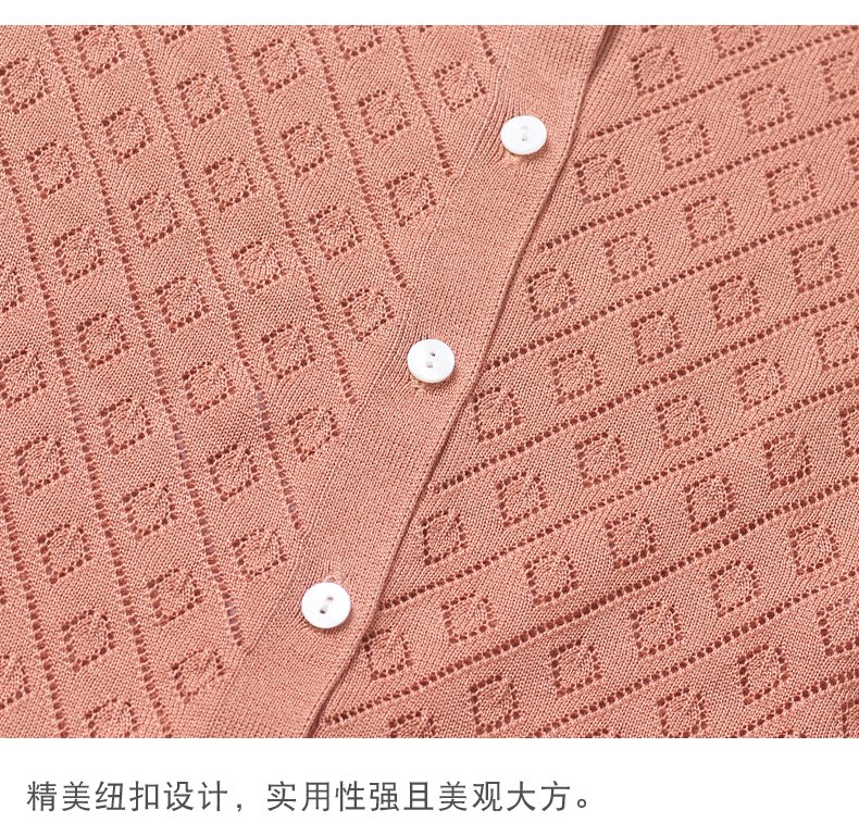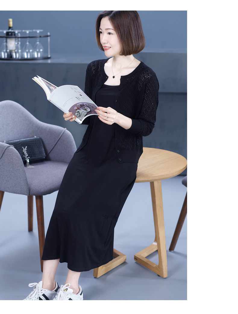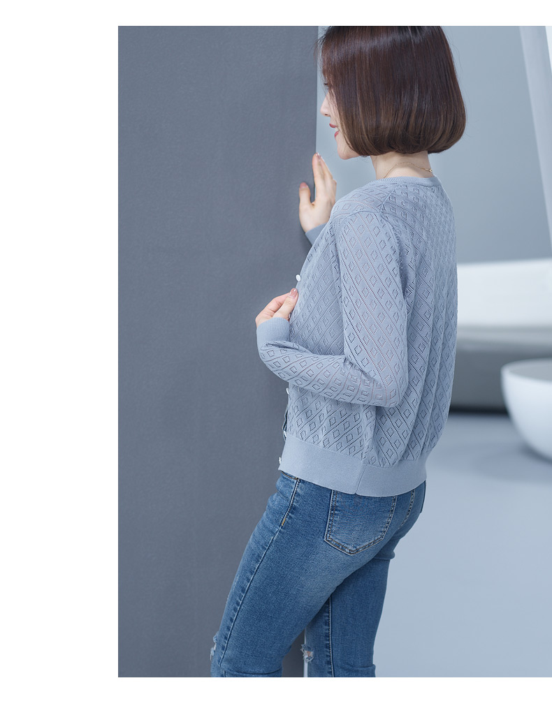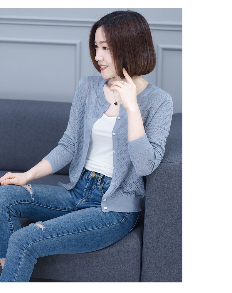 2019早秋新款鏤空圓領針織開衫天絲外套黑色長袖純色空調衫女秋裝1入