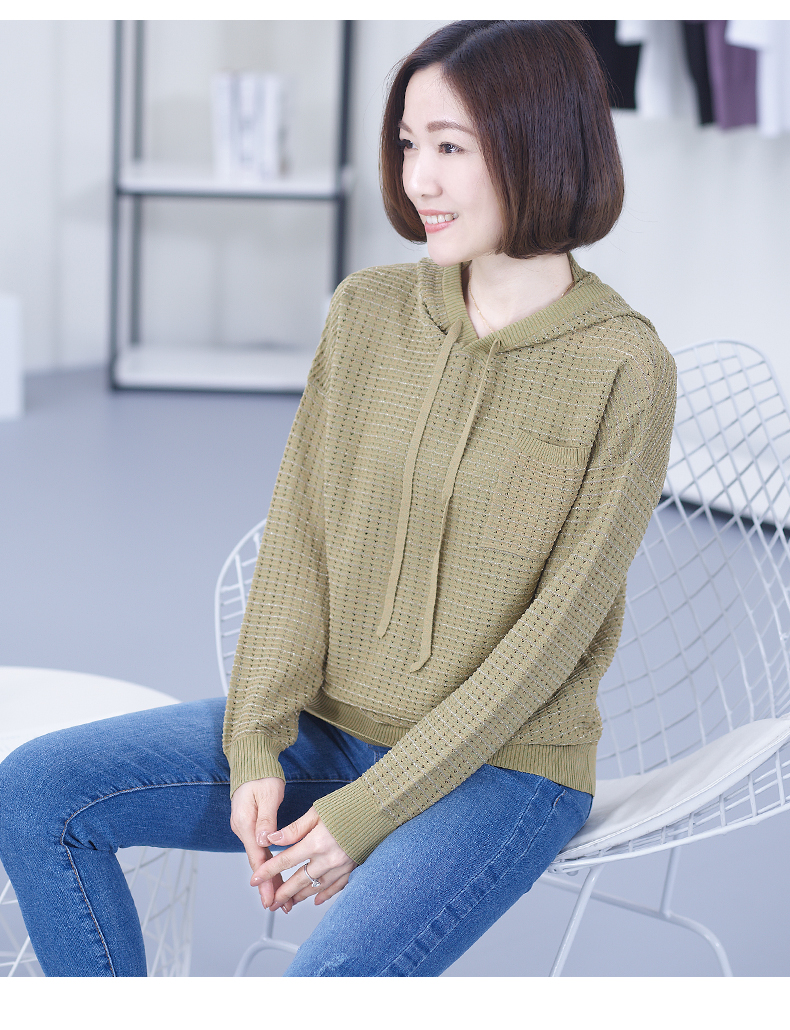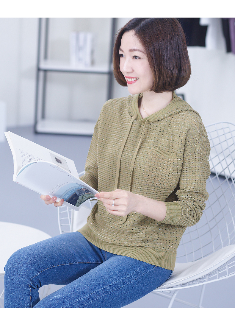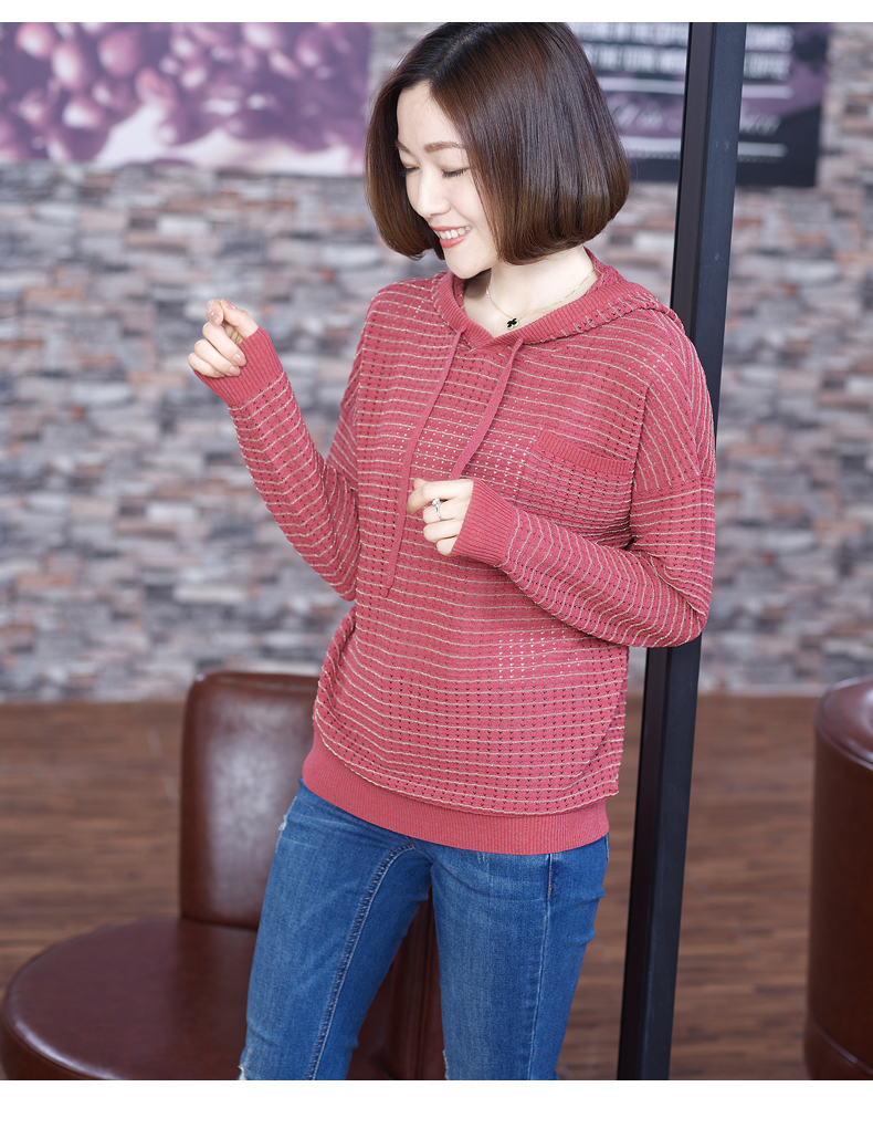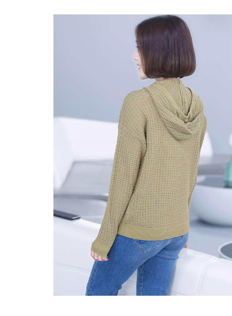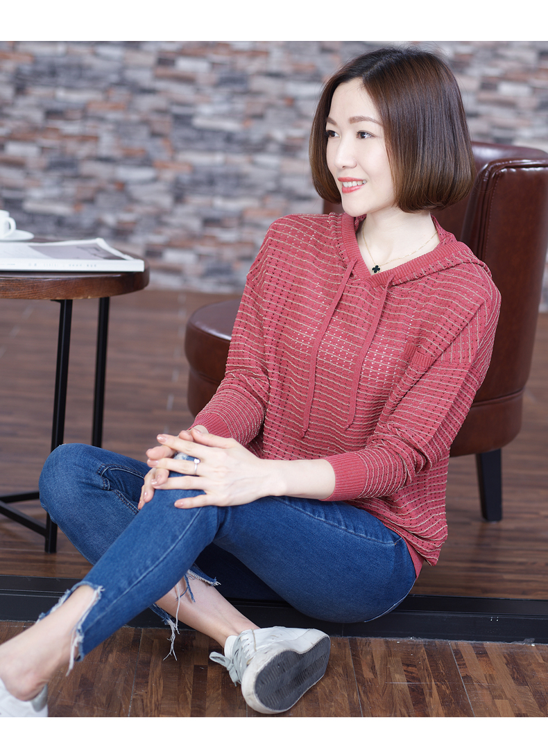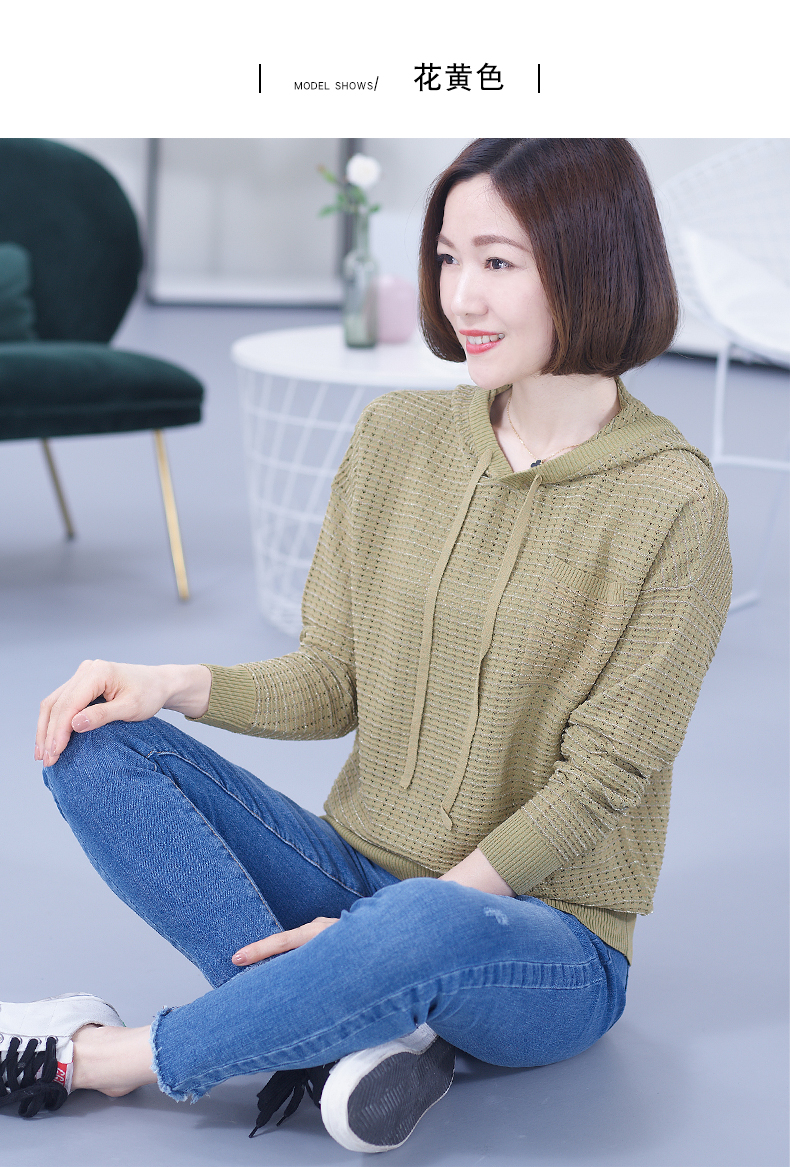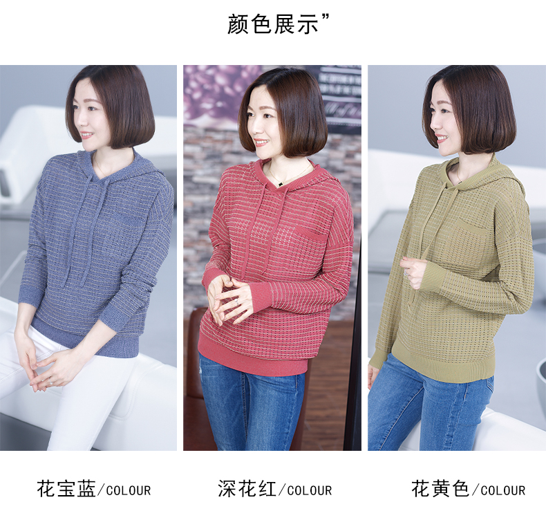 2019秋裝新款連帽寬松鏤空大碼女裝長袖針織衫連帽打底衫上衣外穿1入