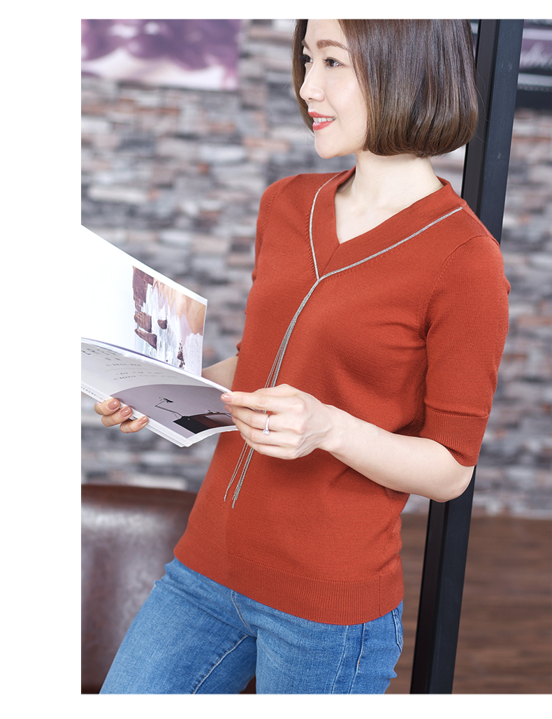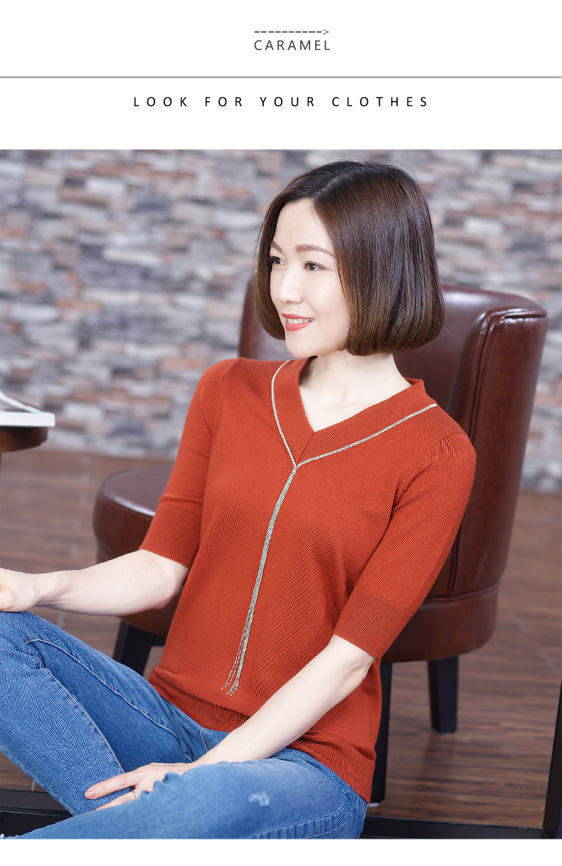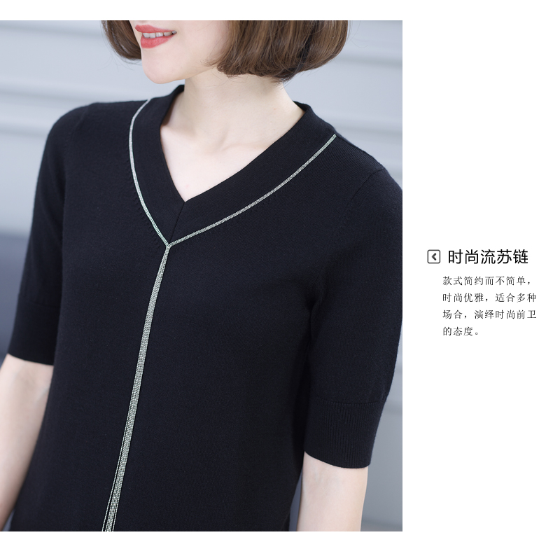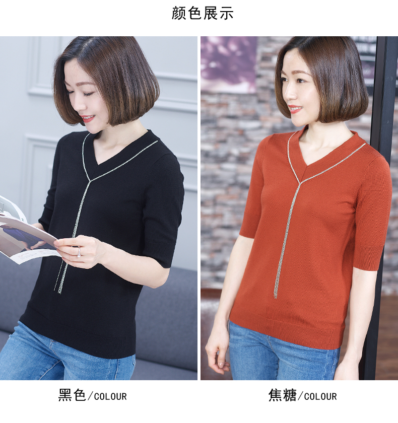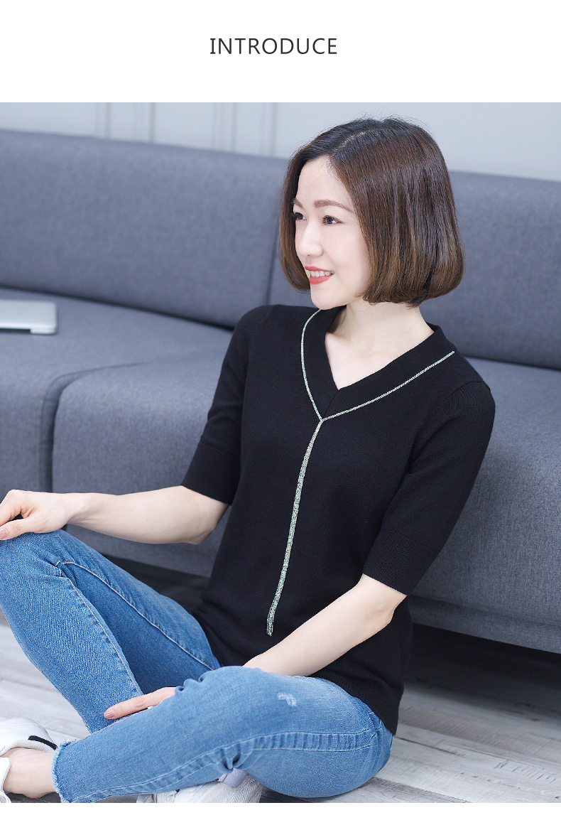 2019秋裝v領黑色中袖羊毛針織衫五分袖毛衣純色寬松上衣女打底衫1入
