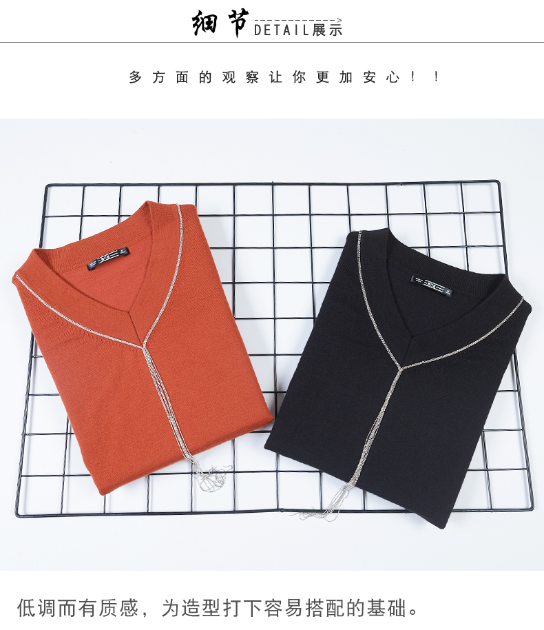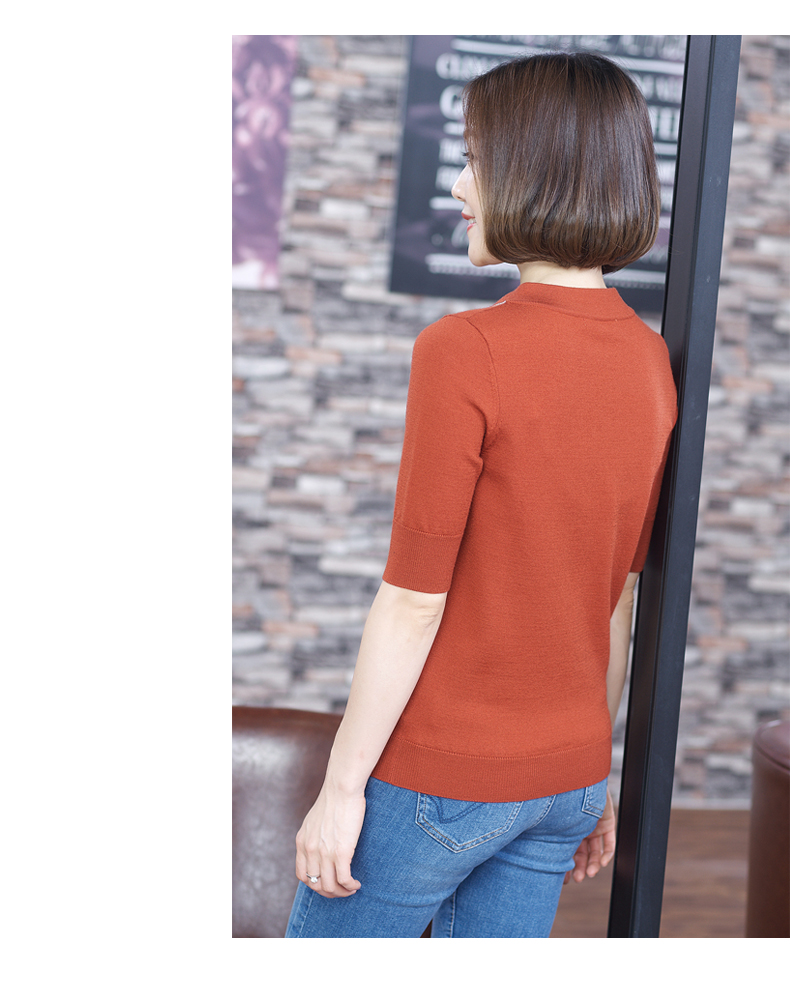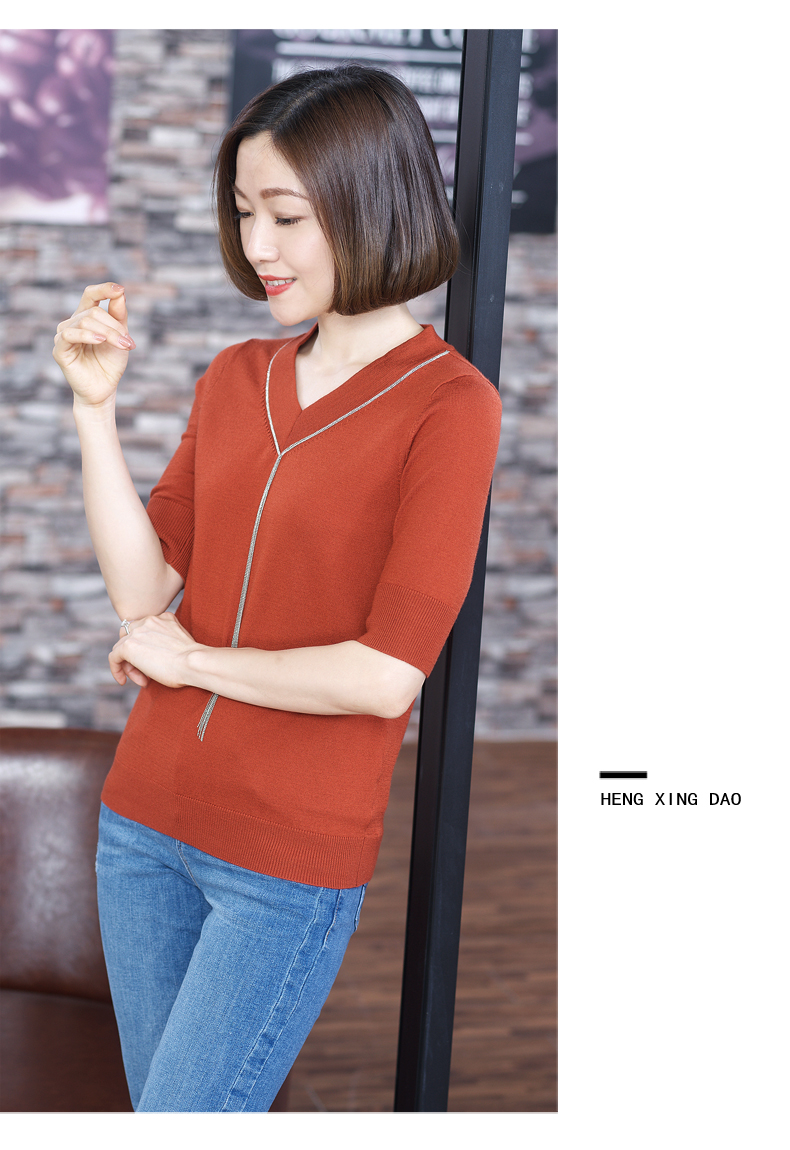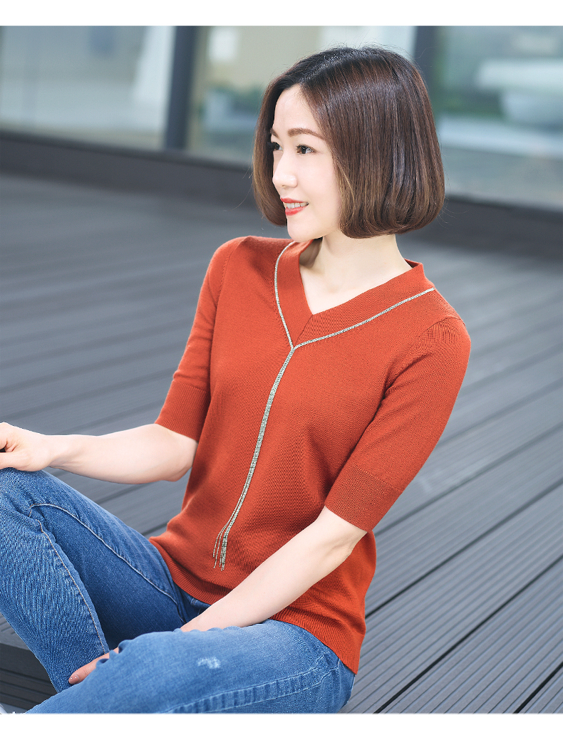 2019秋裝v領黑色中袖羊毛針織衫五分袖毛衣純色寬松上衣女打底衫1入