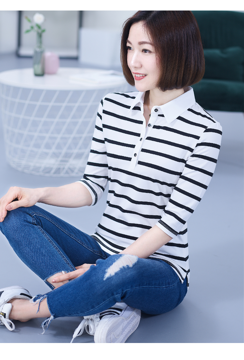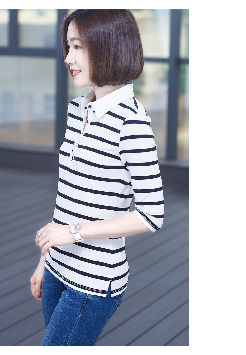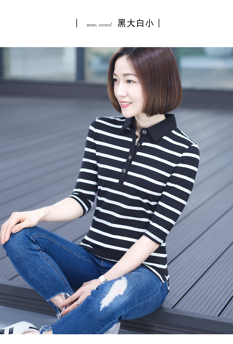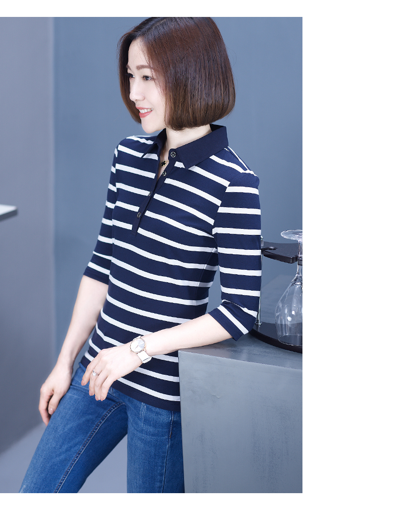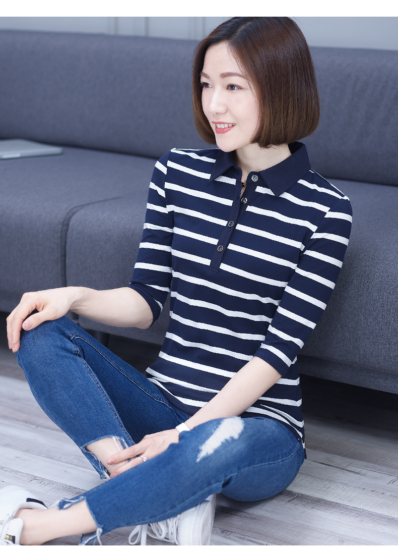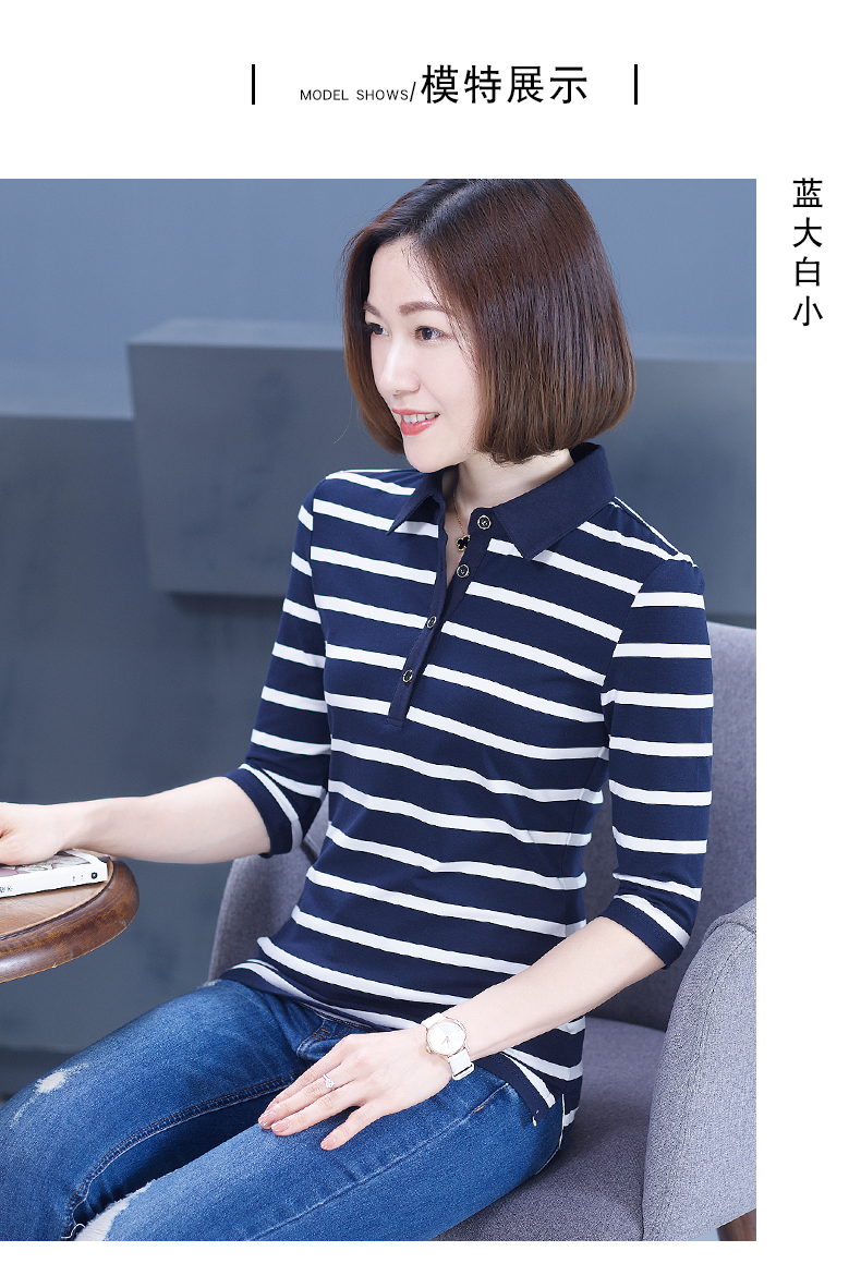 2019秋季女裝襯衫領條紋七分袖翻領半截袖體恤中袖打底衫t恤上衣1入