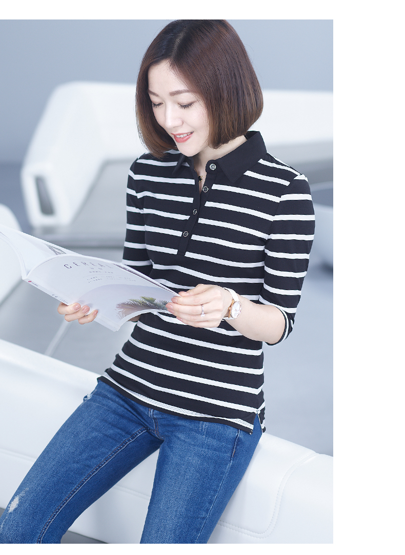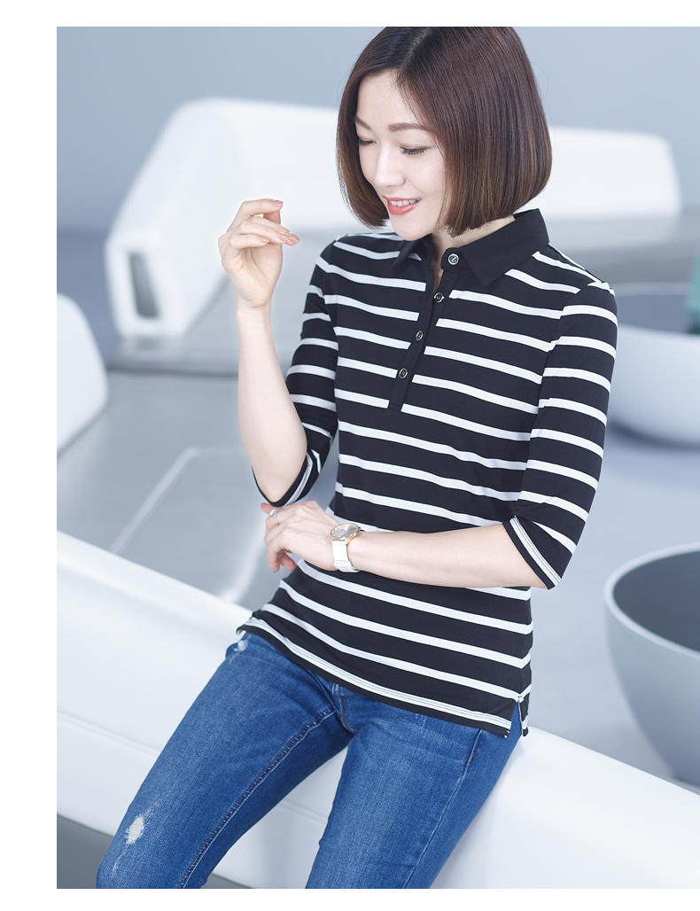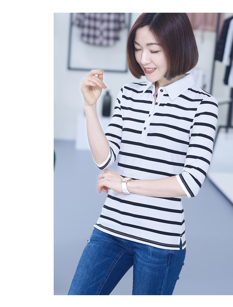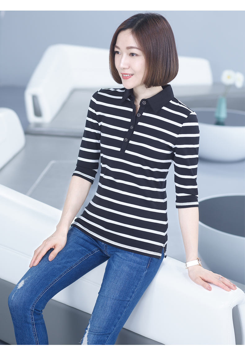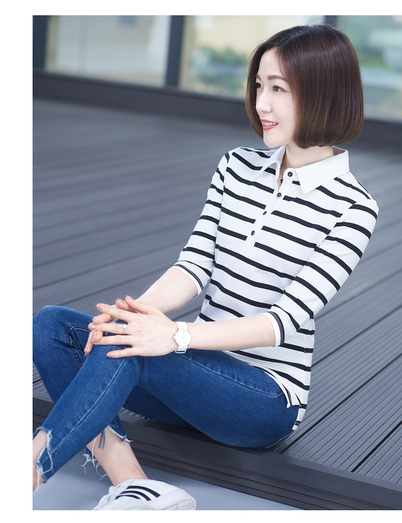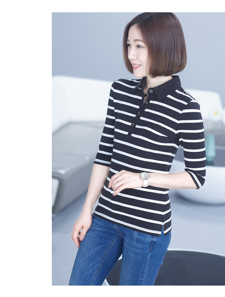2019秋季女裝襯衫領條紋七分袖翻領半截袖體恤中袖打底衫t恤上衣1入