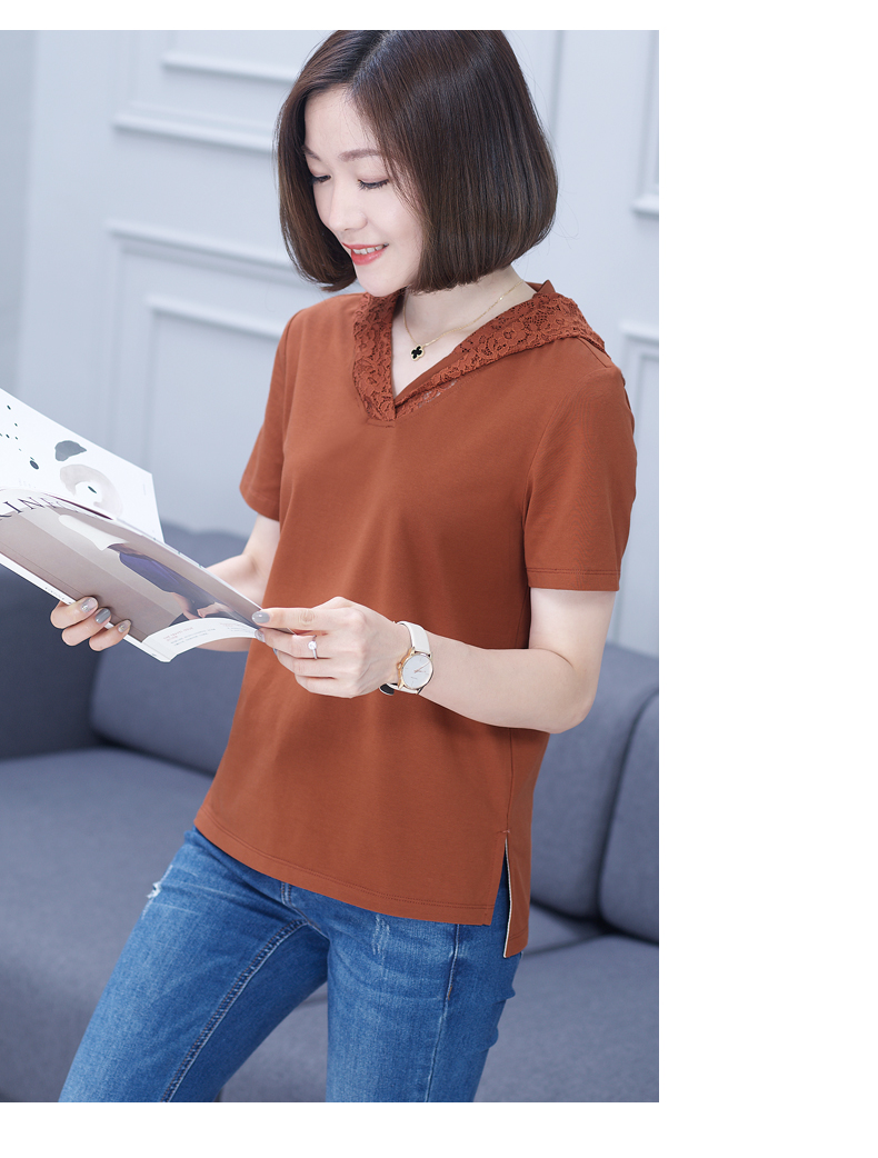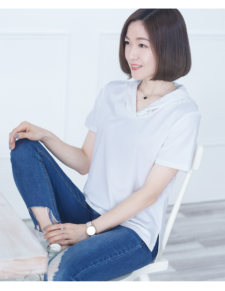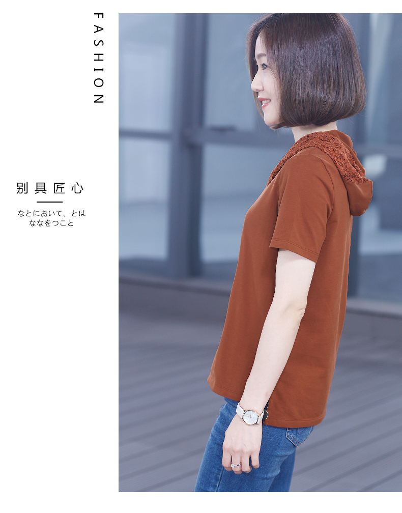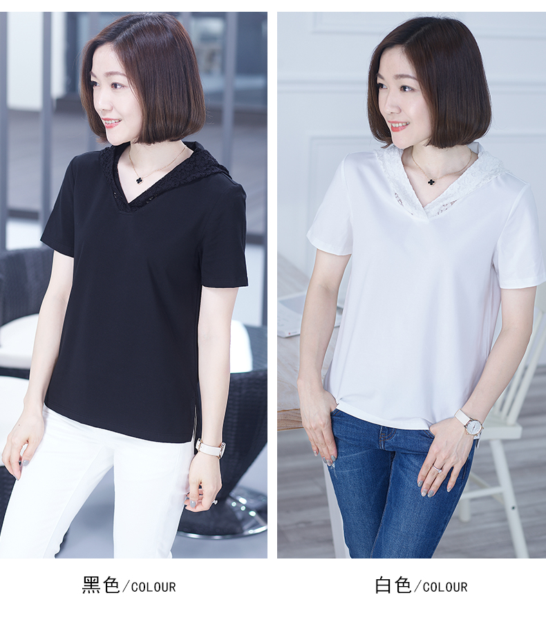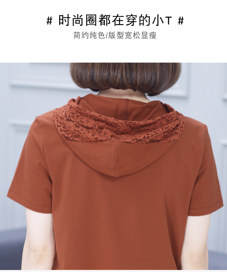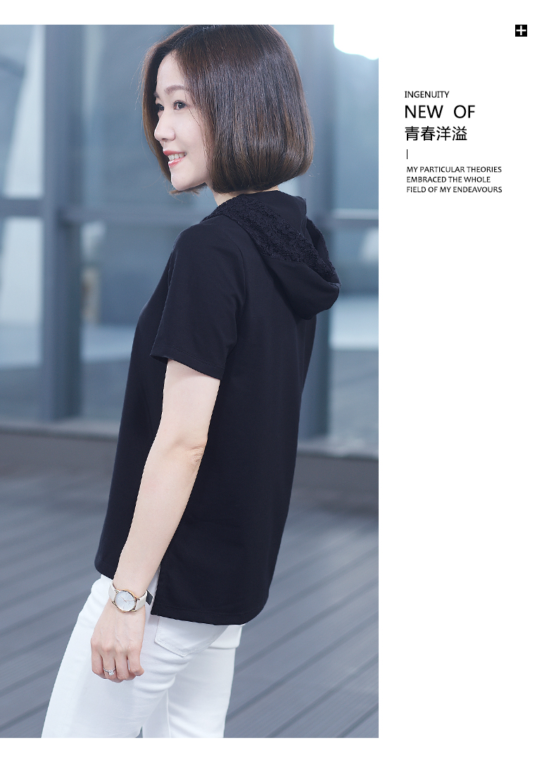 2019新款短袖t恤女寬松夏季蕾絲白色上衣服黑色連帽半袖體恤打底1入