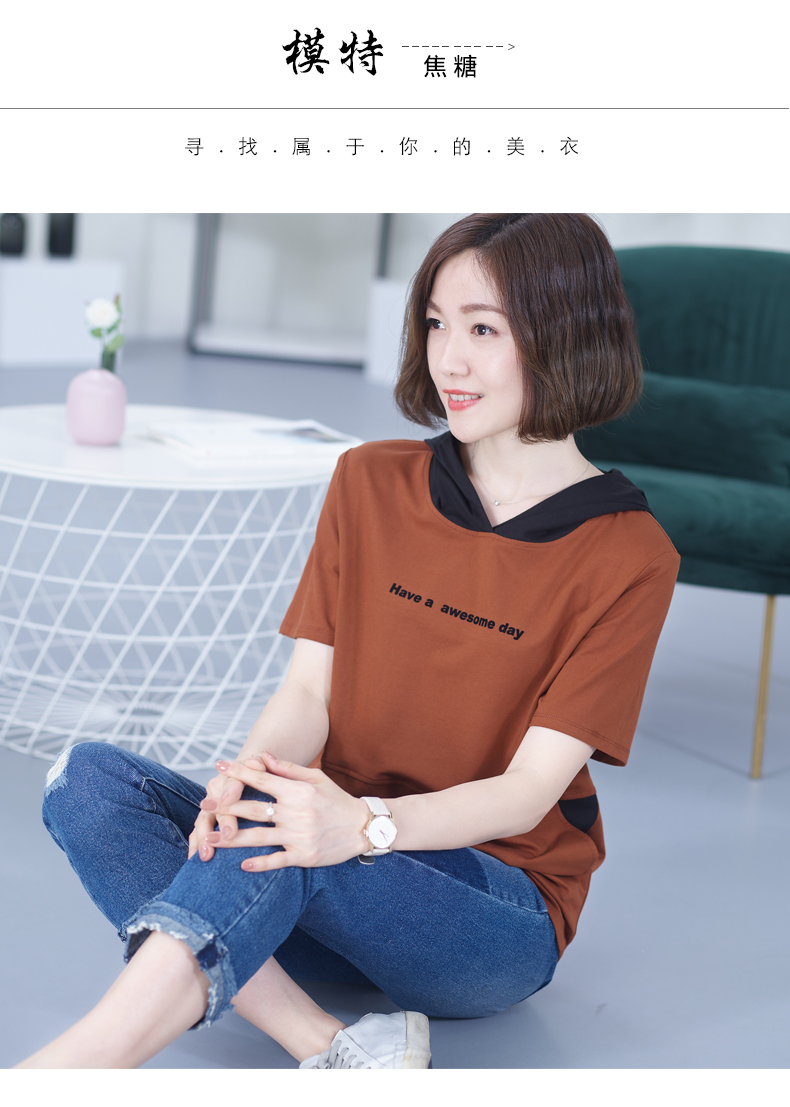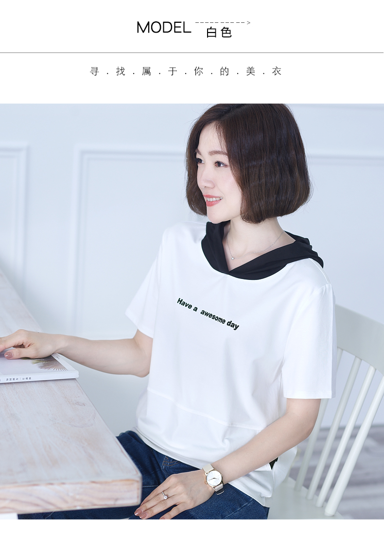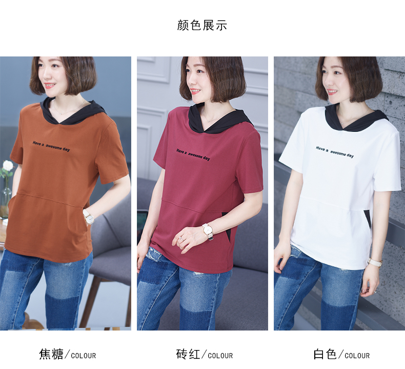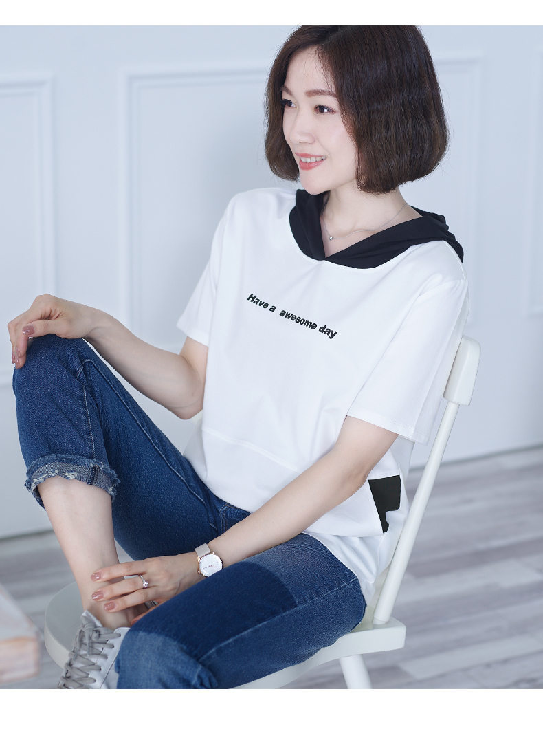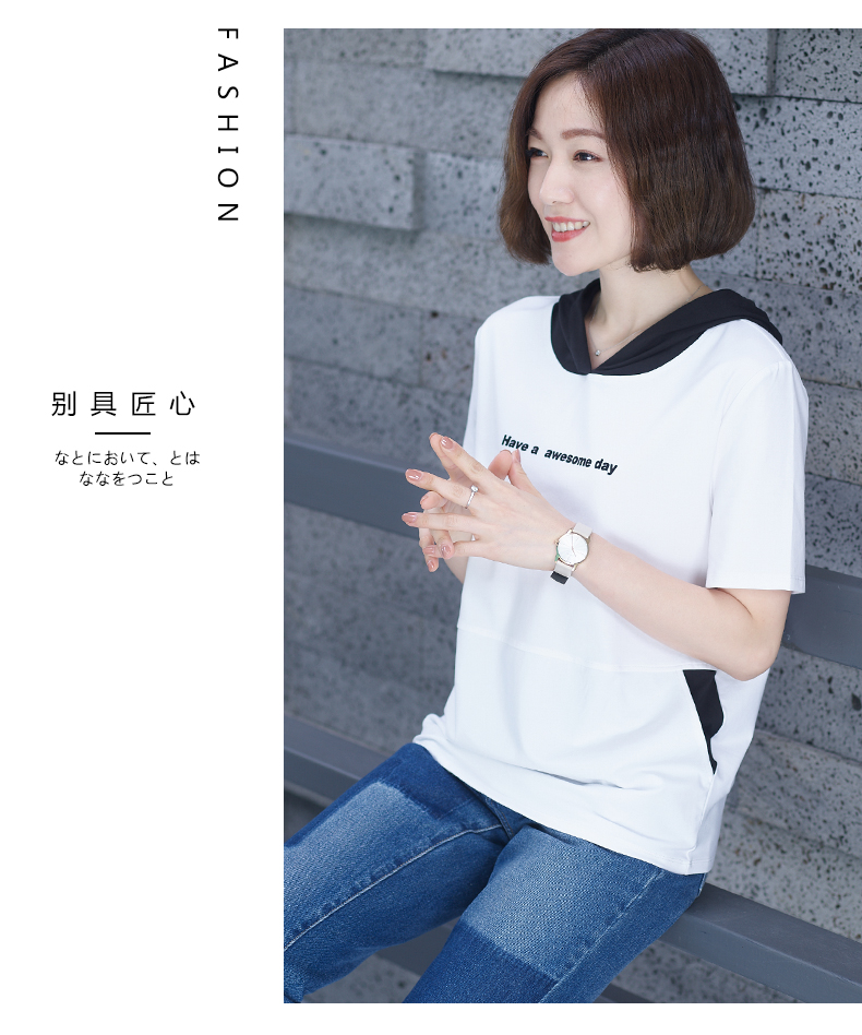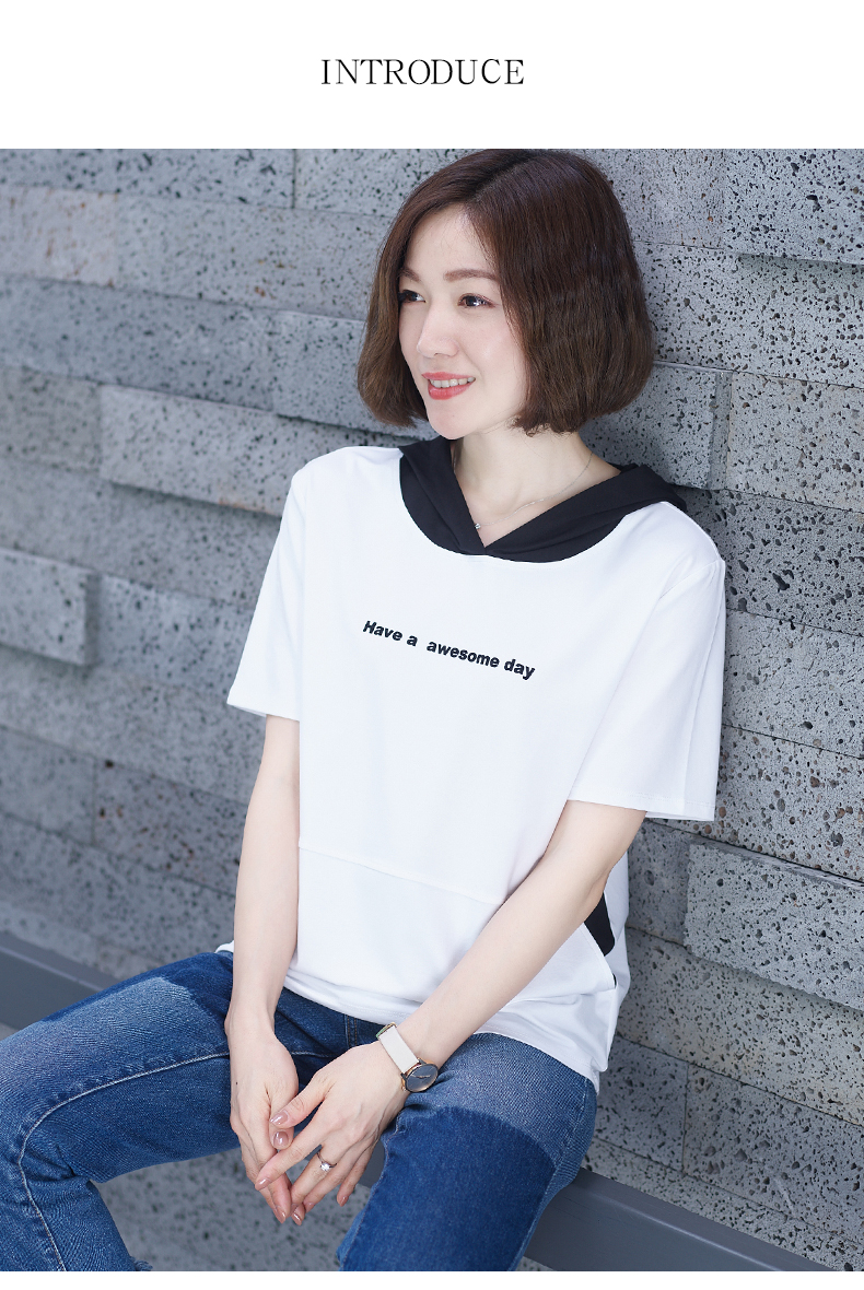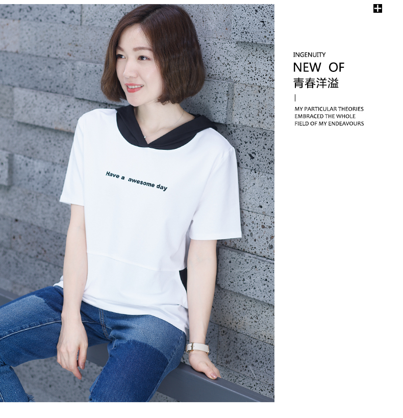 連帽短袖t恤女士2019夏裝新款寬松白色半袖字母印花上衣服打底衫1入