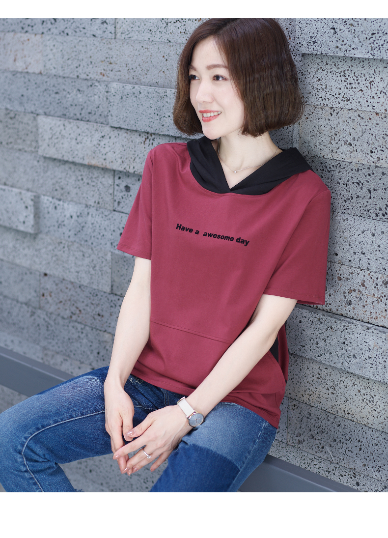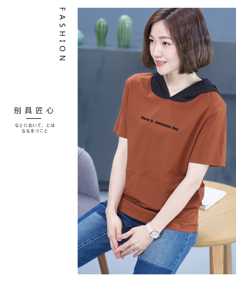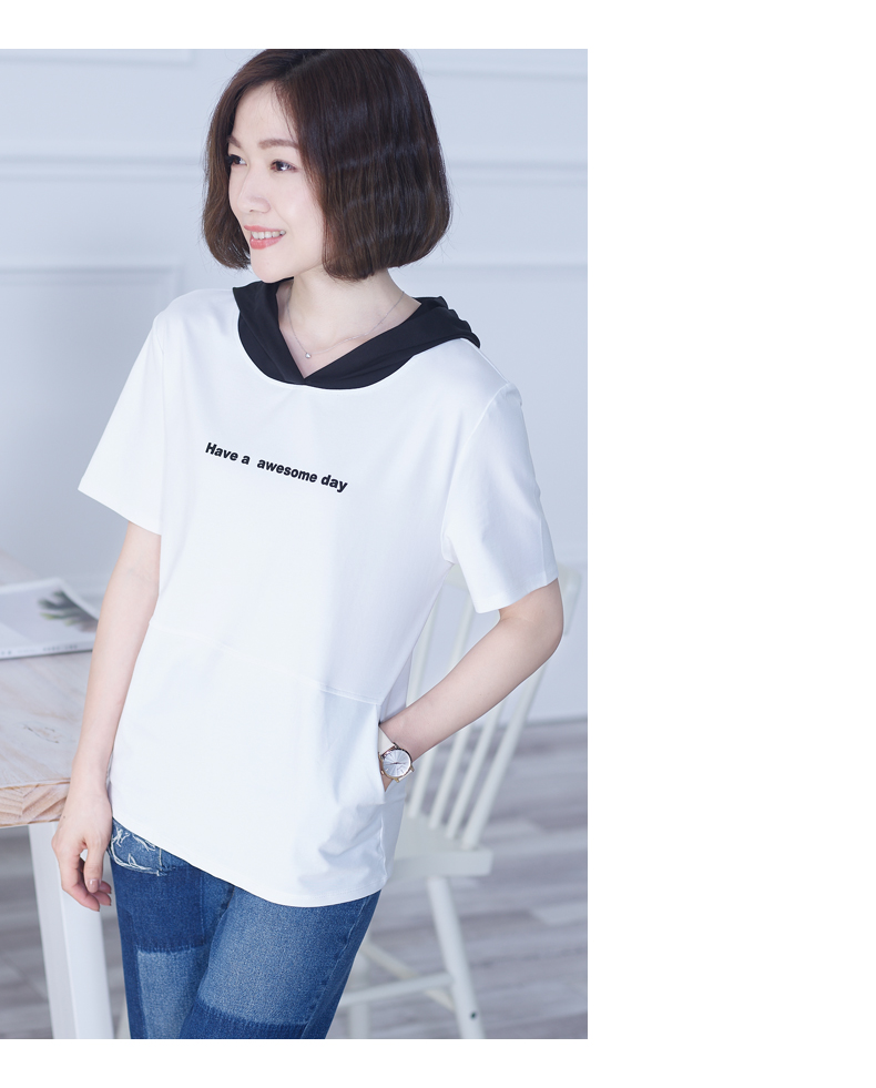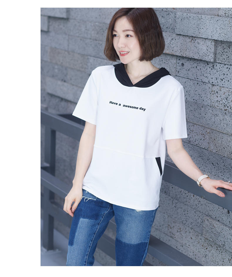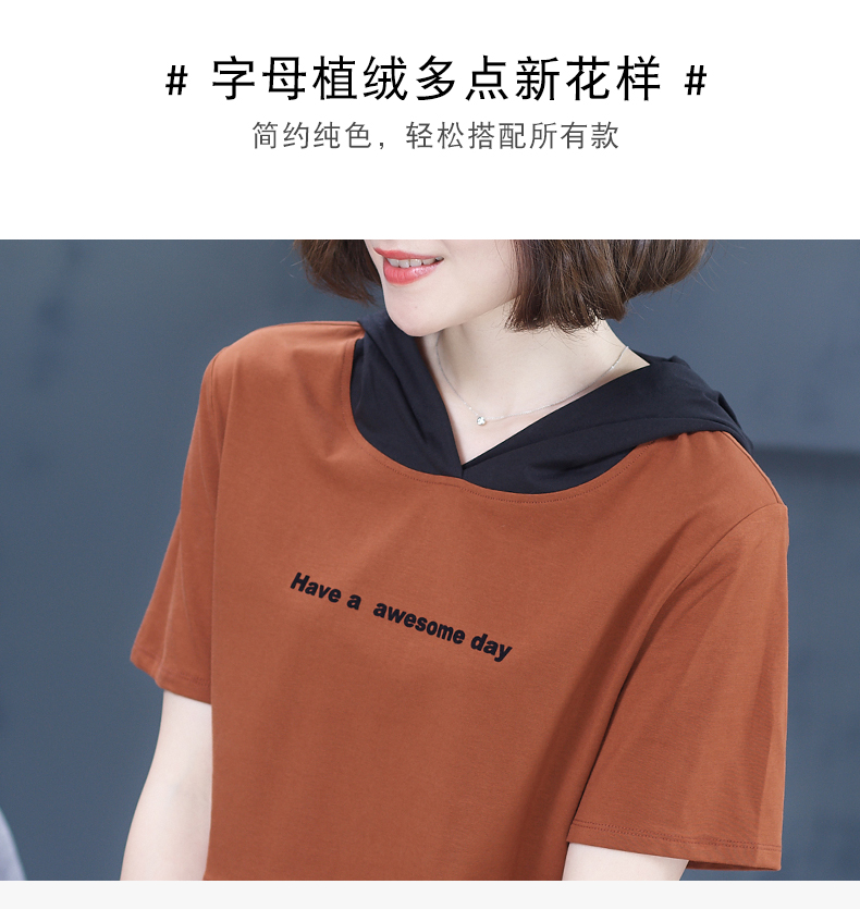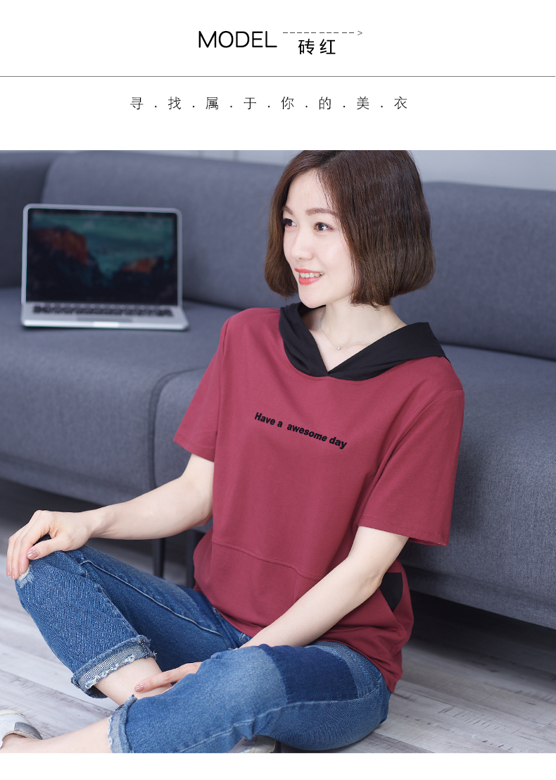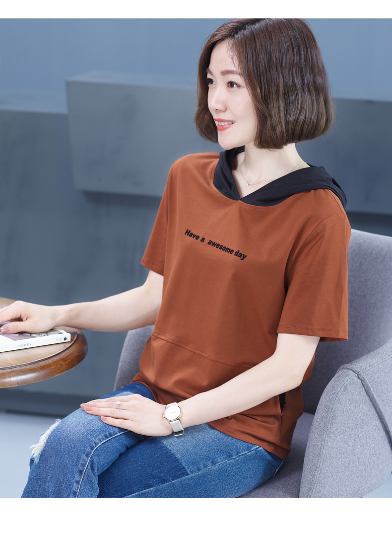連帽短袖t恤女士2019夏裝新款寬松白色半袖字母印花上衣服打底衫1入