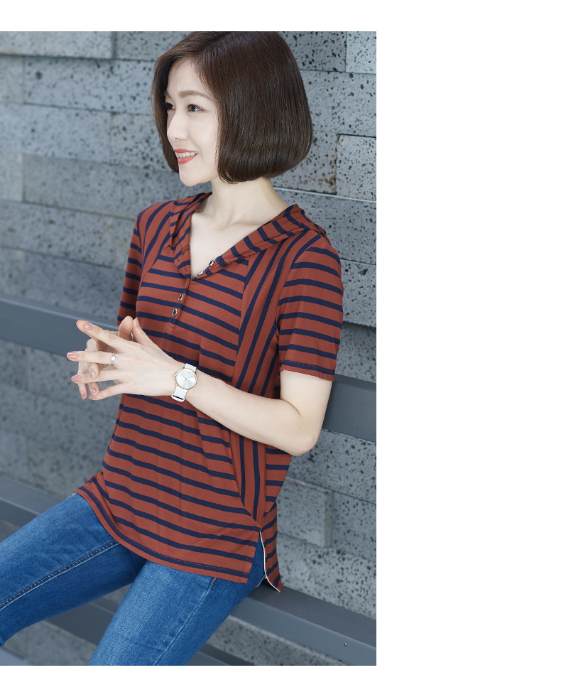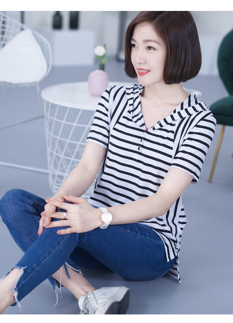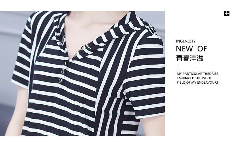 2019夏裝新款短袖寬松連帽條紋t恤女士韓版半袖上衣小衫帶帽體恤1入