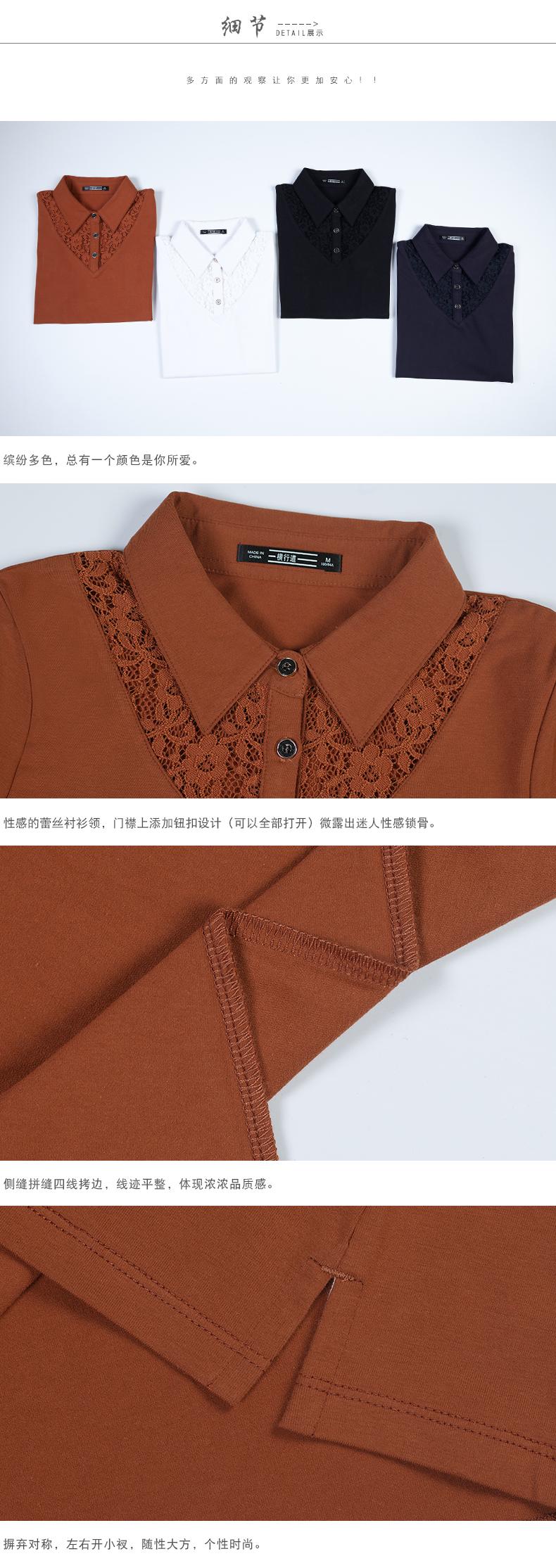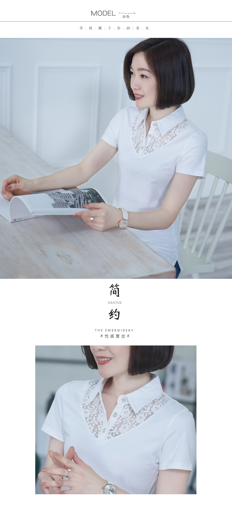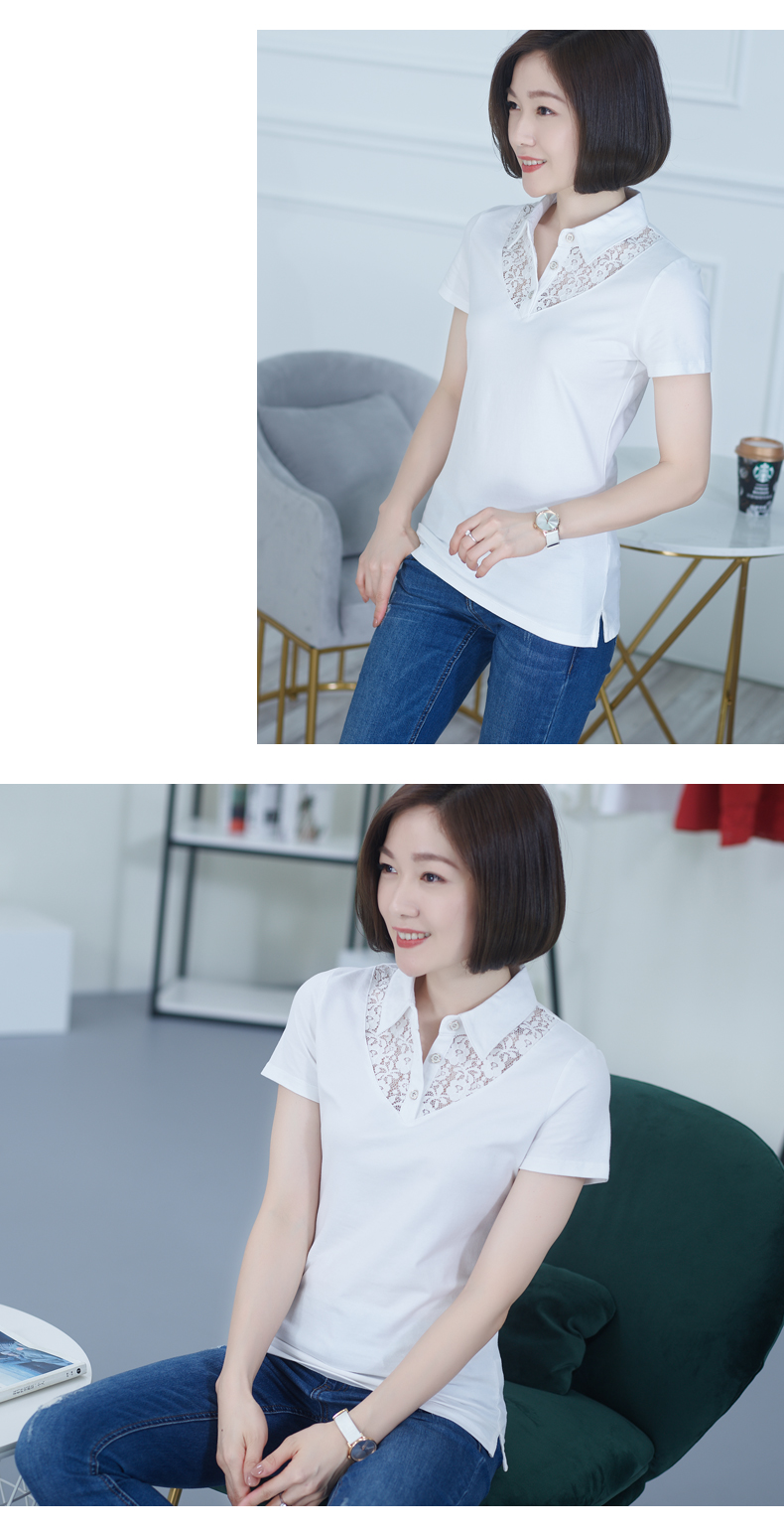2019夏裝新款蕾絲翻領黑色上衣短袖t恤女士有領白色半袖韓版體恤1入