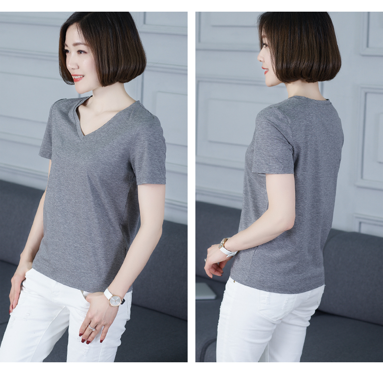 2019夏裝新款大碼女裝v領短袖純色打底衫韓版簡約寬松半袖上衣t恤1入