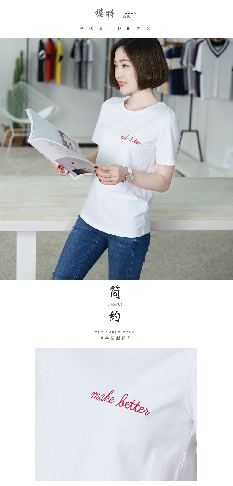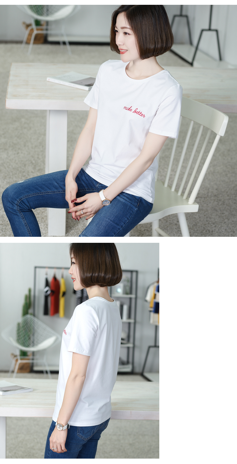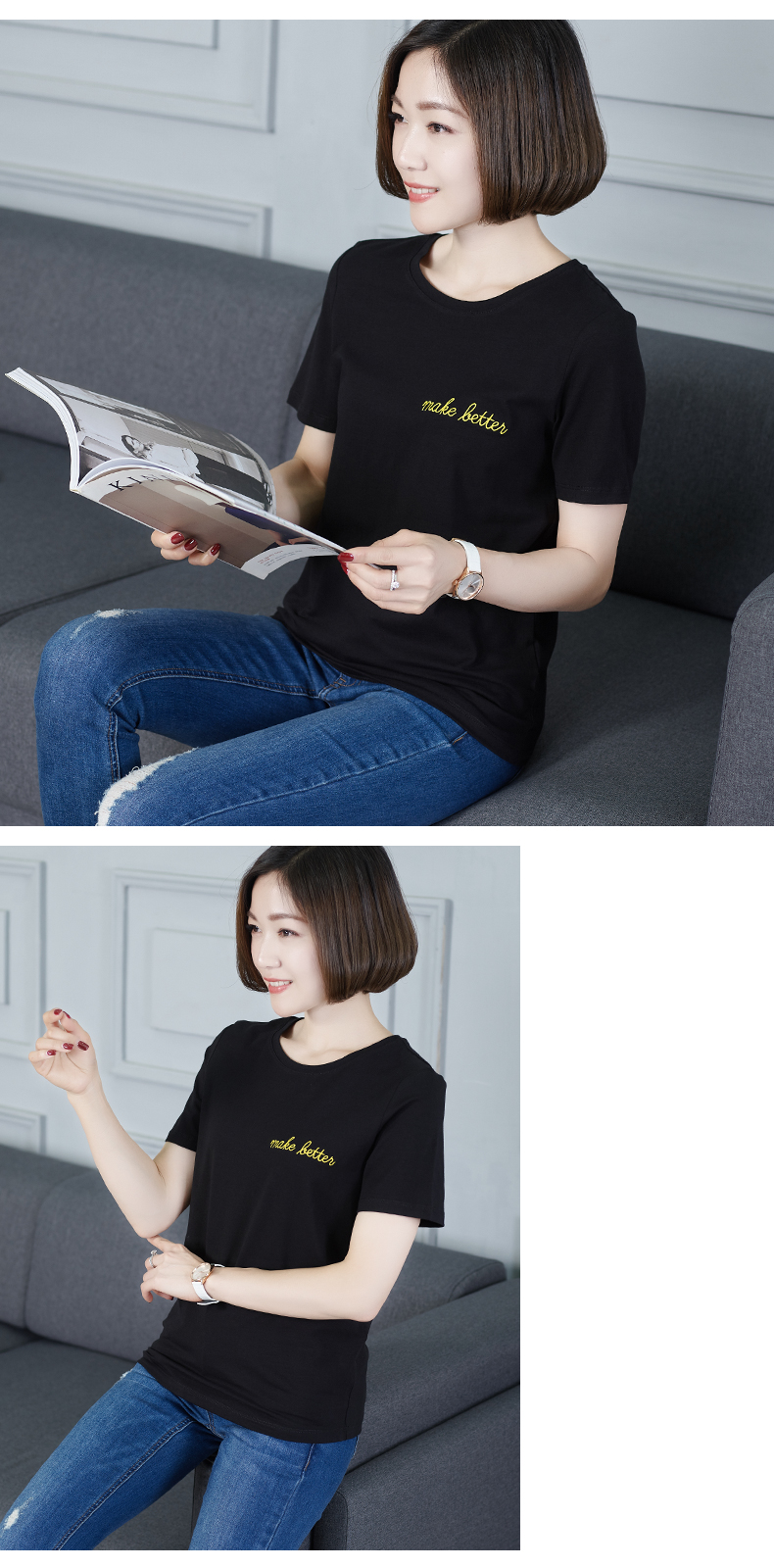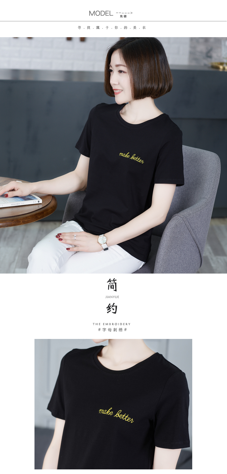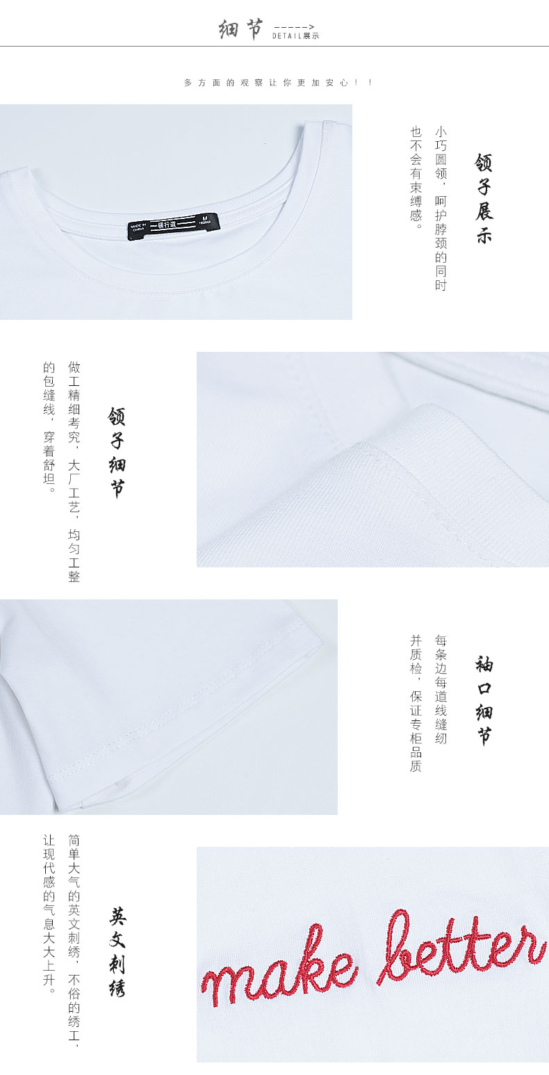 2019夏裝短袖t恤女裝韓版短袖字母刺繡上衣服白色寬松純色打底衫1入