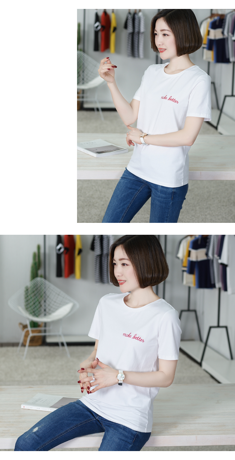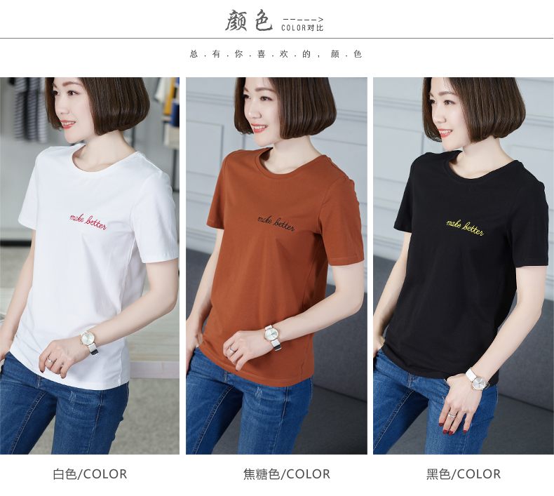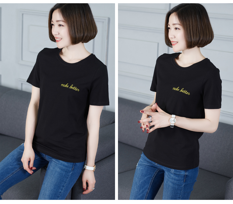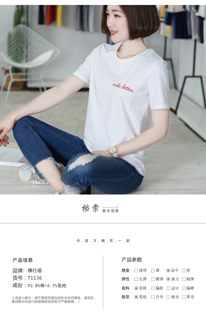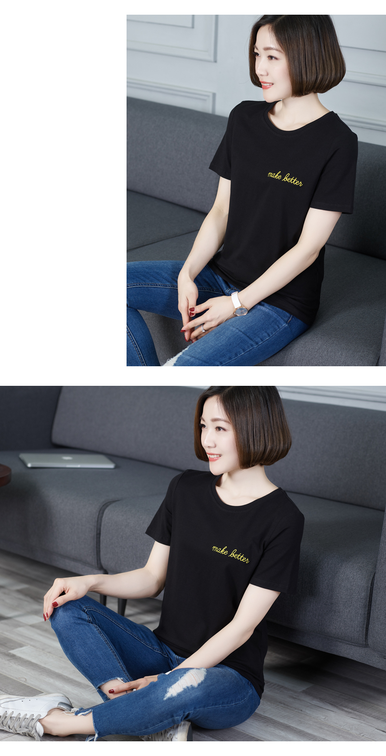 2019夏裝短袖t恤女裝韓版短袖字母刺繡上衣服白色寬松純色打底衫1入