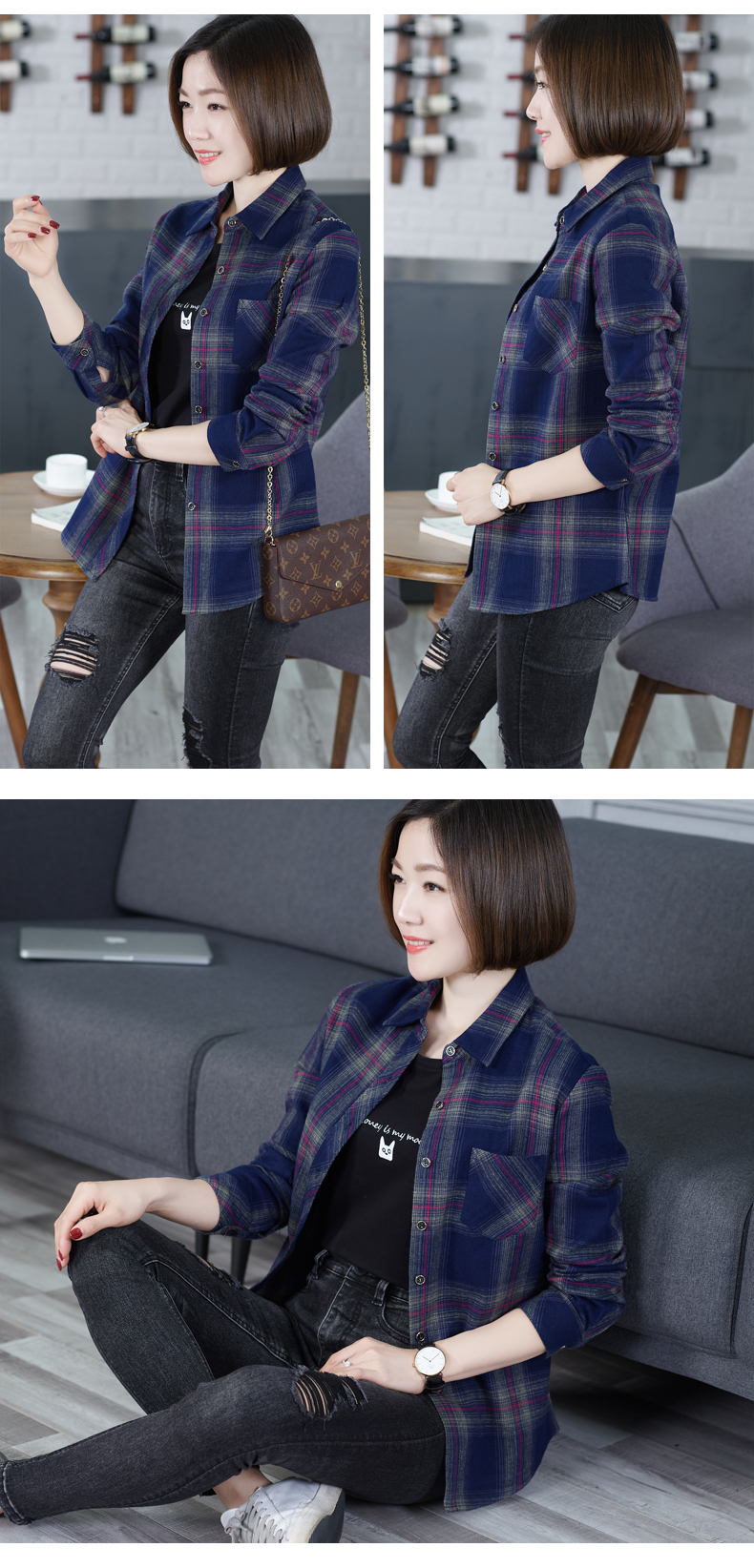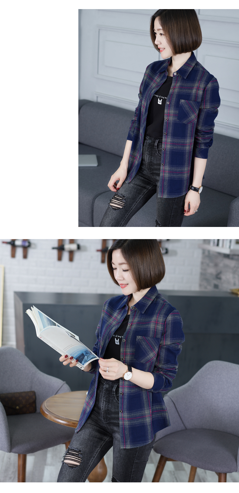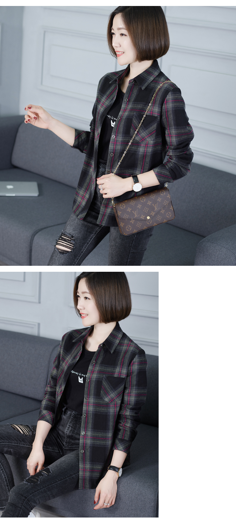 2019新款秋裝上衣服純棉寬松方領韓版格子襯衫女長袖大碼襯衣外套1入
