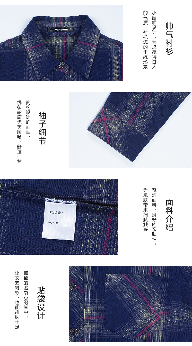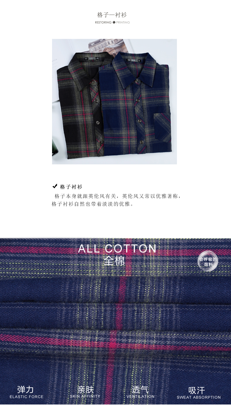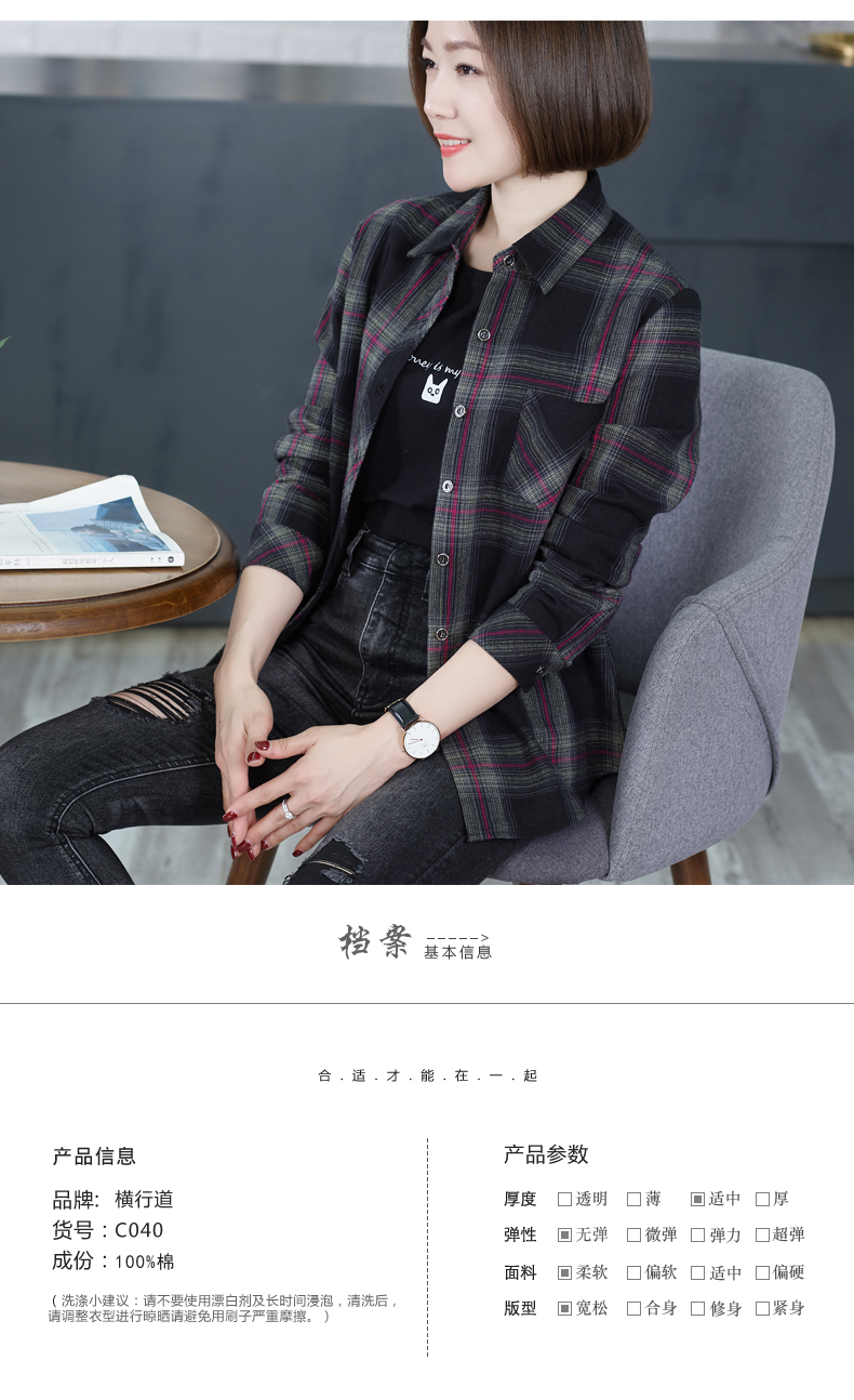 2019新款秋裝上衣服純棉寬松方領韓版格子襯衫女長袖大碼襯衣外套1入