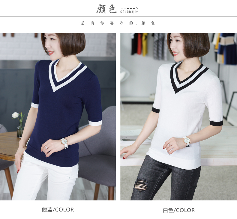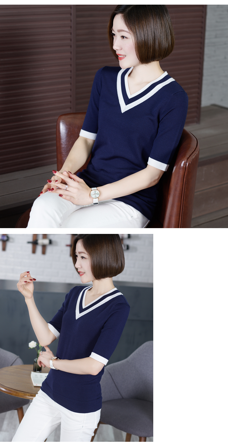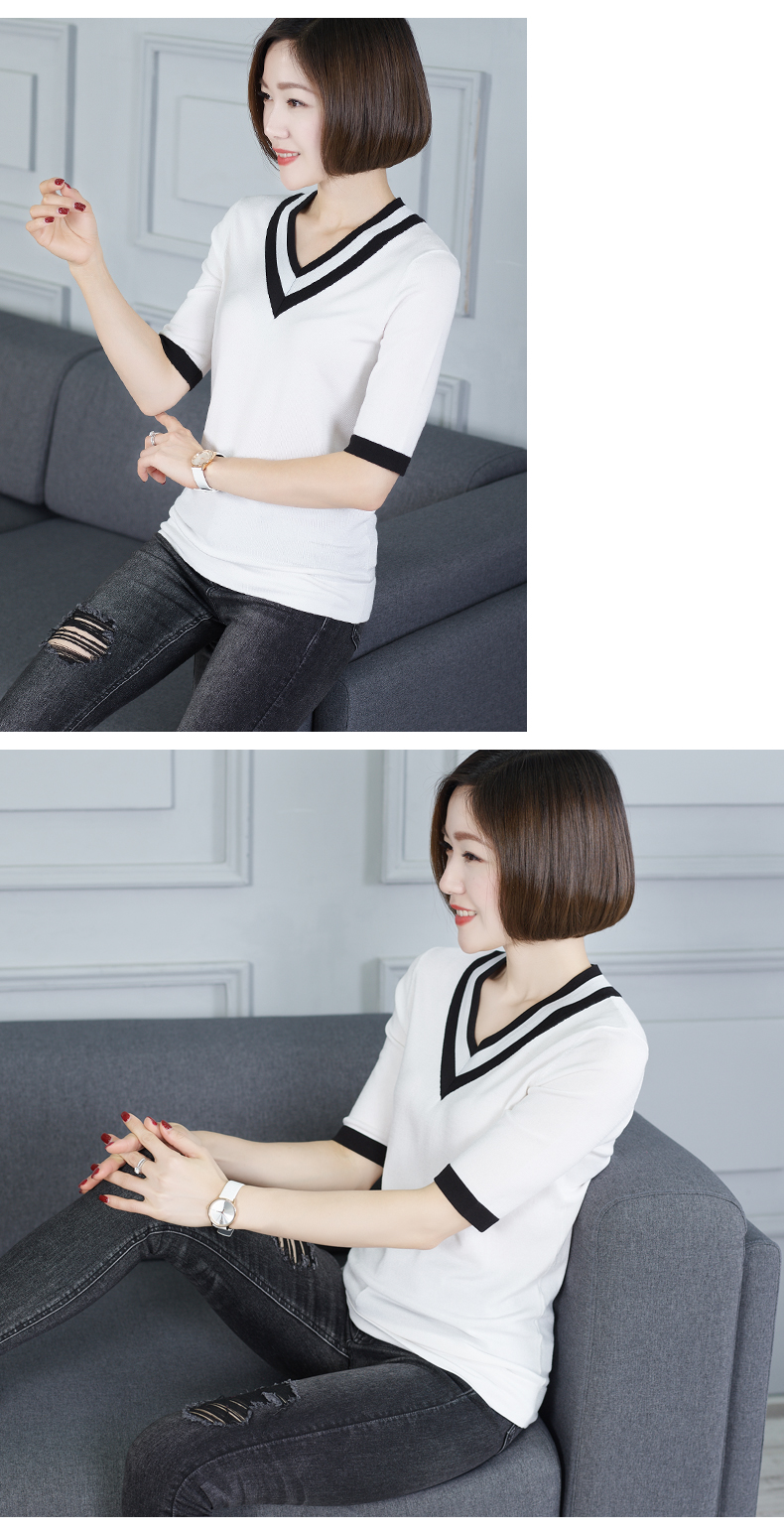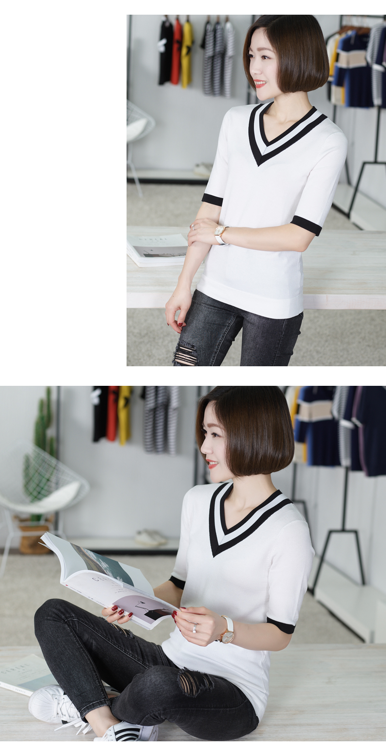 2019秋裝新款洋氣打底衫撞色V領中袖針織衫半截袖上衣服純色女裝1入