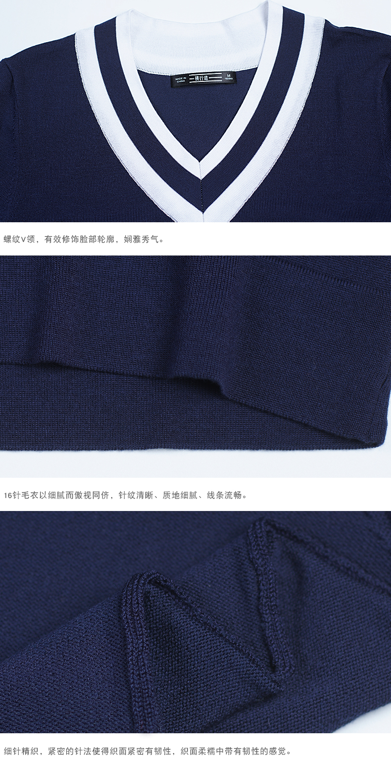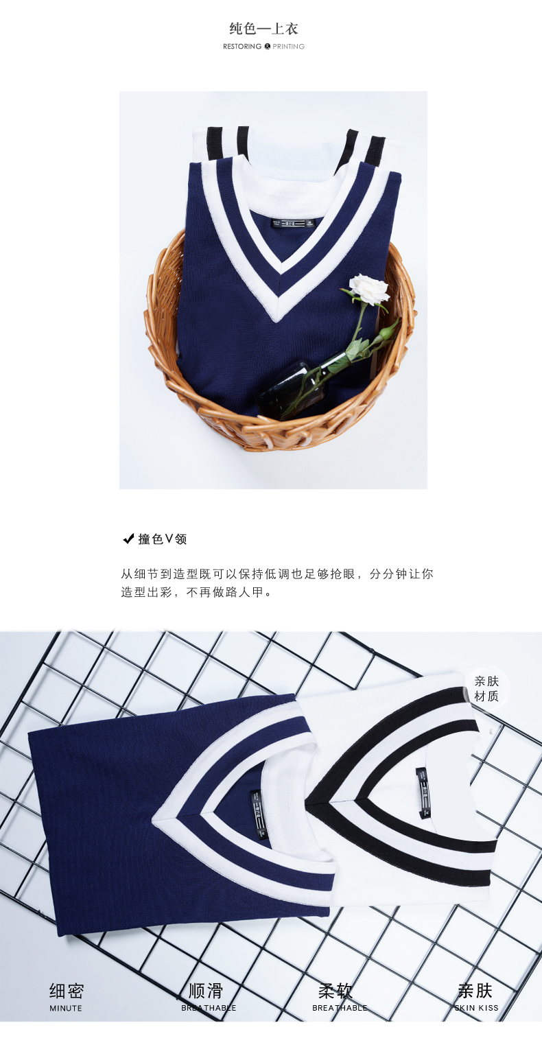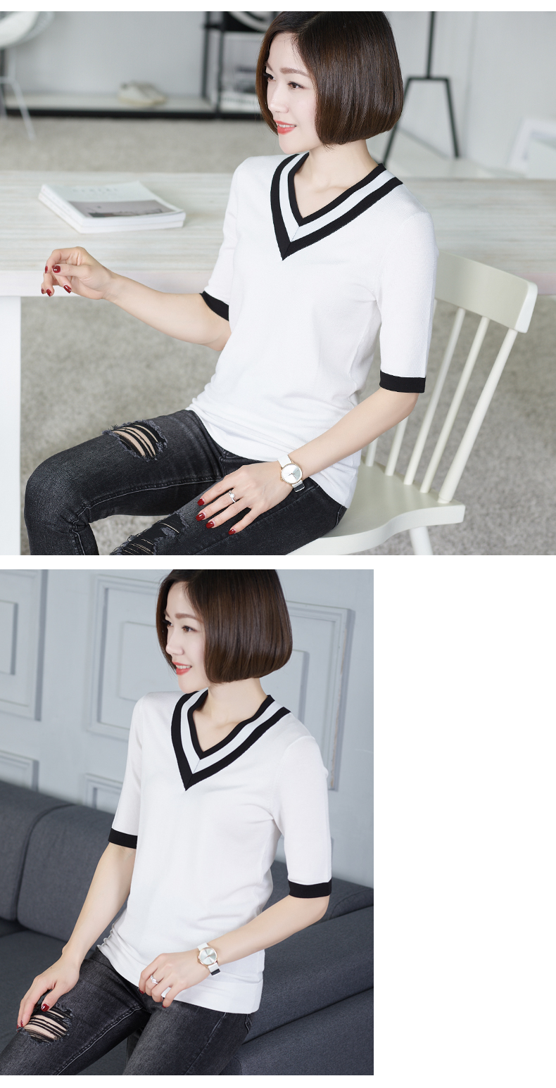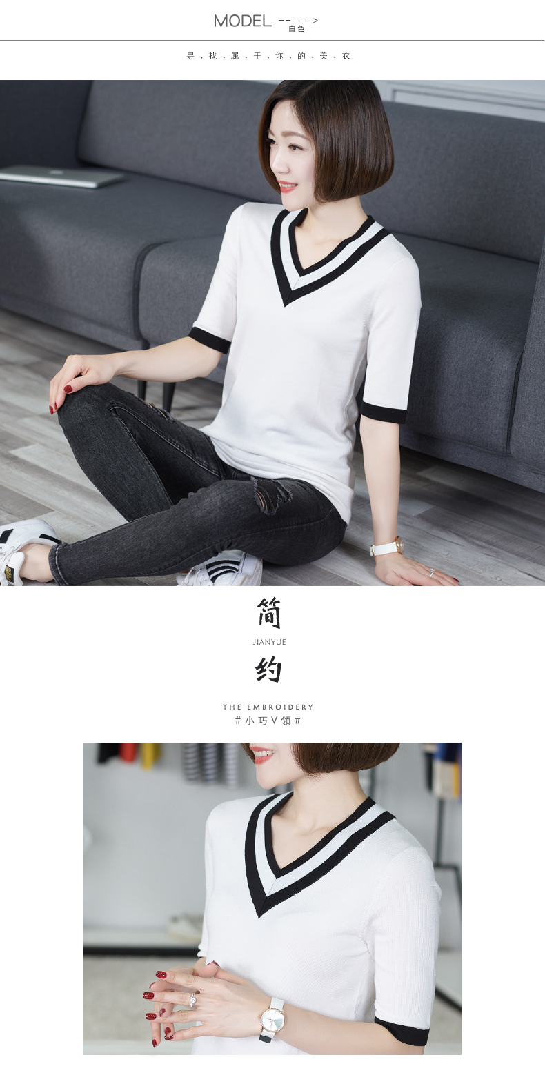 2019秋裝新款洋氣打底衫撞色V領中袖針織衫半截袖上衣服純色女裝1入