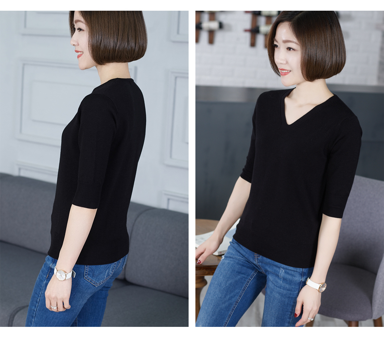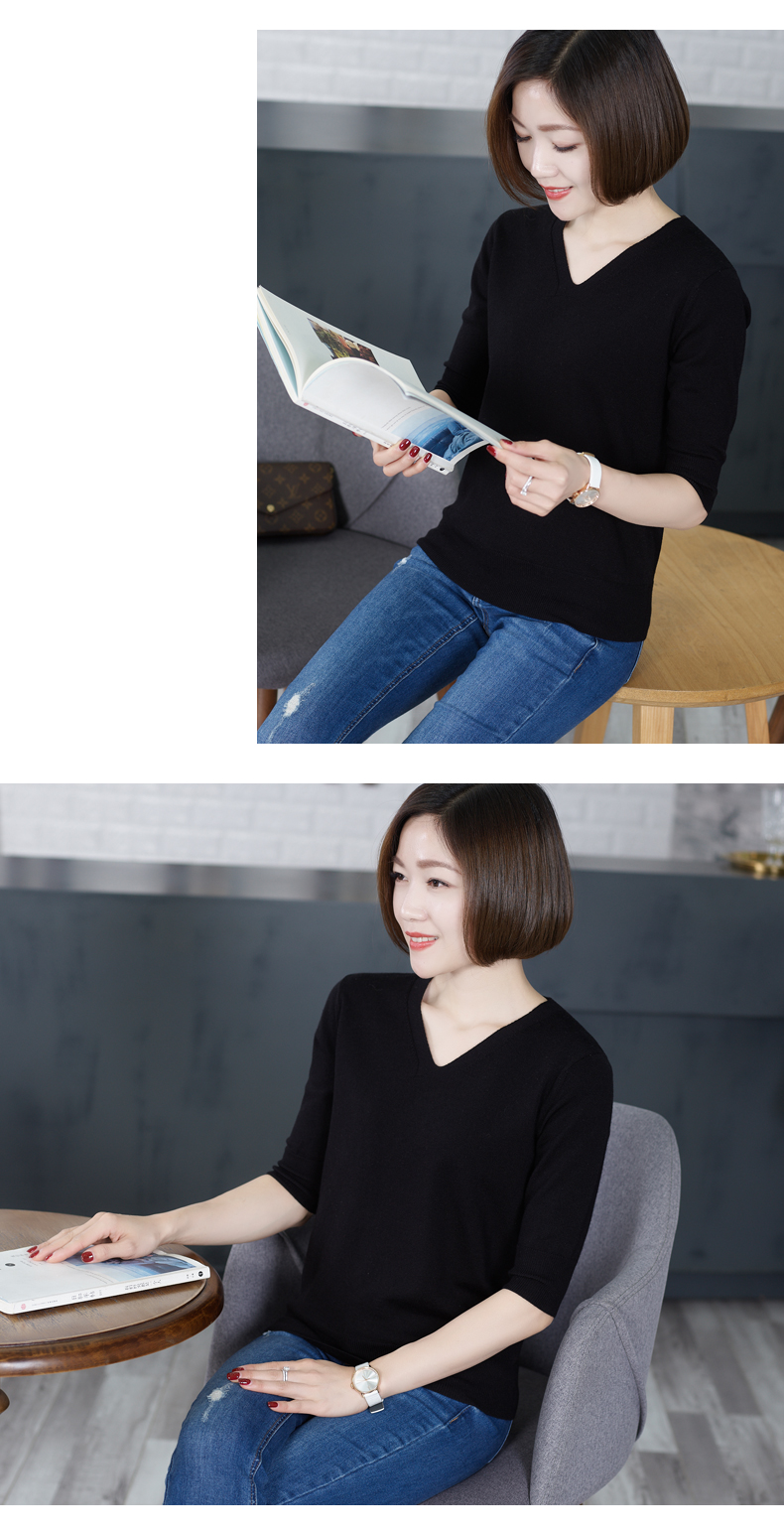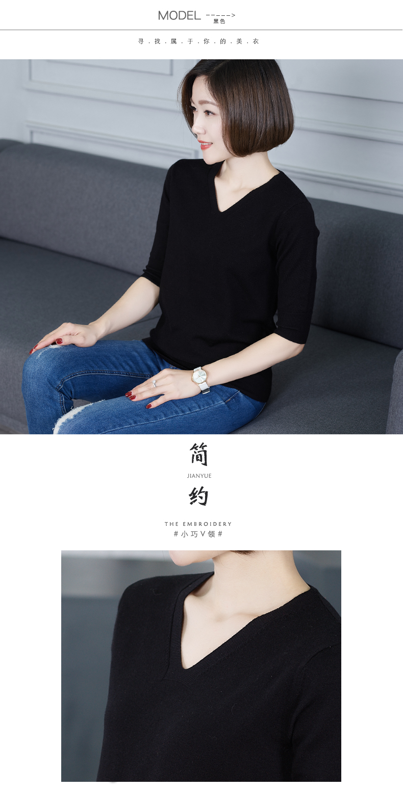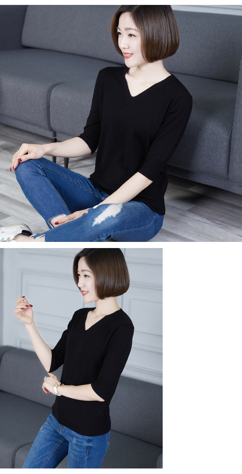 2019秋季新款韓版女裝V領中袖純色打底衫寬松羊毛衣針織衫七分袖1入